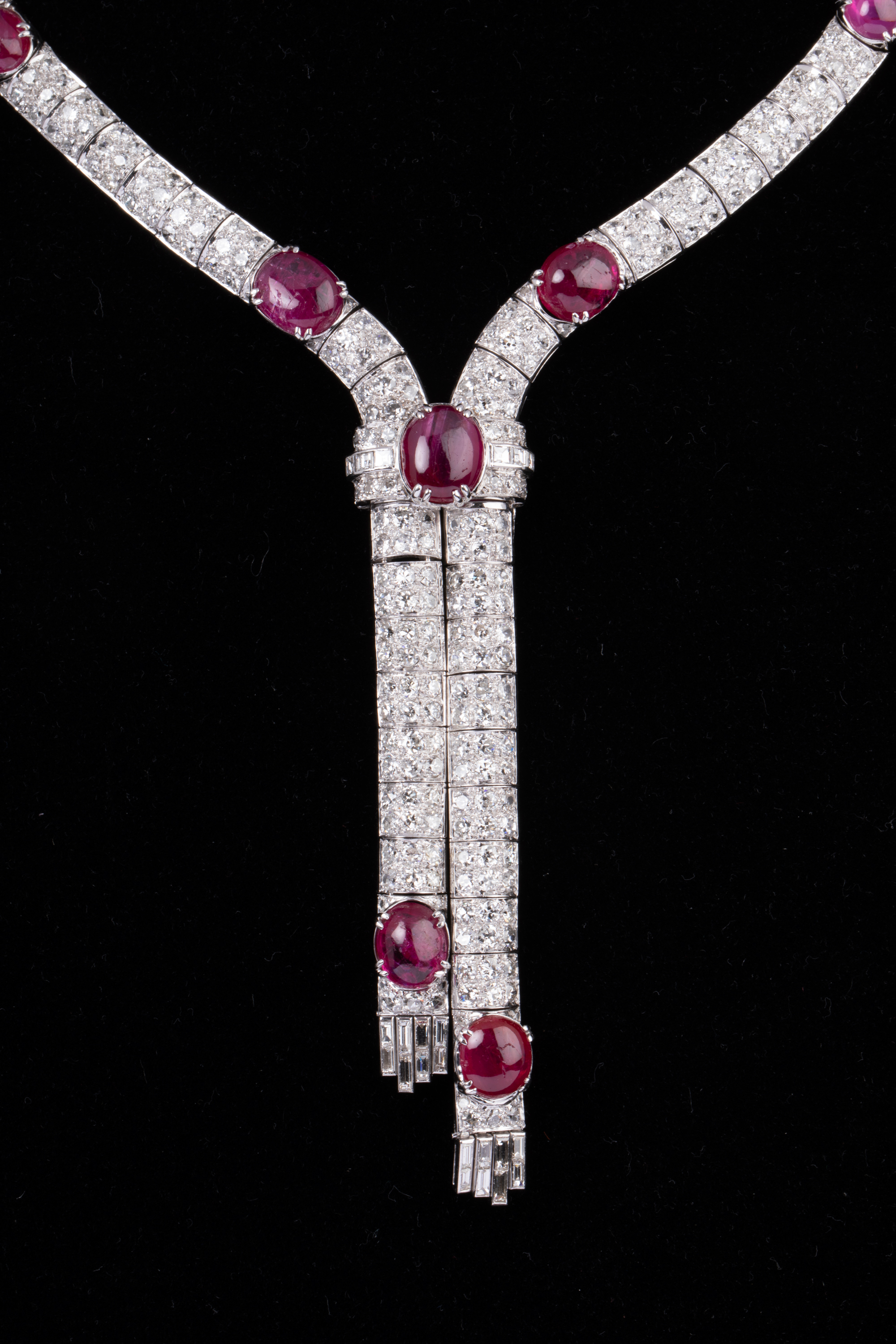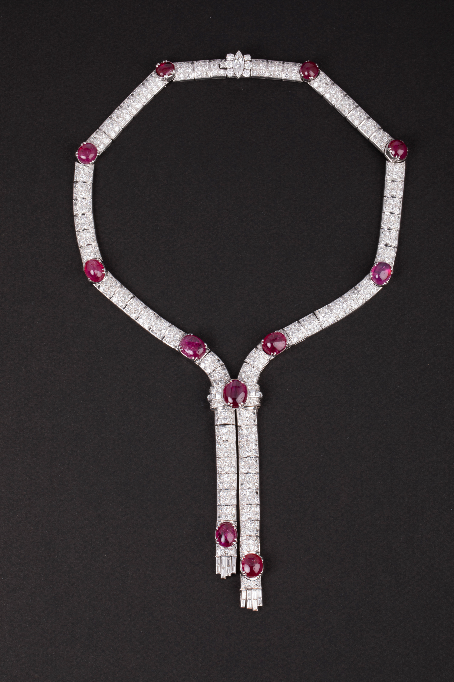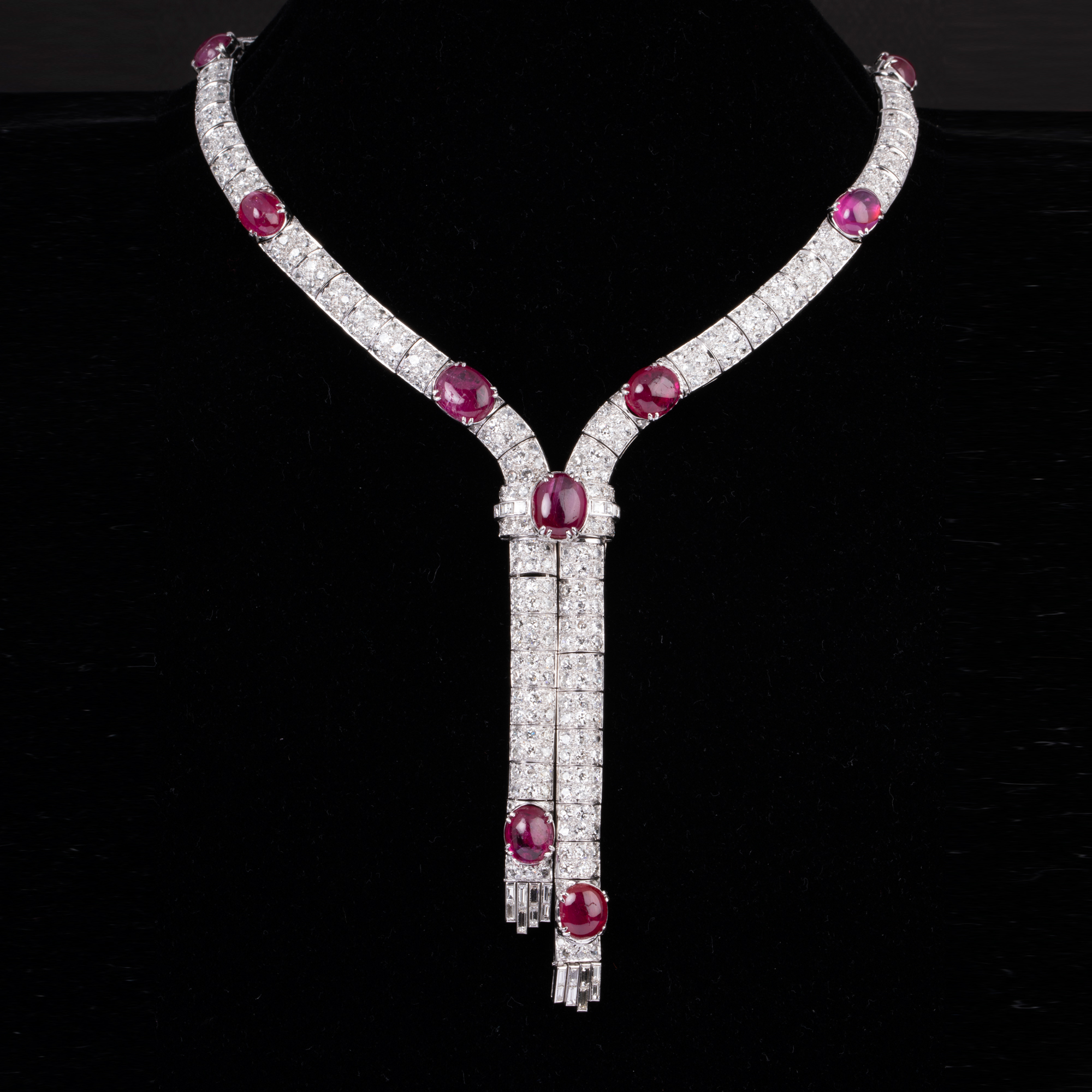 独角鹿西洋古董珠宝首饰法国铂金镶缅甸无烧红宝石钻石领带式项链