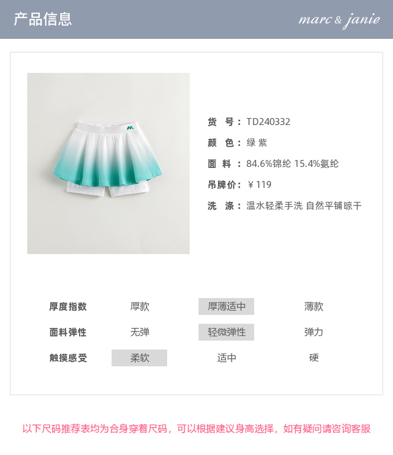 【凉感防晒】马克珍妮女童渐变运动短裙半身裙儿童裙子夏装240332