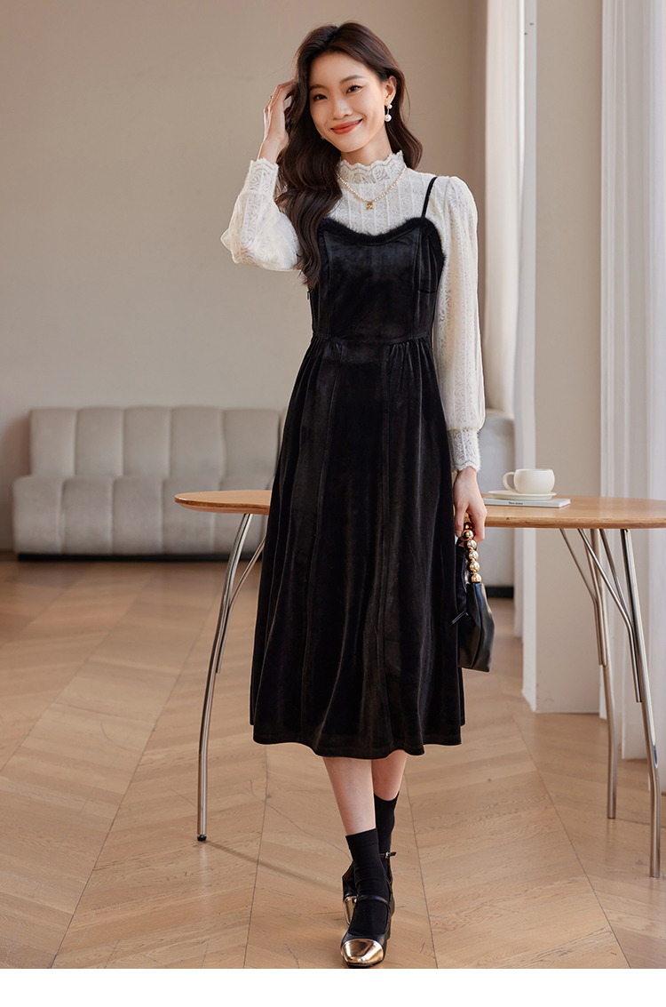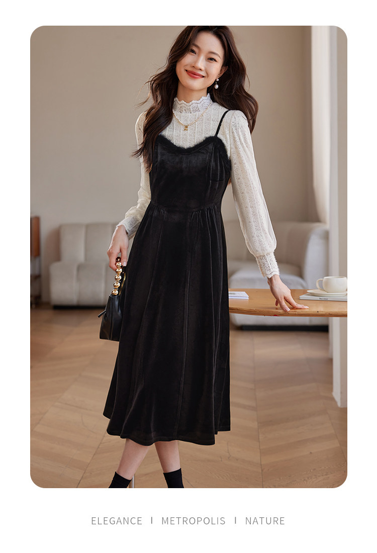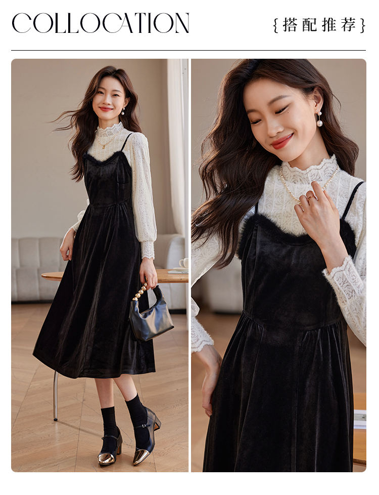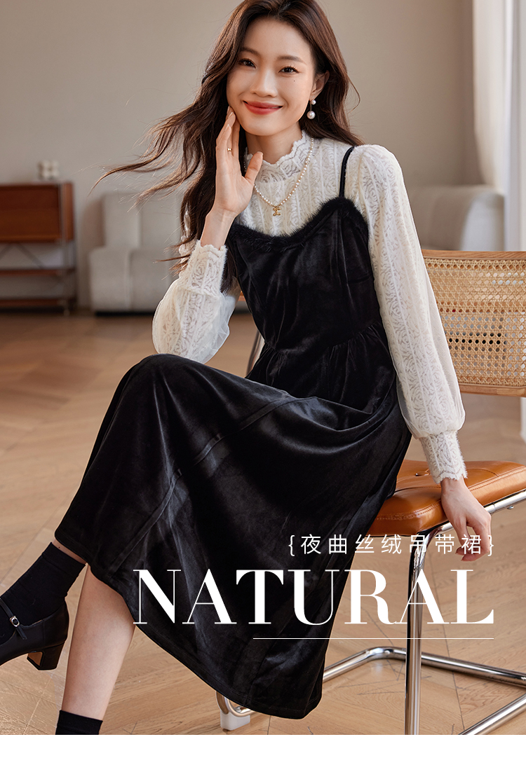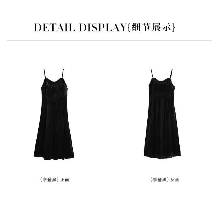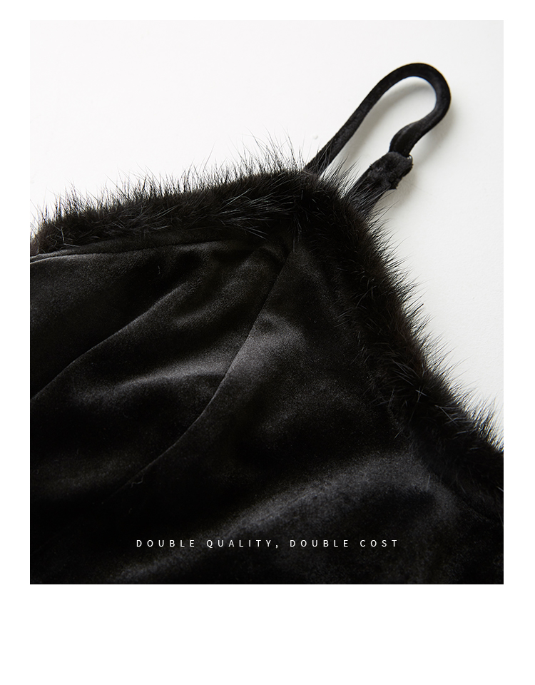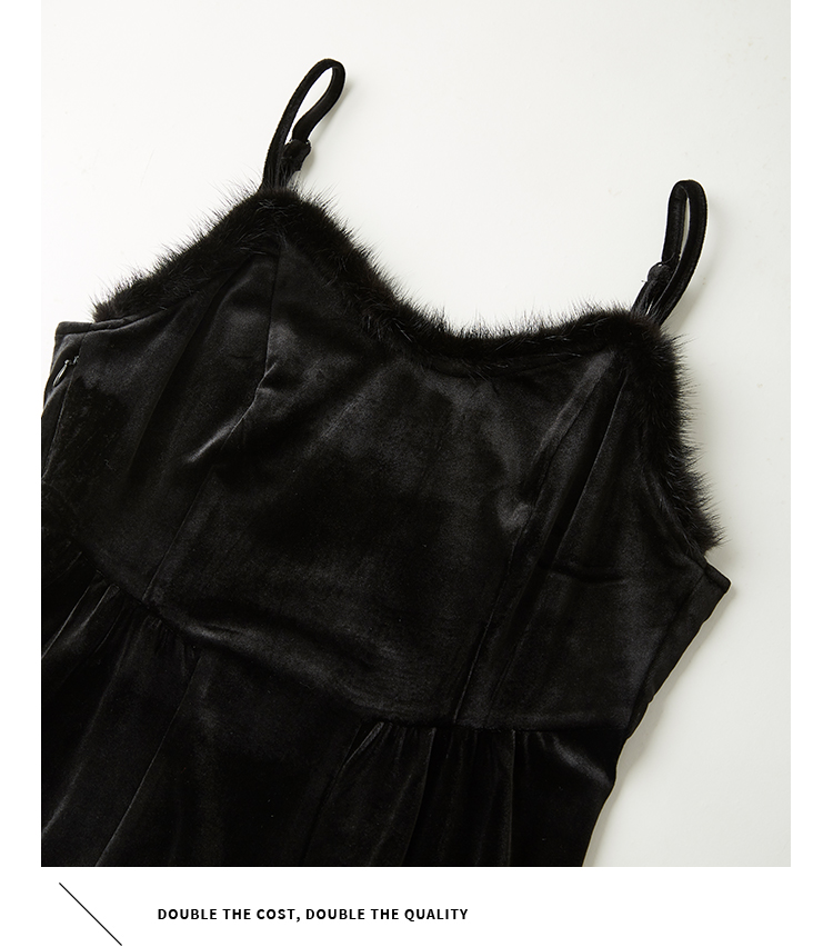 【年终特卖】熙世界高端金丝绒吊带连衣裙女秋冬季水貂毛V领无袖收腰显瘦裙子