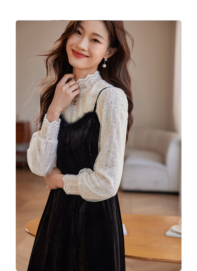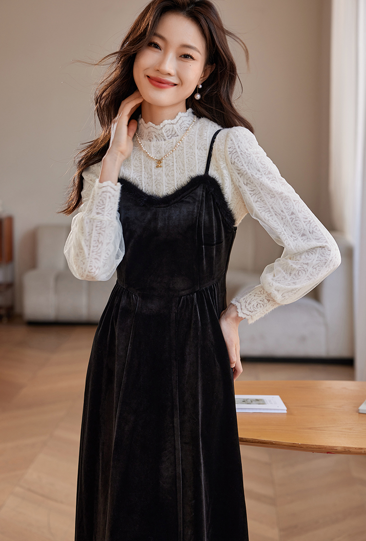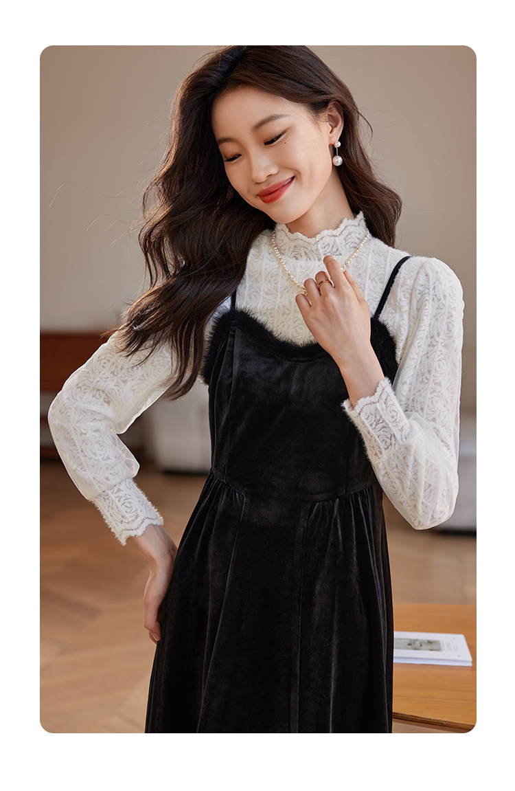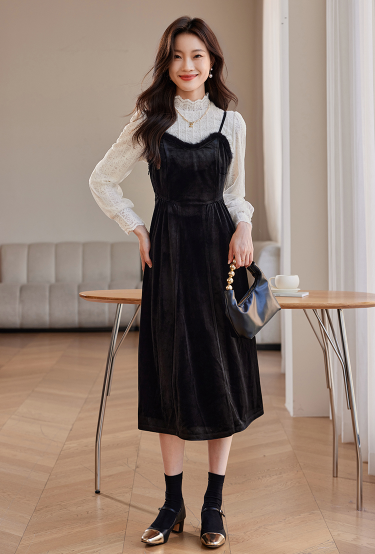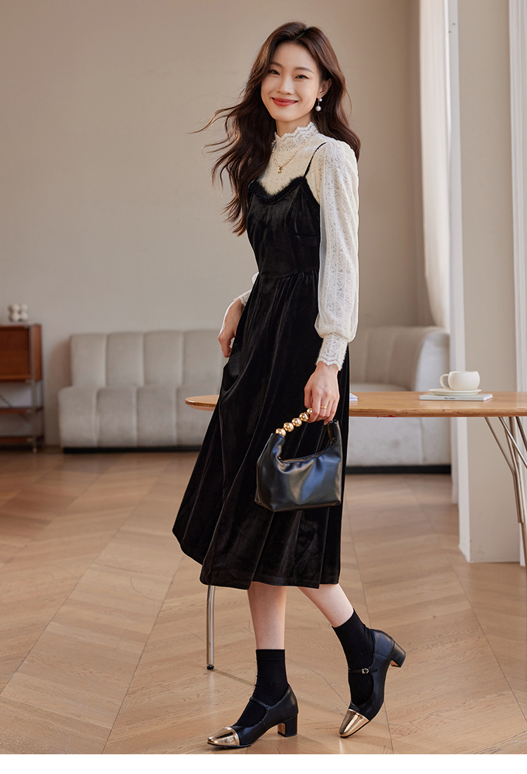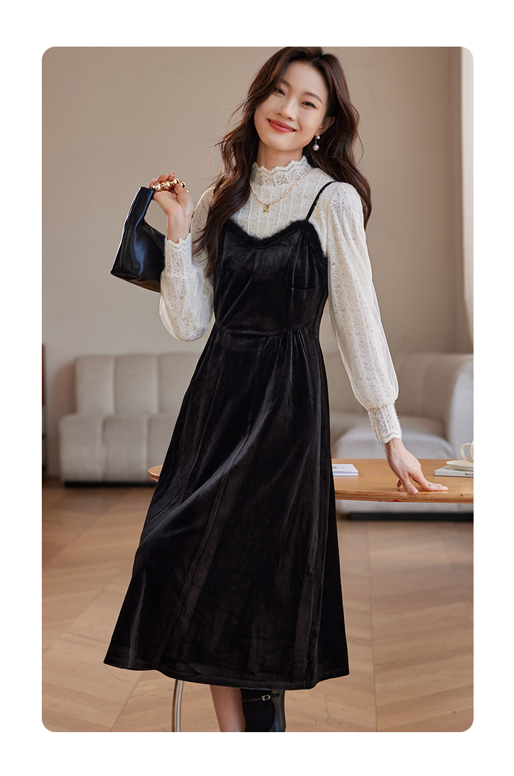 【年终特卖】熙世界高端金丝绒吊带连衣裙女秋冬季水貂毛V领无袖收腰显瘦裙子