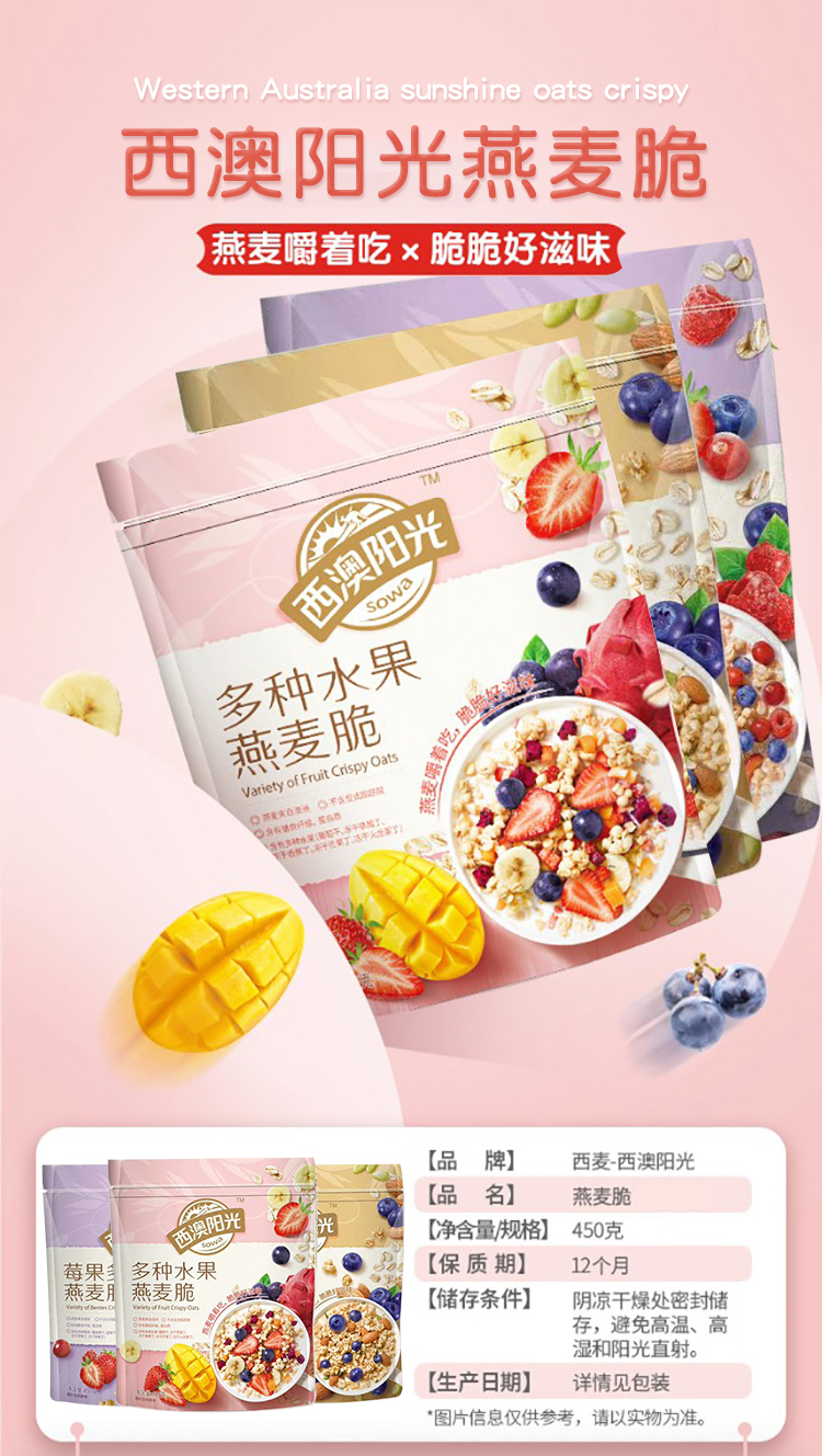 西麦西澳阳光多种水果+蓝莓坚果+莓果多多燕麦脆450g*3袋干吃燕麦