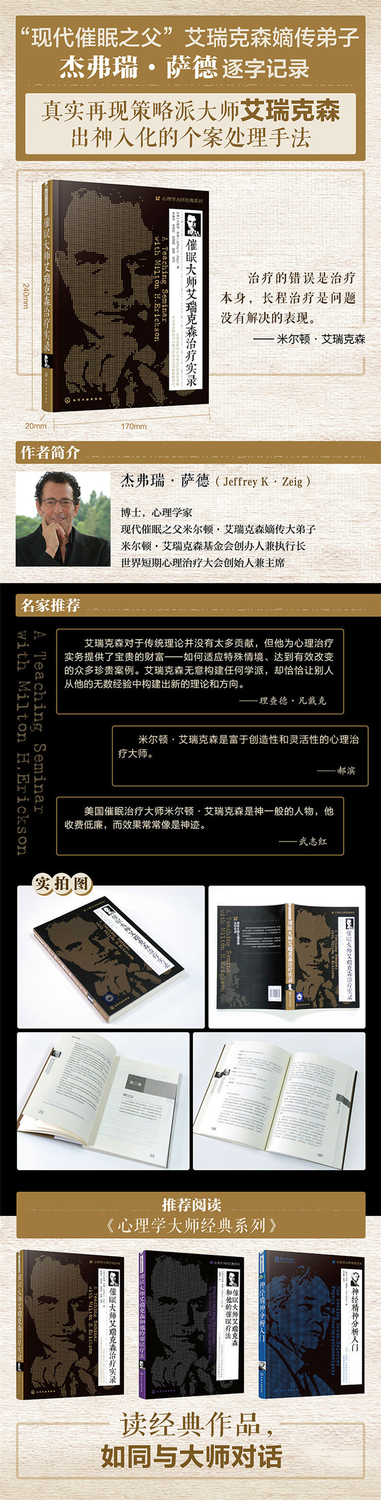 本书无意提供了解艾瑞克森的另一种方式,也不是要呈现艾瑞克森还有啥新玩意,而是要以新的角度呈现这个人。对从没见过艾瑞克森的人而言,本书就像将艾瑞克森的活动化为视觉影像的机会。对那些有幸见过他的人,本书则提供不同的视角来认识艾瑞克森其人和他的工作