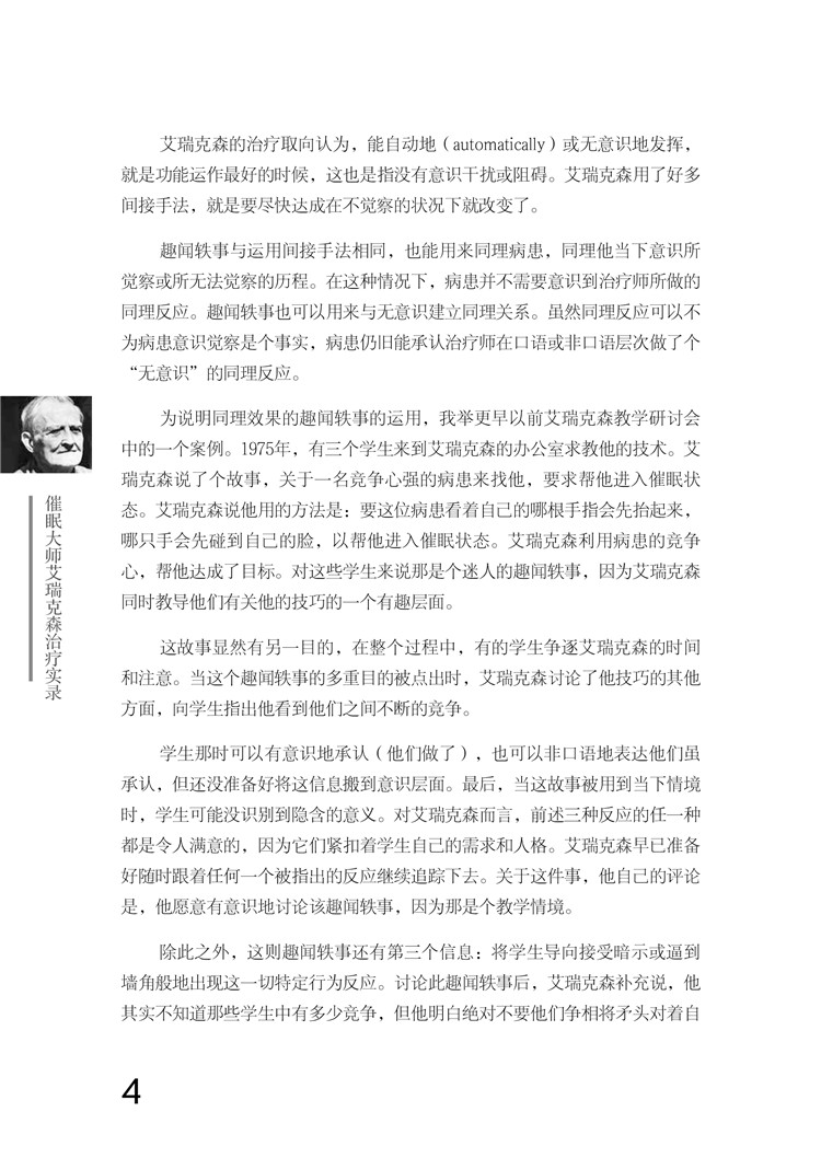 虽然已经有相当多的文章介绍已故艾瑞克森博士的工作,本书仍值得大力推荐,它不但提供读者一个了解艾瑞克森博士的机会,还可通过他的教学研讨会的逐字记录,尽可能地亲近他,直接向他学习。有些人有机会实际参与艾瑞克森的研讨会,但在展读这本书时又会发现,艾瑞克森教学的某些层面仍是前所未觉的。我会这么说当然有几分把握,因为在学生心目中,艾瑞克森的教学法带来的困惑多于启发,偏偏困惑有不必然适时伴随着启发。读者会发现自己处在一个令人困惑与启发的因果循环中。正是这些困惑促成注意力维持在持续转换状态,形成了艾瑞克森所称的自然催眠状态,而这种自然催眠状态正可促进无意识学习。依赖无意识学习时非常有利又直击要害的方法。