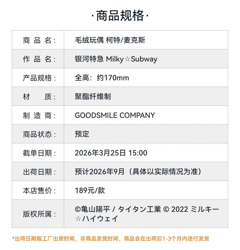 【GSC预售定金】毛绒玩偶 柯特/麦克斯 银河特急 Milky Subway