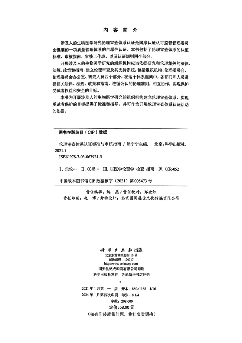 伦理审查体系认证标准与审核指南 熊宁宁 包括了伦理审查体系的认证标准 审核指南 审核工作表 以及认证规则四个部分 科学出版社