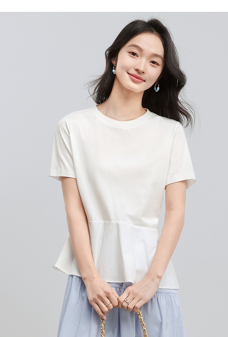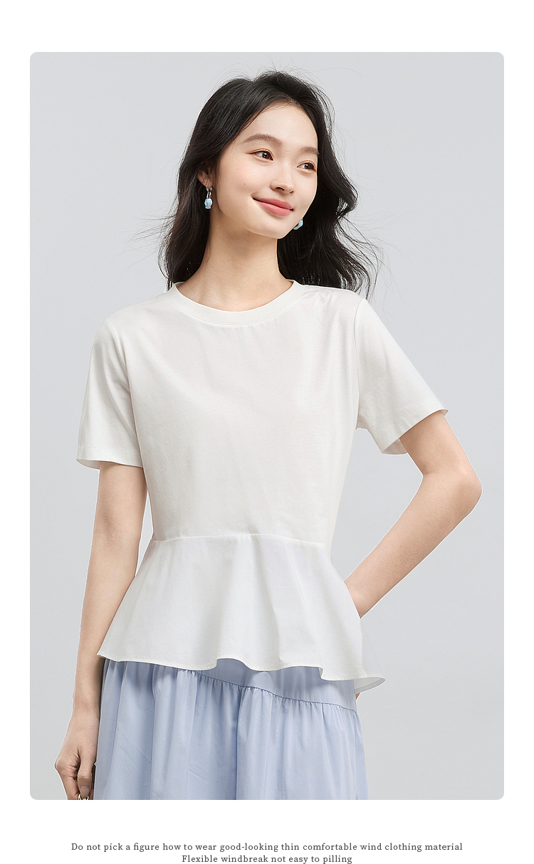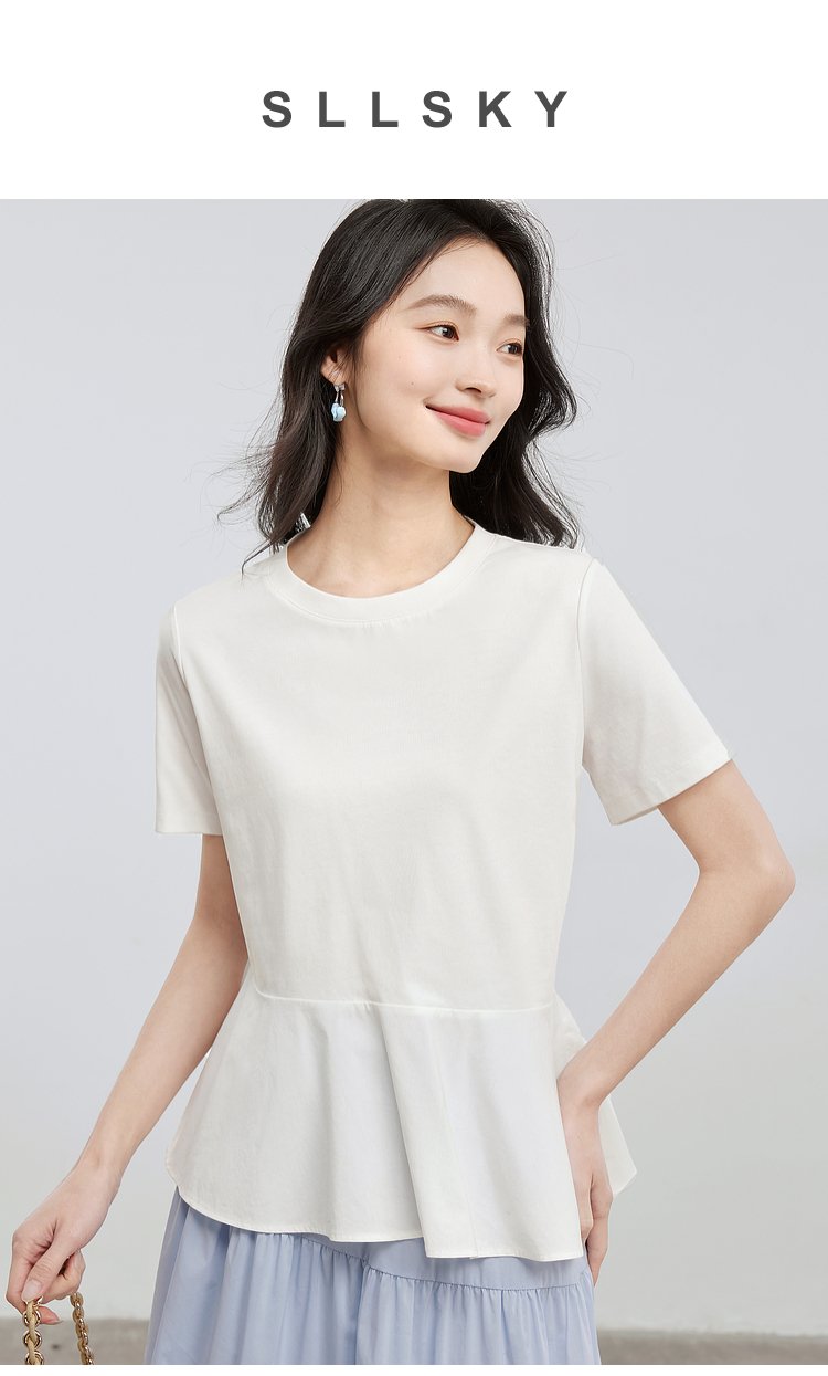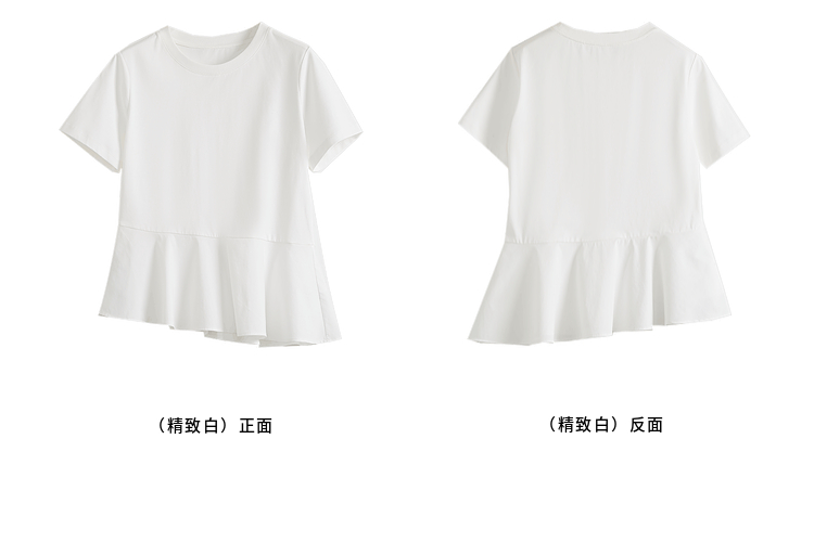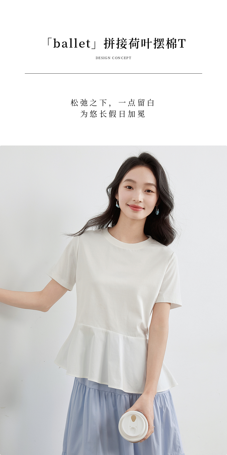熙世界荷叶边下摆拼接短袖t恤女设计感白色体恤上衣2025夏日新款