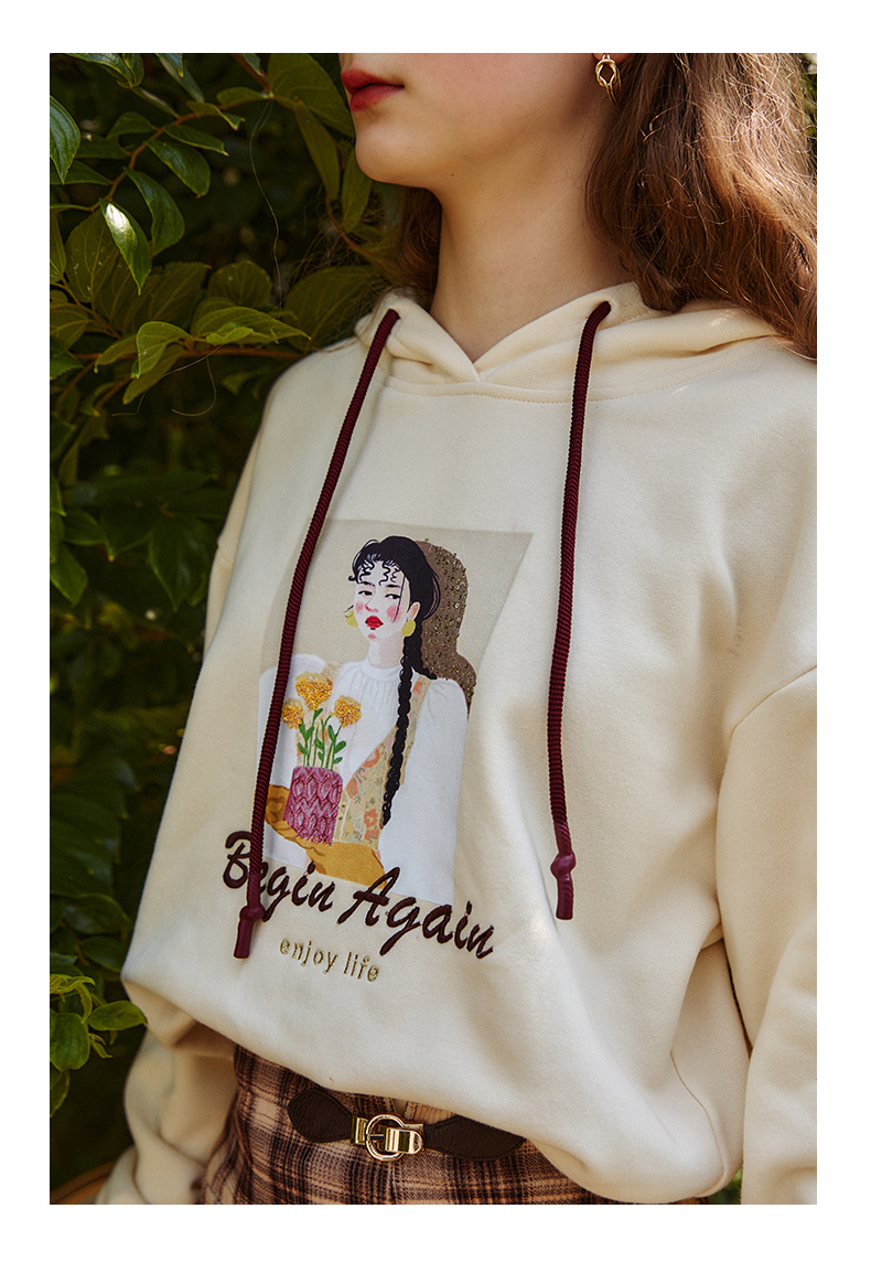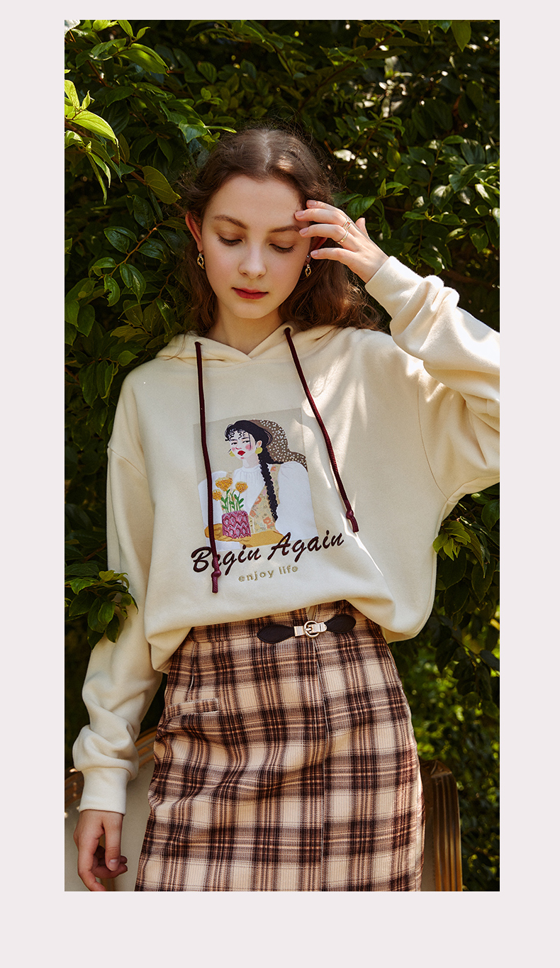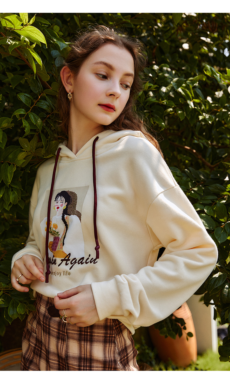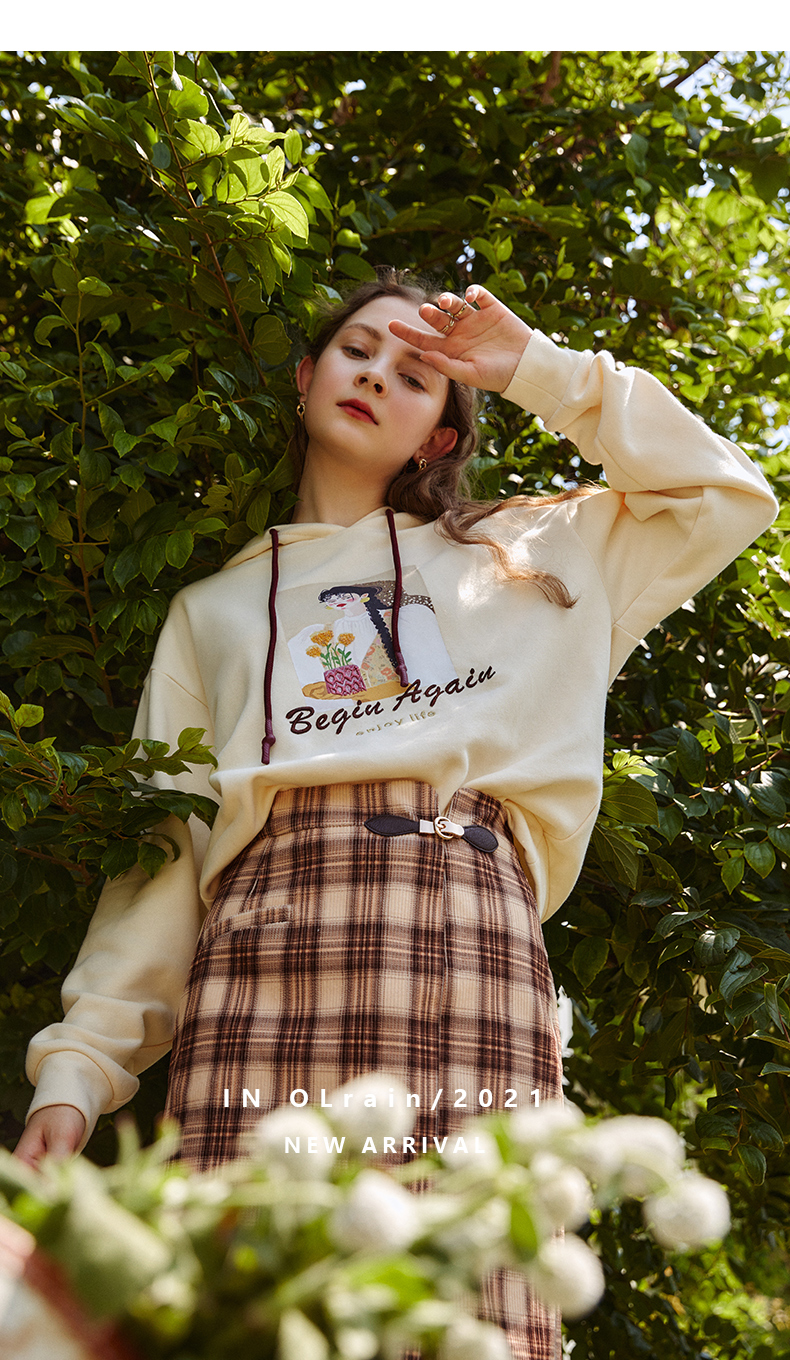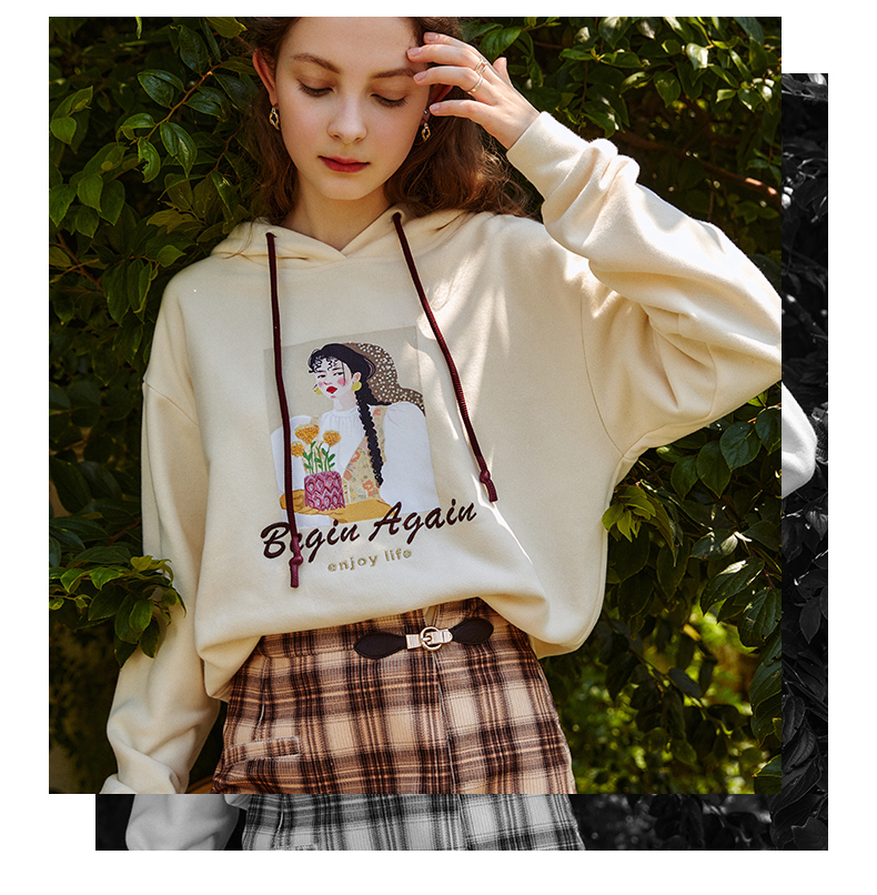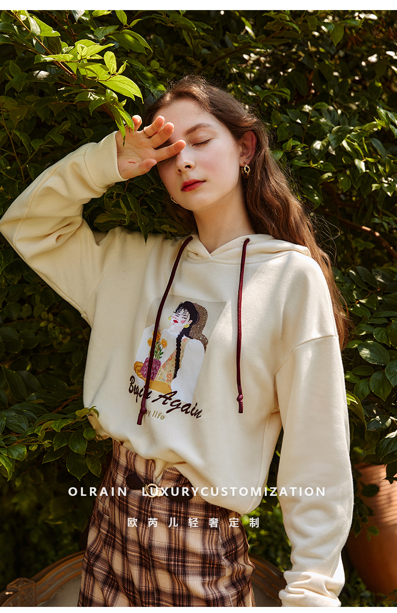 欧芮儿连帽卫衣女冬季2025年新款宽松显瘦慵懒风印花磨毛针织上衣