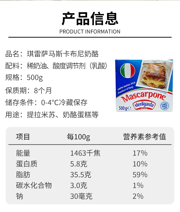 【新日期】500克 琪雷萨 马斯卡布尼奶酪 纸盒装 马斯卡彭芝士提拉米苏原料