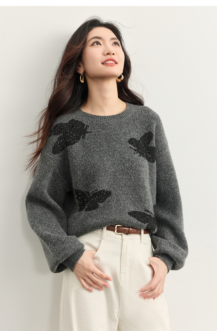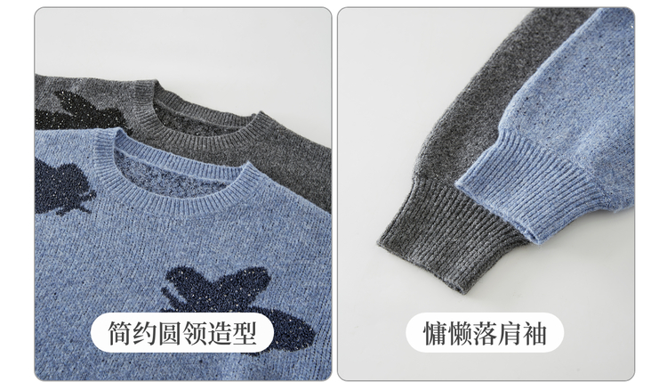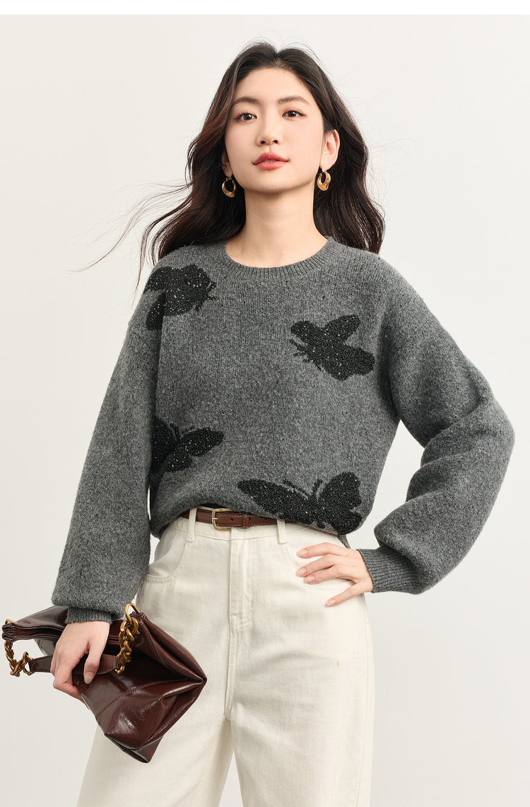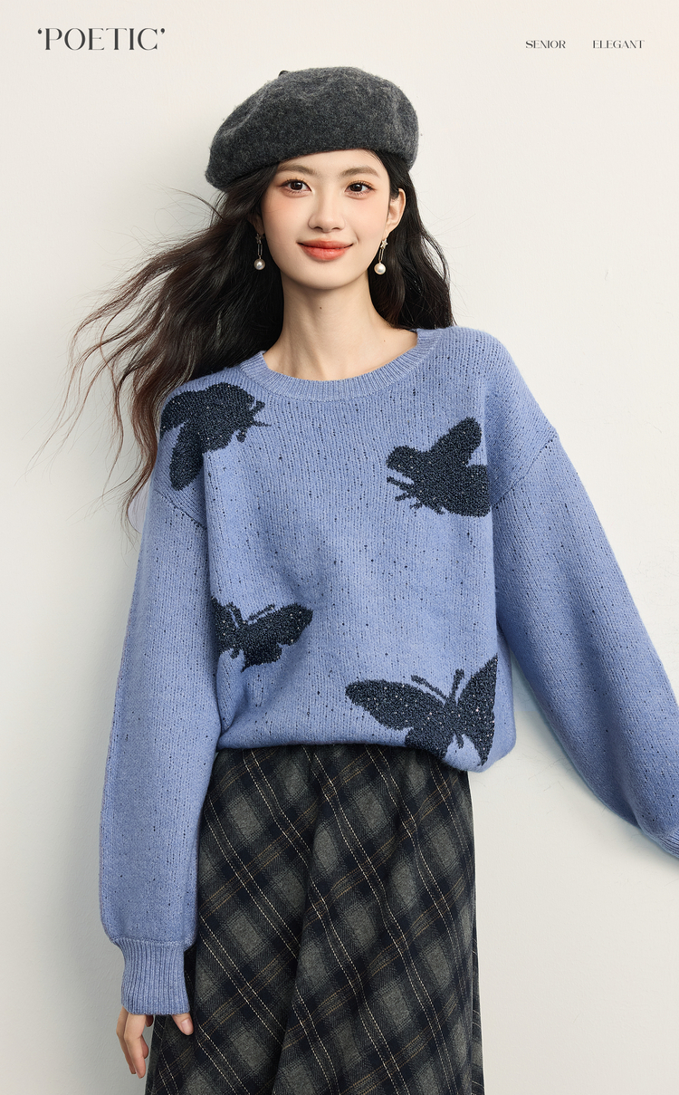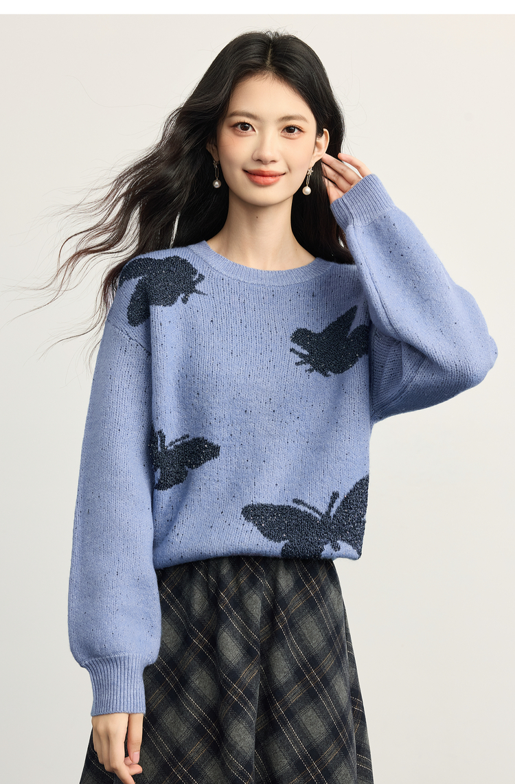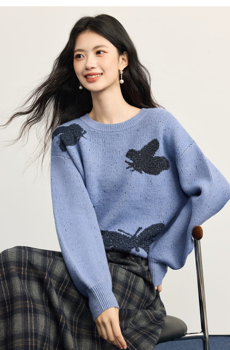 【周末秒杀】熙世界仿牛绒提花蝴蝶毛衣女秋冬2025新款宽松圆领厚款针织衫上衣