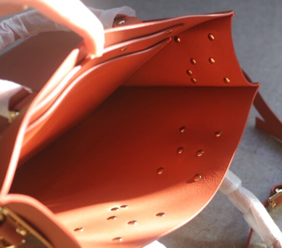 属硬皮类 包型是很挺括的 包顶可手提 敞开式包口 包内无隔断 有个贴袋