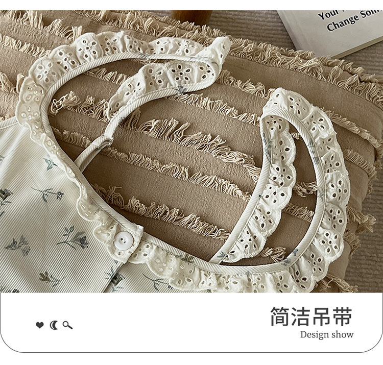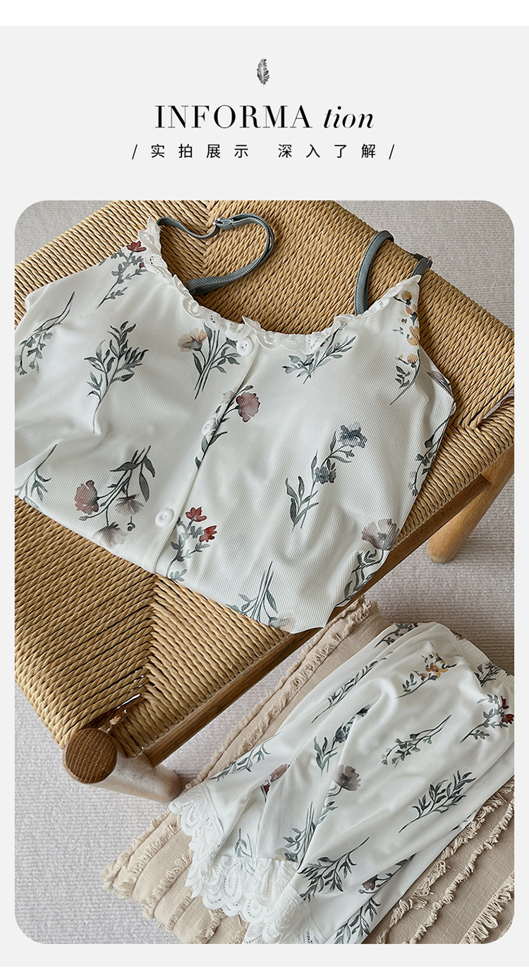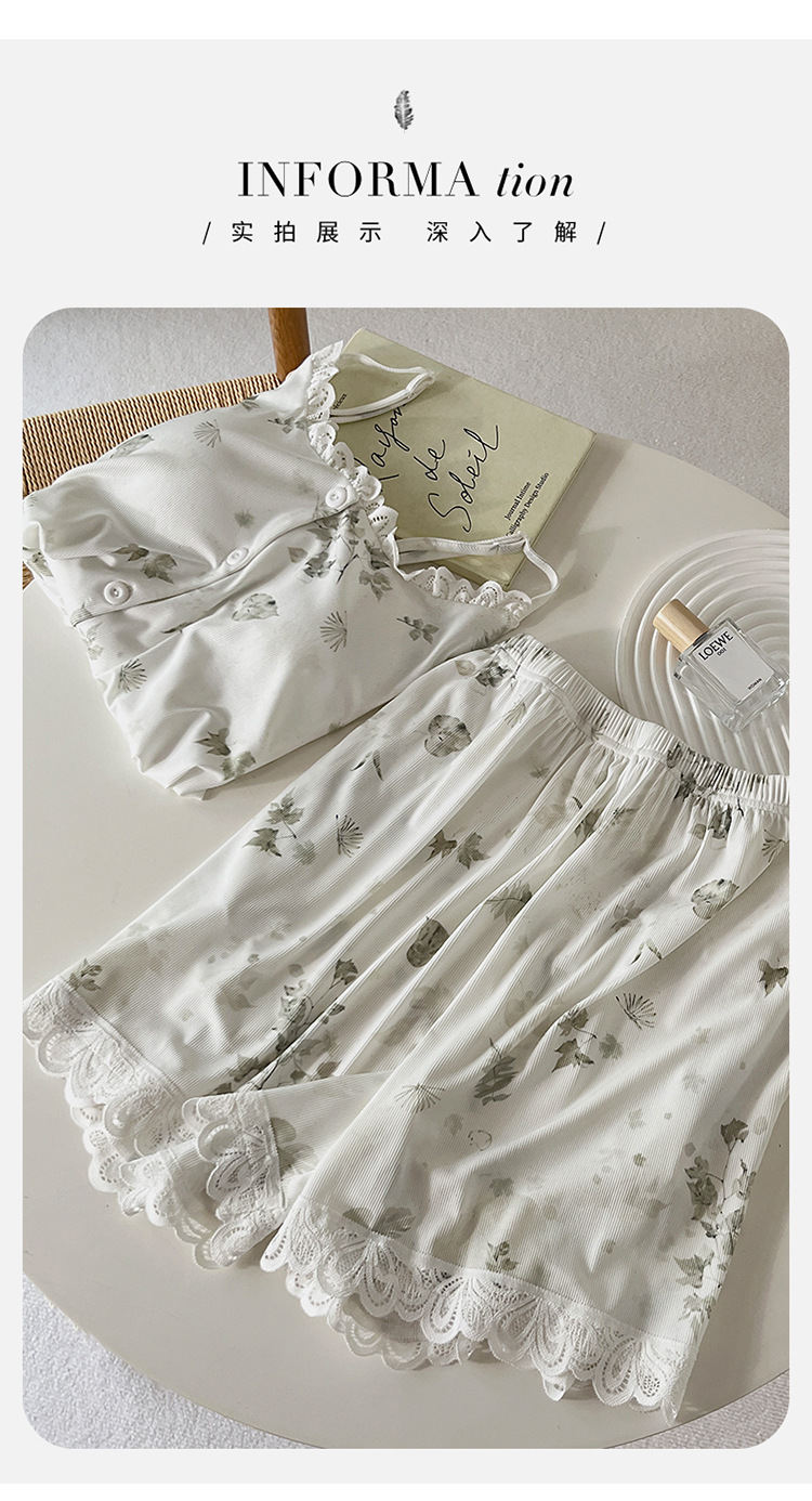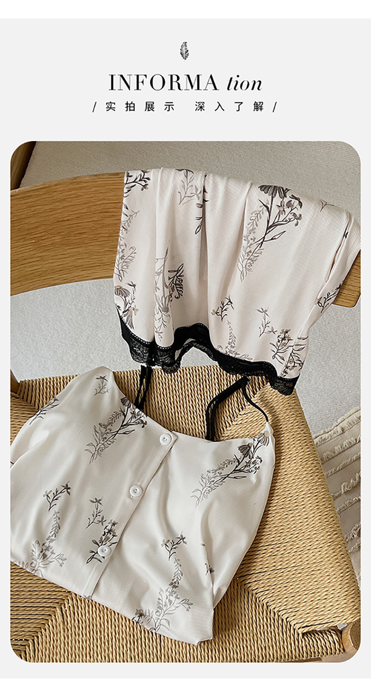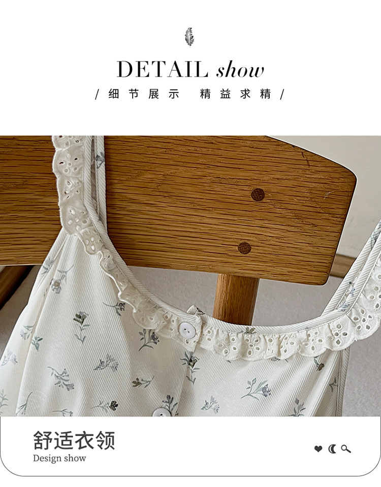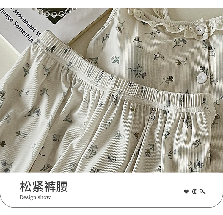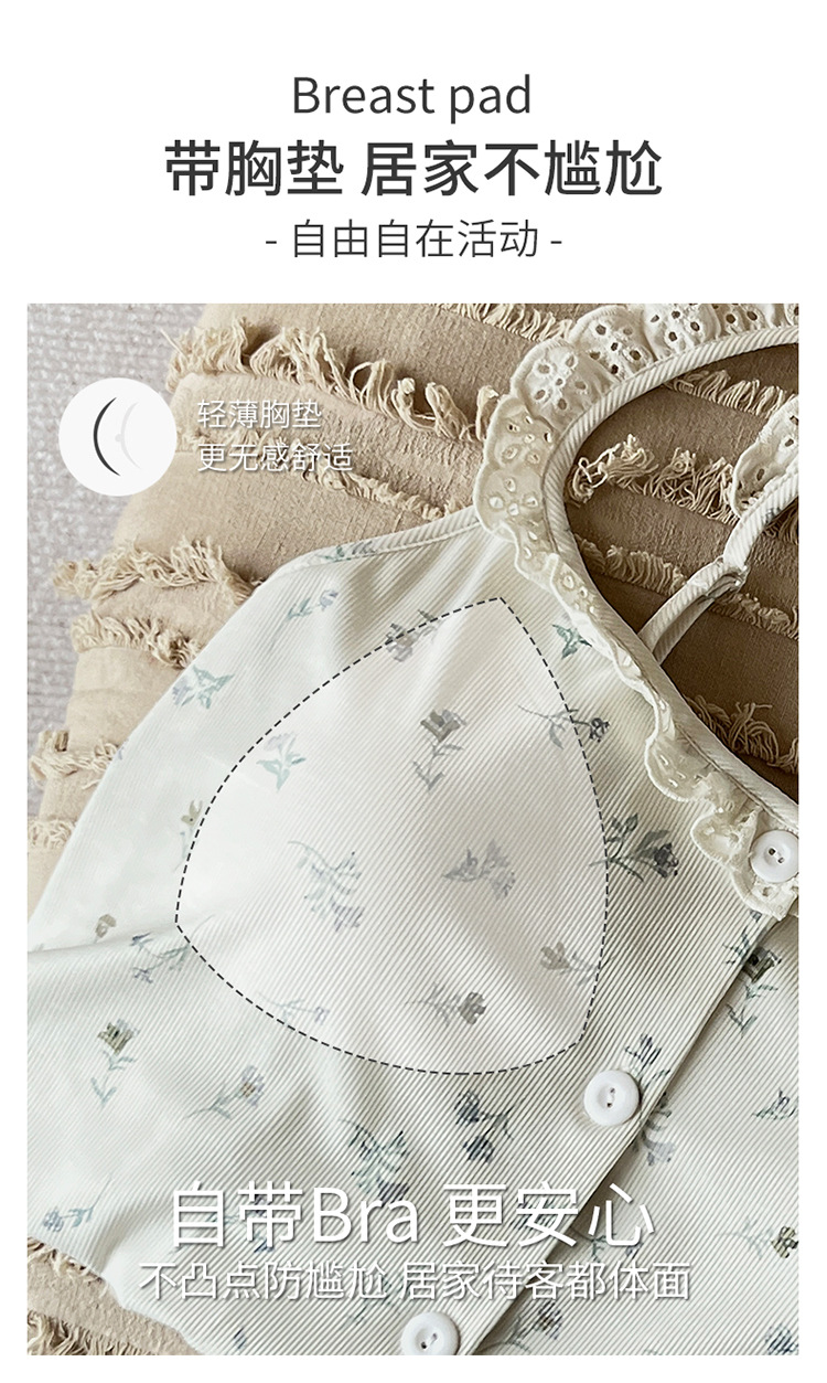 女士夏季性感带胸垫冰丝螺纹吊带睡衣套装 免穿内衣碎花背心短裤薄款家居服两件套