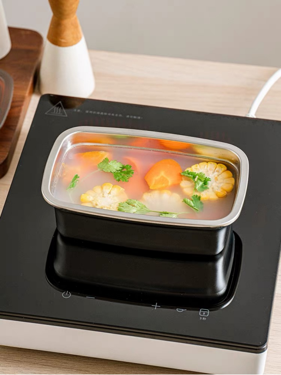 🔻可冷冻可加热 不锈钢导冷快速且均匀 配合冰箱可达到迅速冷冻保鲜的效果 可电磁炉加热,可入烤箱和蒸箱 放烤箱使用时务必将盖子取下,请勿带盖放置于烤箱