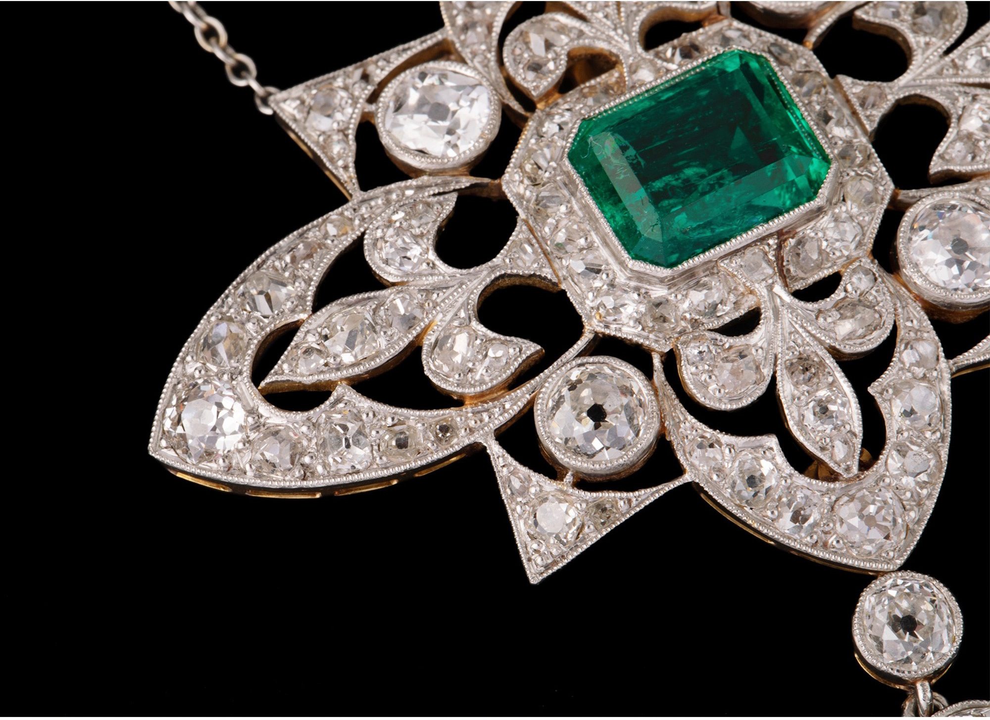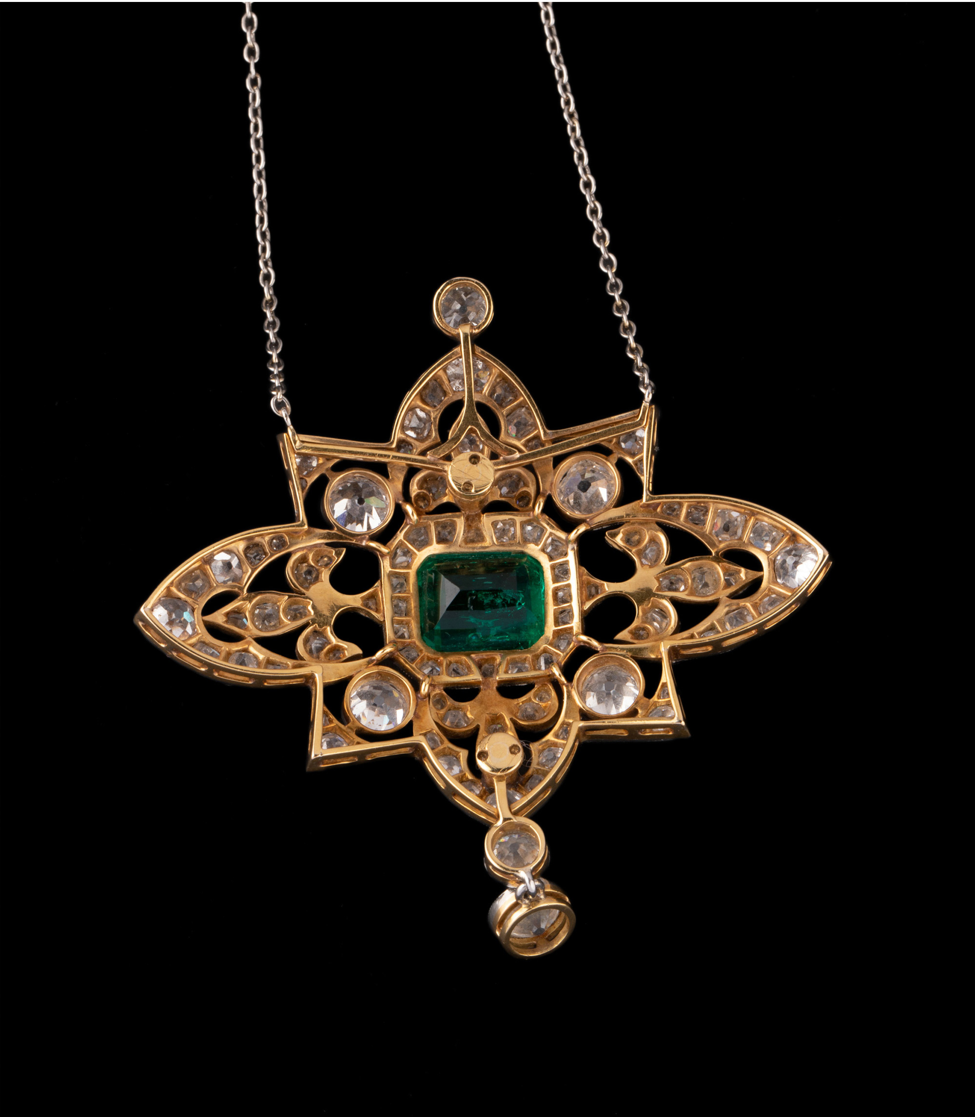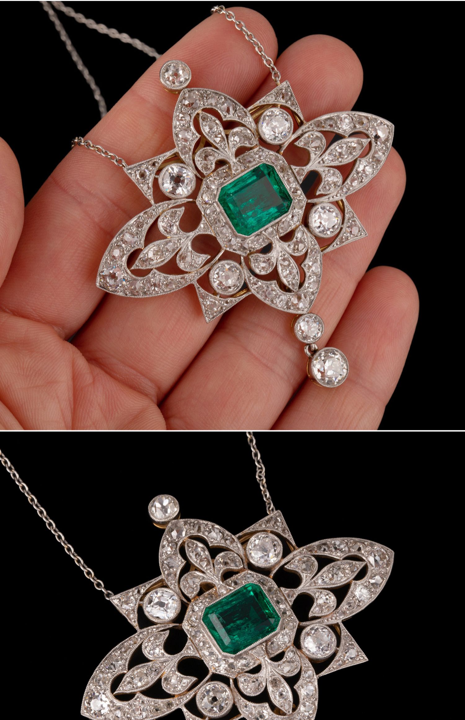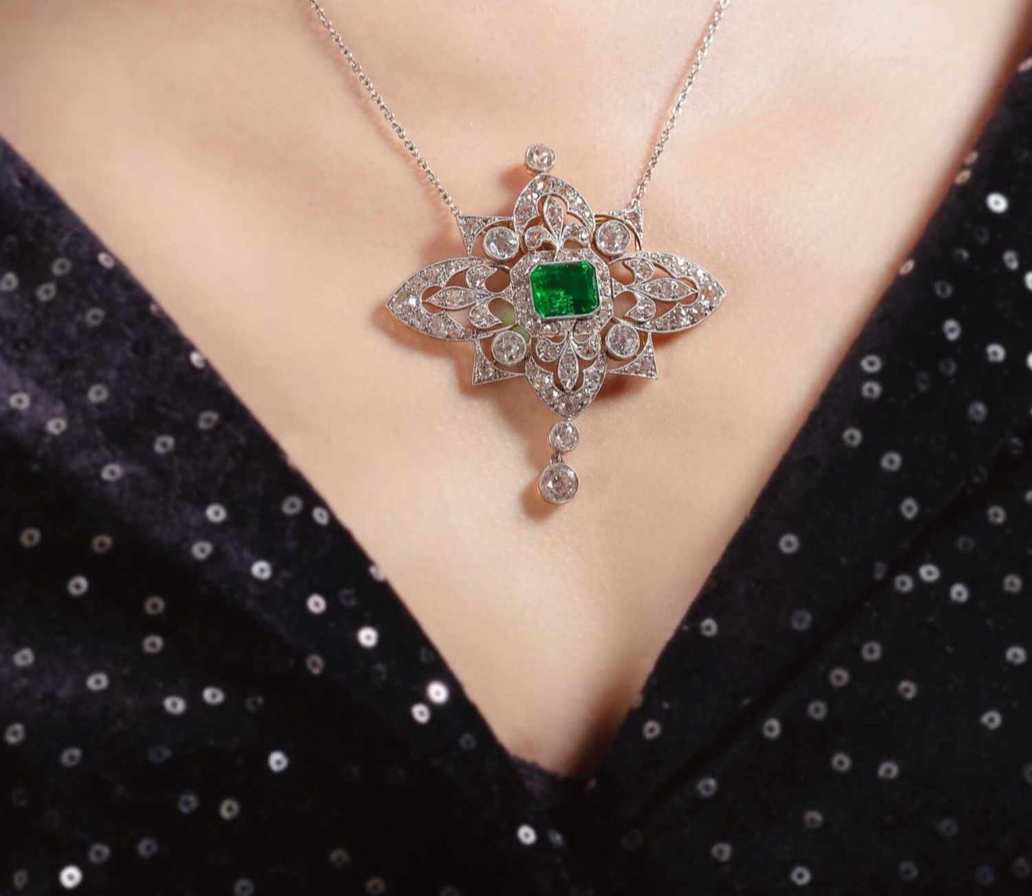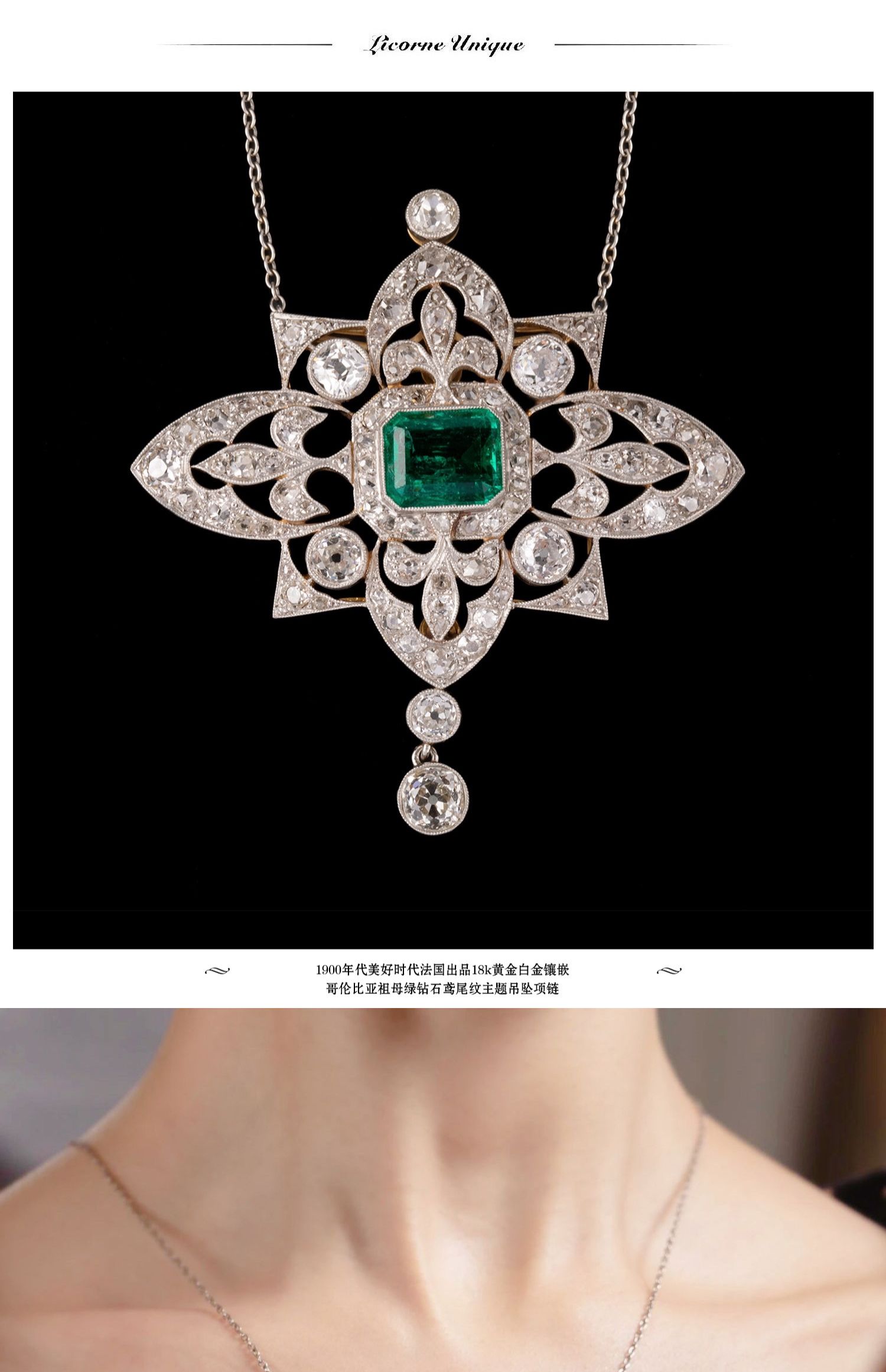 独角鹿西洋古董法国18K金镶哥伦比亚祖母绿钻石鸢尾纹吊坠项链