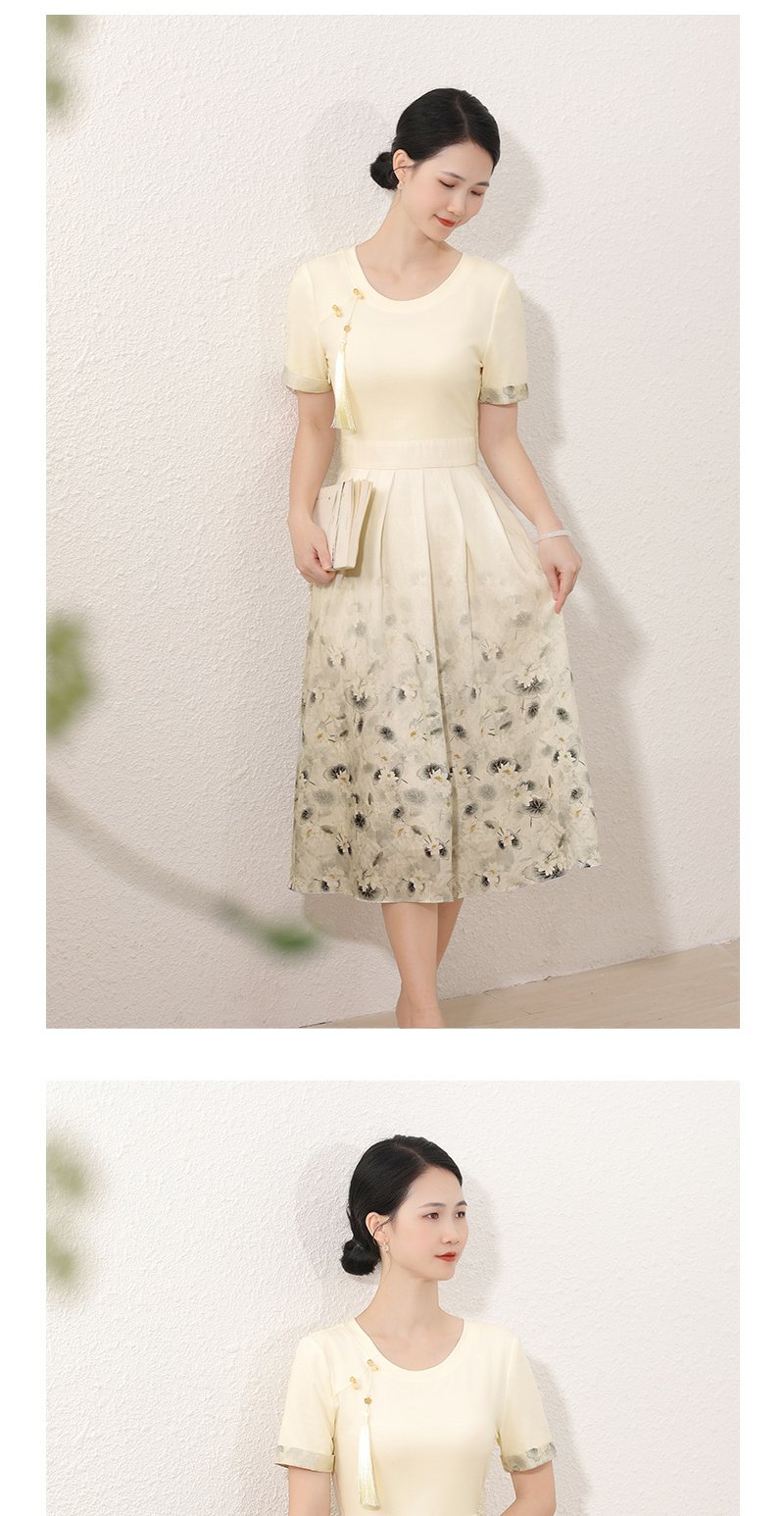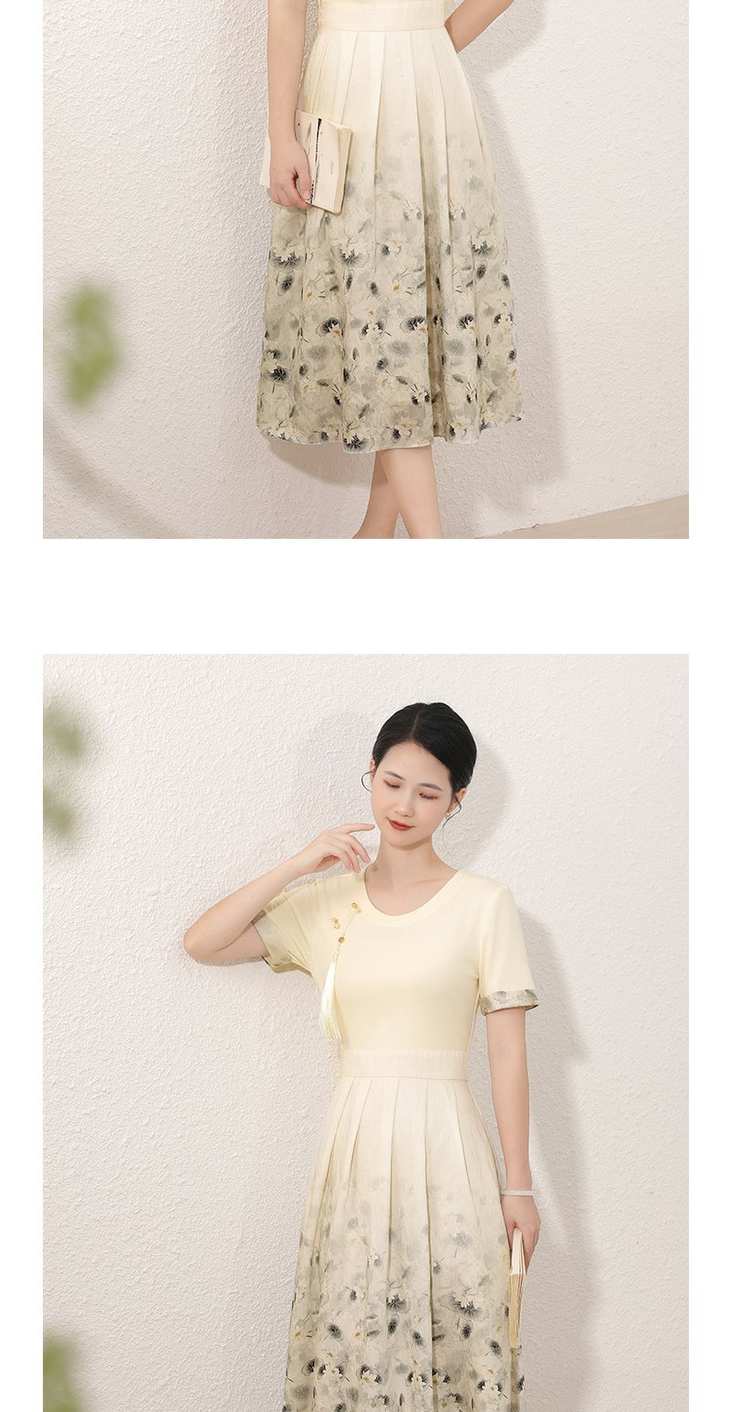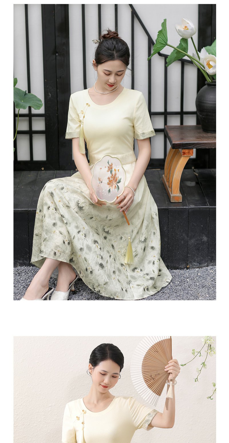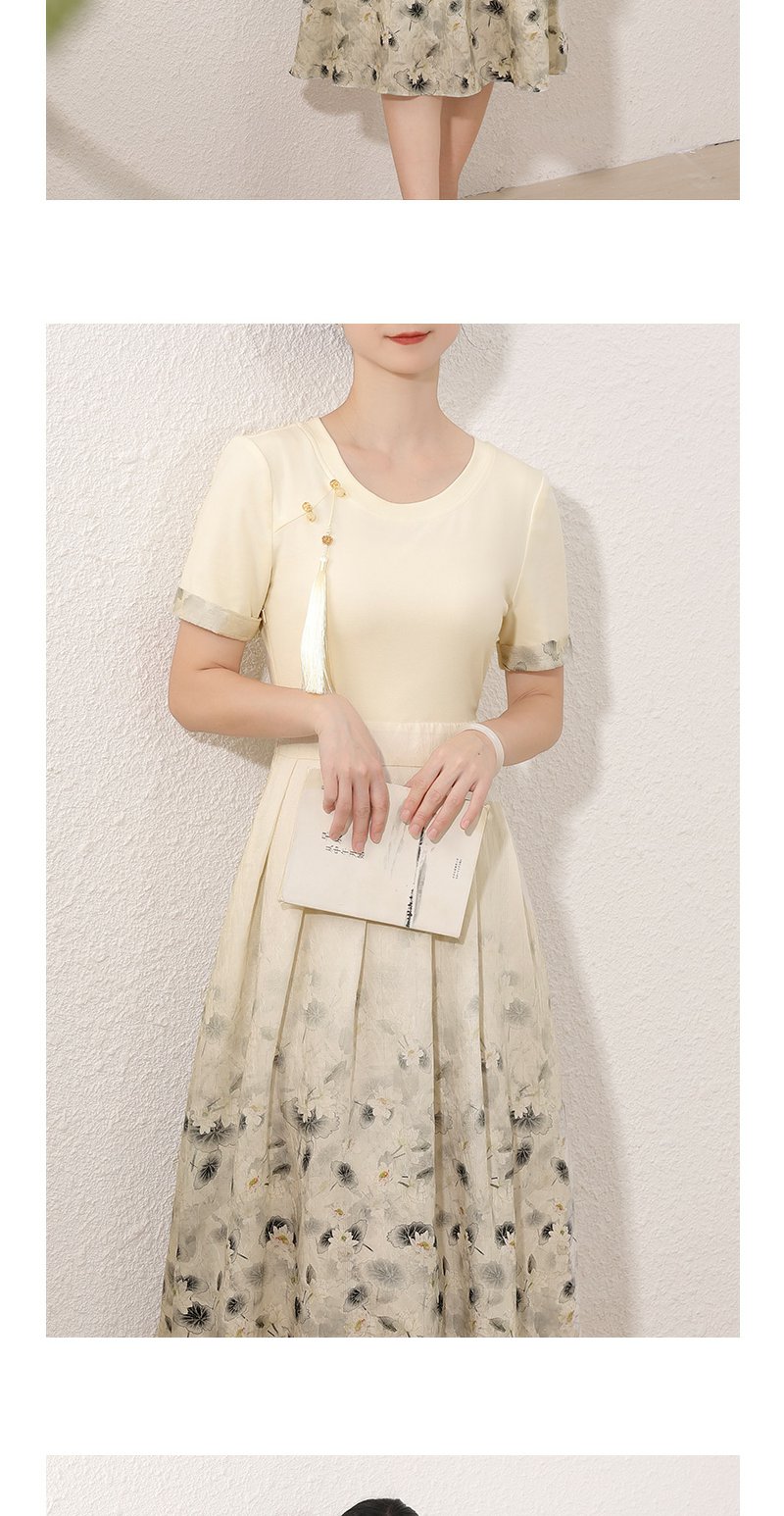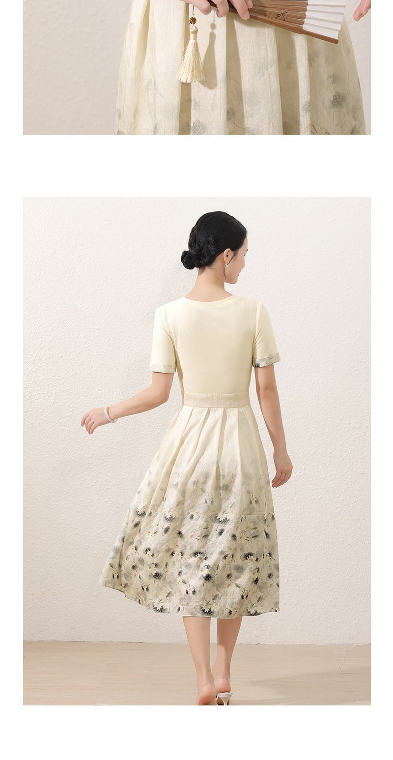 未风杏色国风连衣裙女2025新款夏季气质收腰针织拼接长款短袖裙子