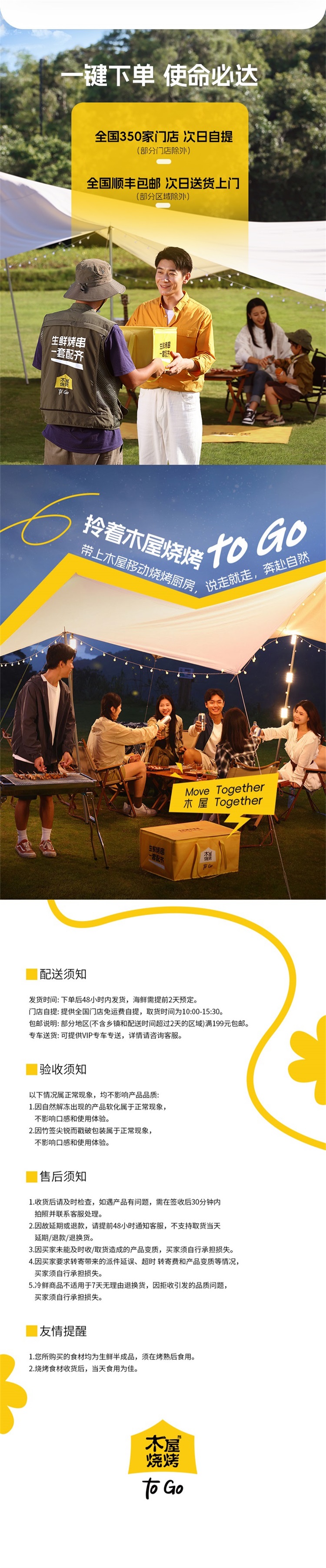 木屋烧烤半成品套装,一键下单,使命必达。 -全国300家门店支持次日到店自提 -全国顺丰包邮,当日下单,次日顺丰送货上门(部分区域除外,实际以顺丰时效为准)