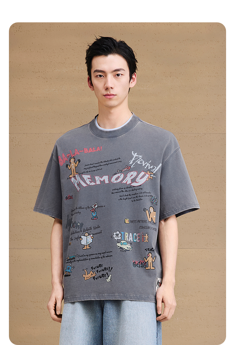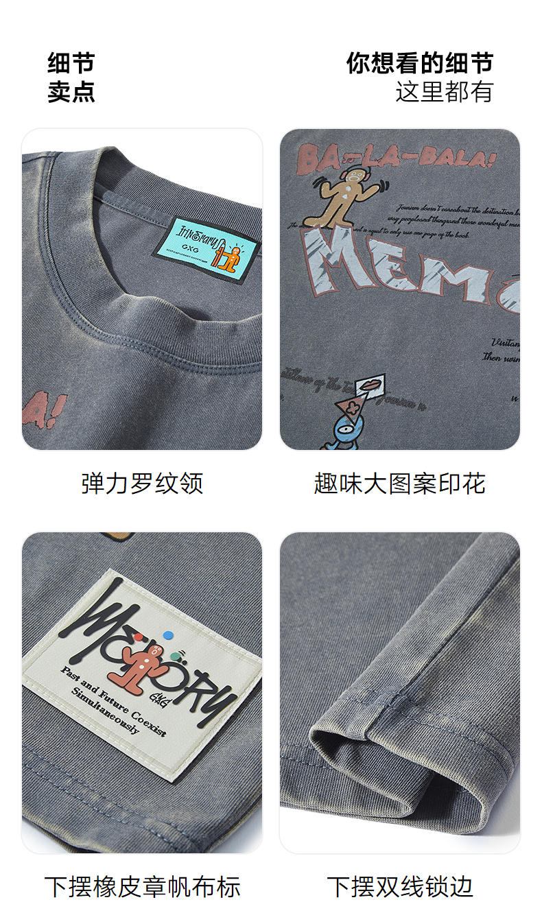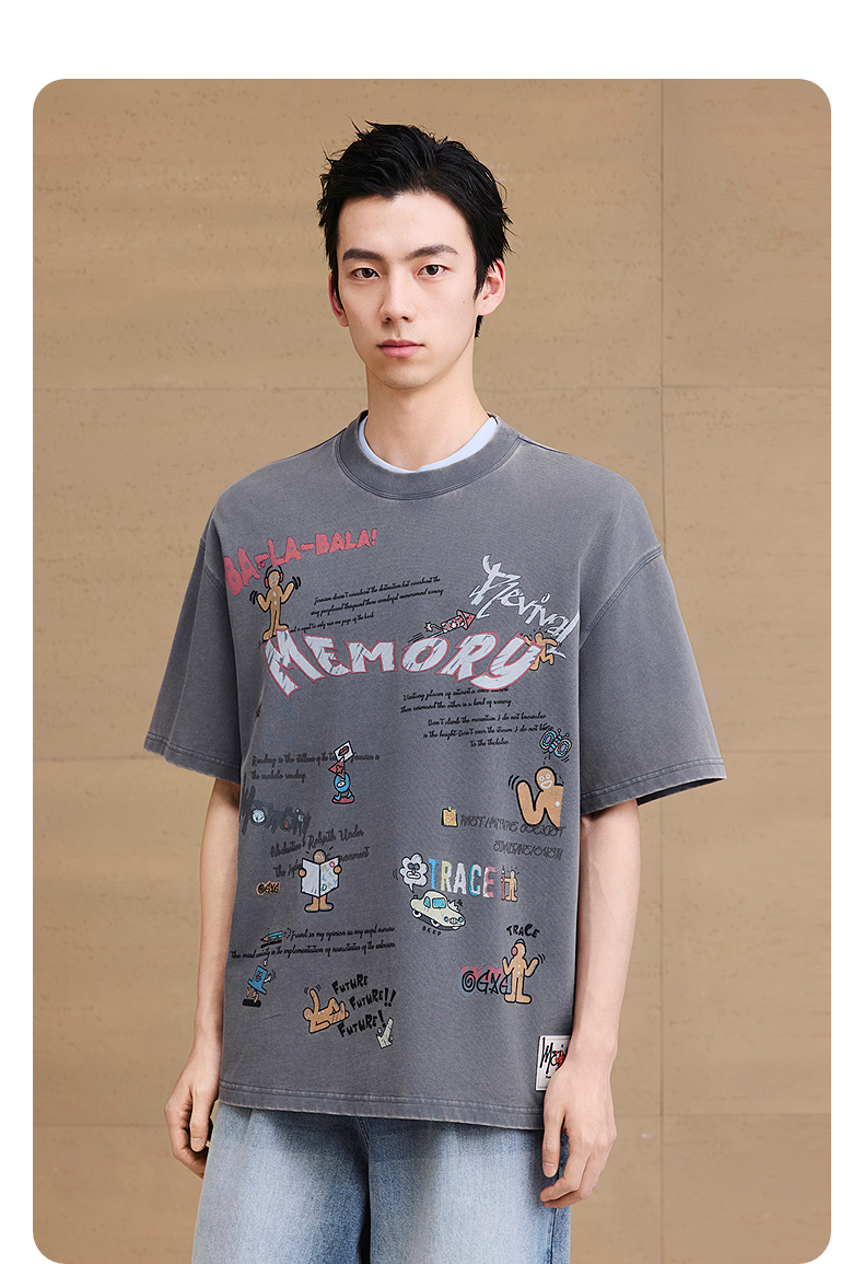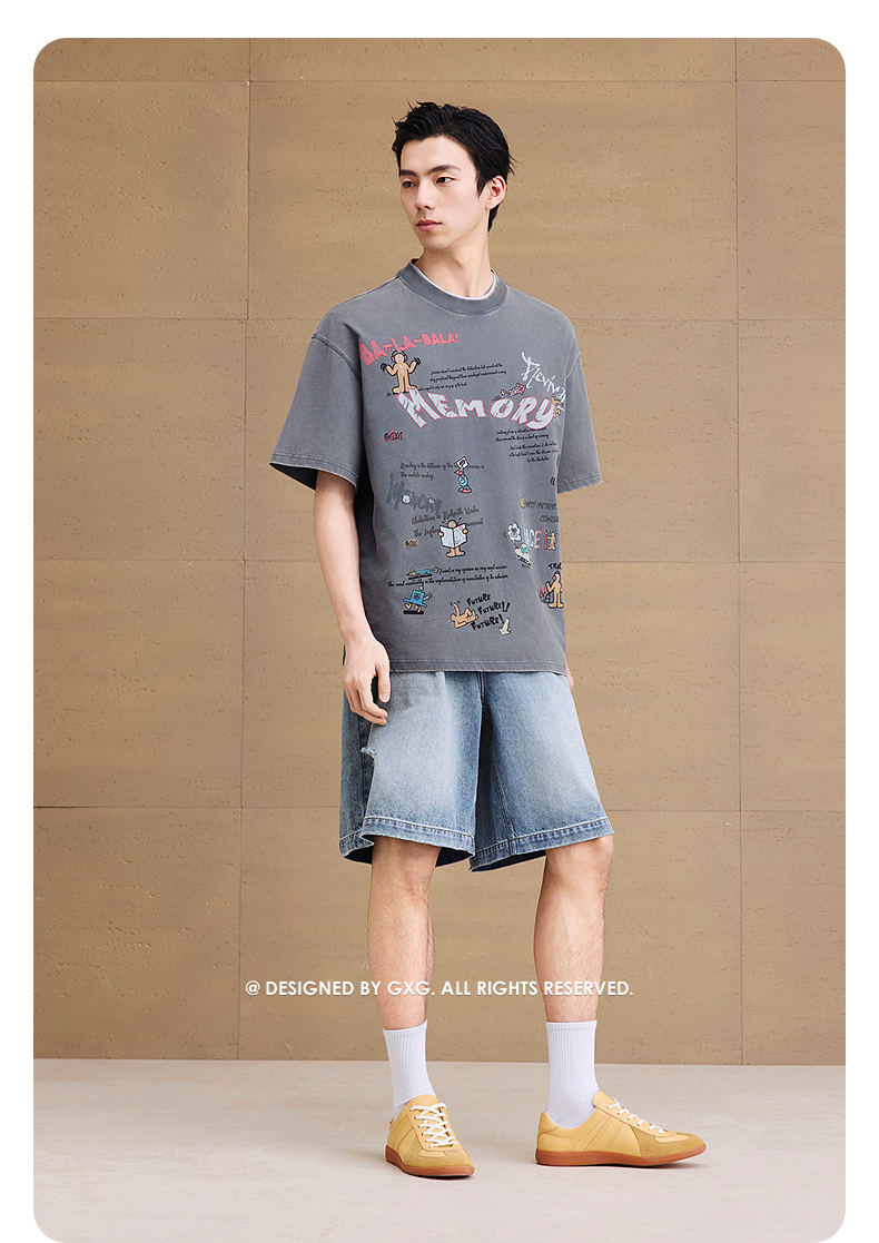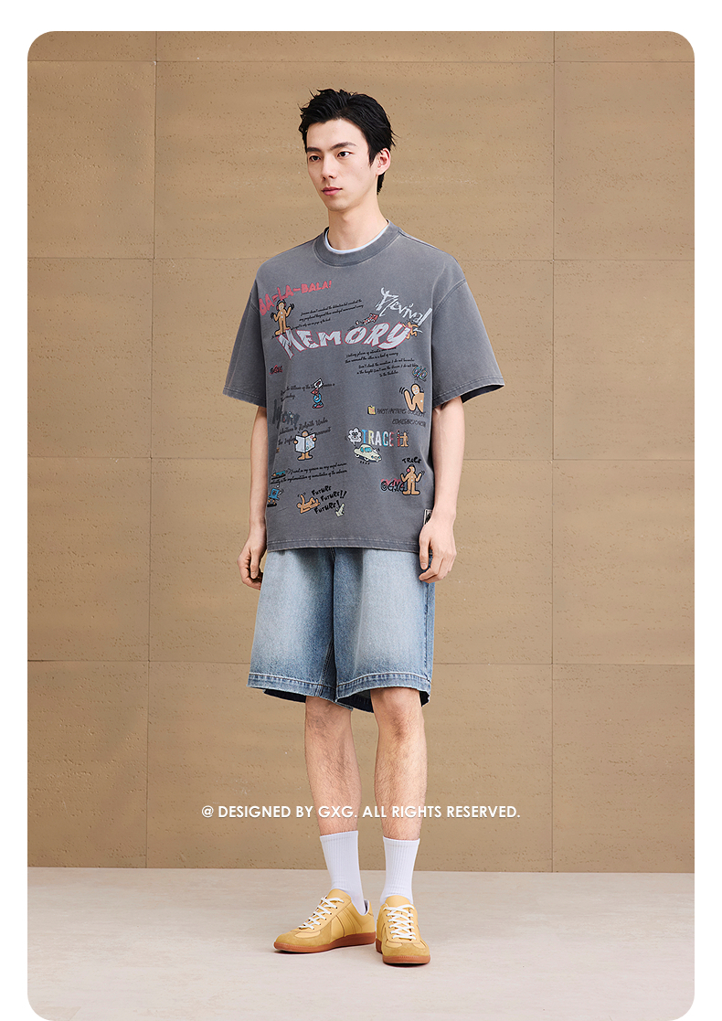 GXG男装 圆领T恤做旧水洗上衣图案印花短袖针织 2025夏季新品