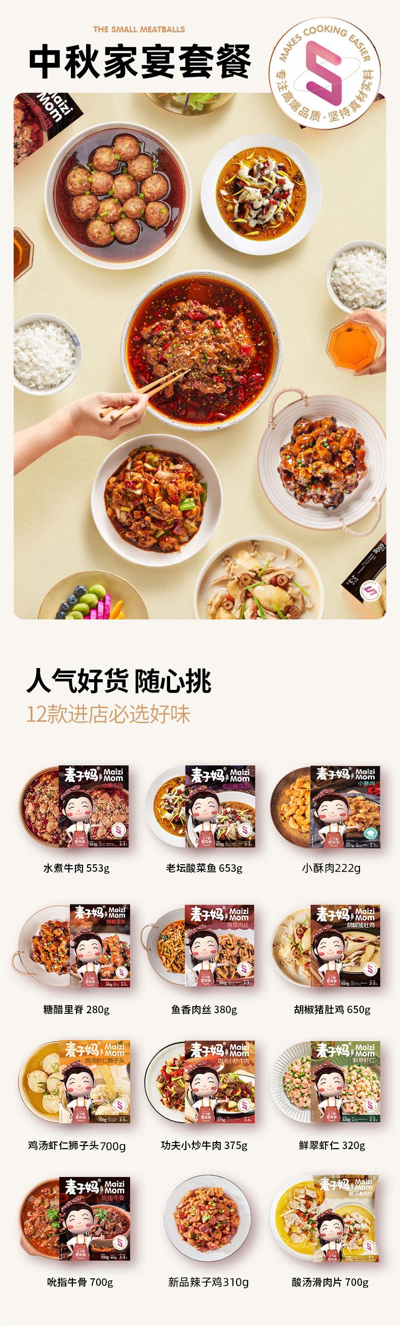 12盒套餐:老坛酸菜鱼653g 、水煮牛肉553g、 糖醋里脊280g 、小酥肉222g、 鱼香肉丝380g 、鲜萃虾仁320g 、功夫小炒牛肉375g、 鸡汤虾仁狮子头700g 、辣子鸡310g 、酸汤滑肉700g、允指牛骨700g、 胡椒猪肚鸡650g