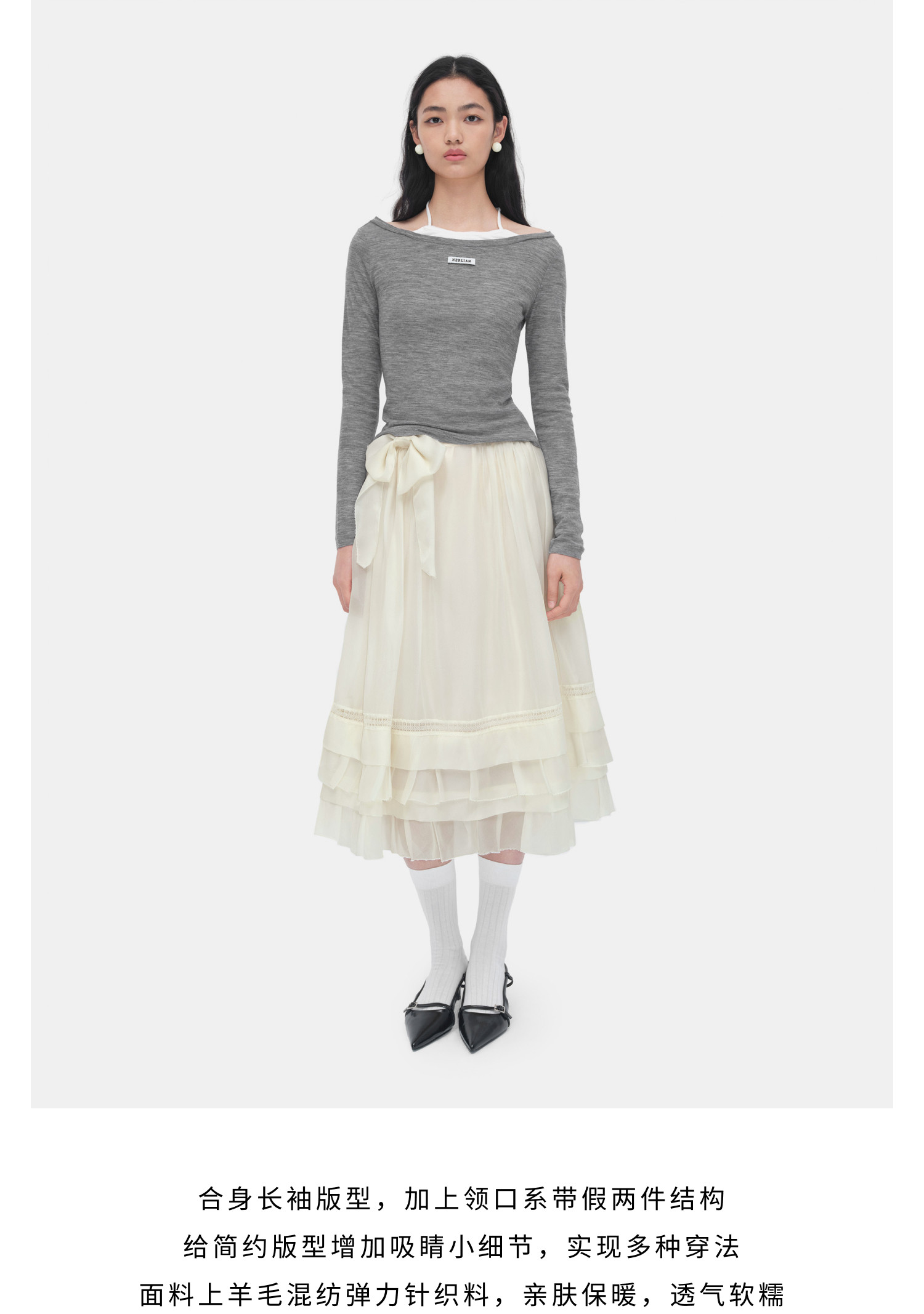 HERLIAN 2026年春季新品假两件系带挂脖合身百搭女士长袖T恤