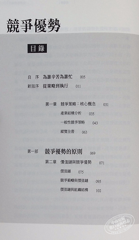 波特教授在他的另一本著作《競爭策略》中說明了「產業與競爭者分析」的技術。在本書中則進一步解釋「企業如何建立並維持競爭優勢」。詳細說明:企業經理人如何評估本身的競爭地位?如何採取特定行動提升競爭地位?