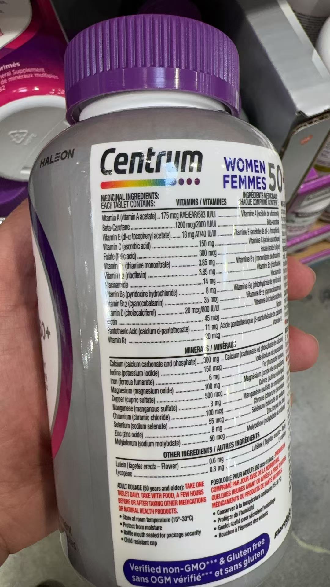 特殊的配方满足50岁以上女士的营养需求:抗氧化物;B族维生素支持能量的供应;叶黄素+维A,C,E保护眼睛;维D+钙呵护乳房和骨骼。
