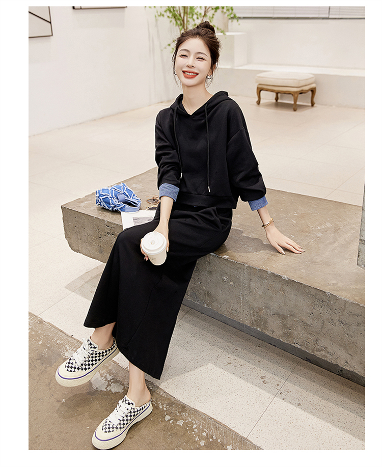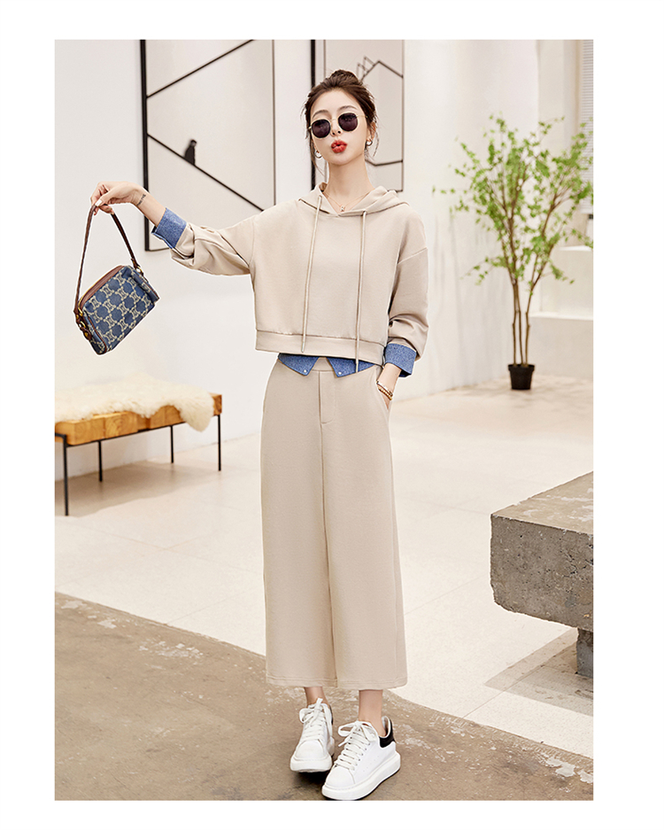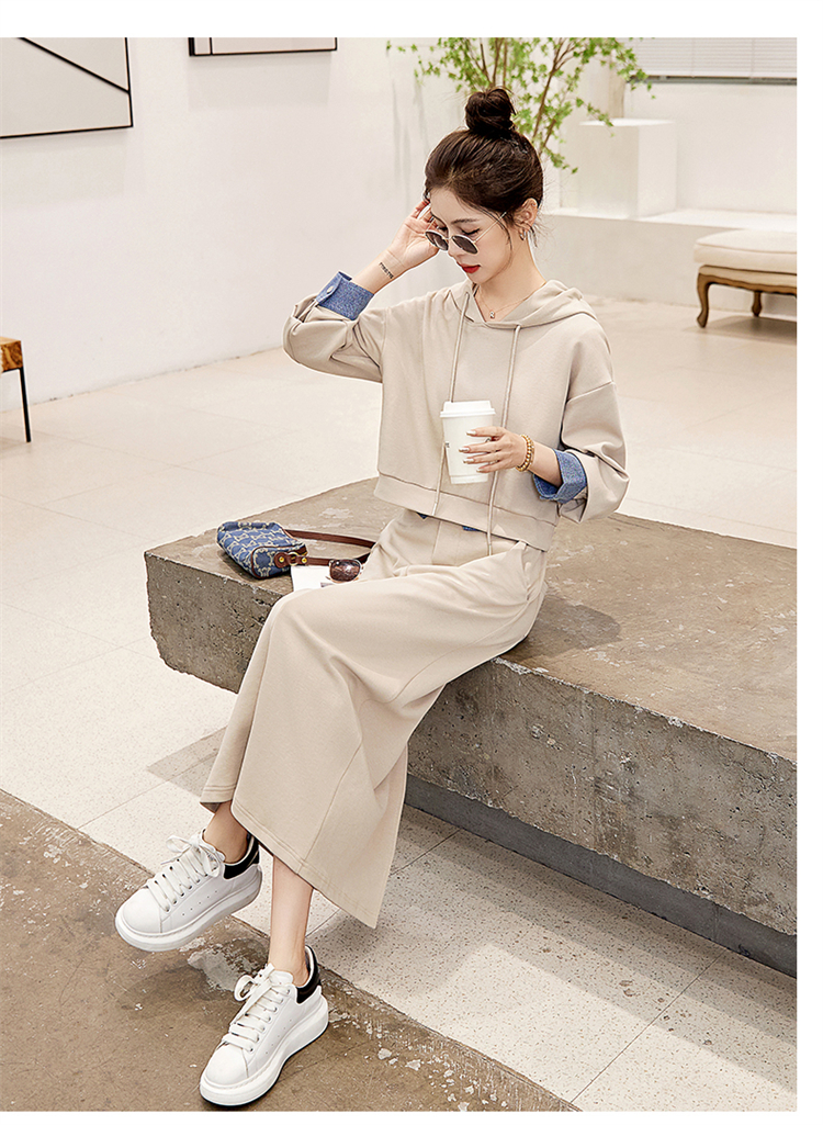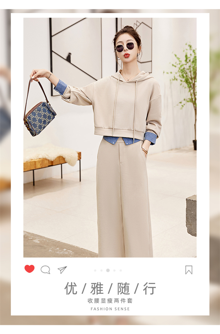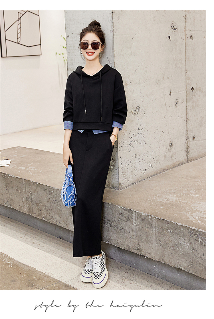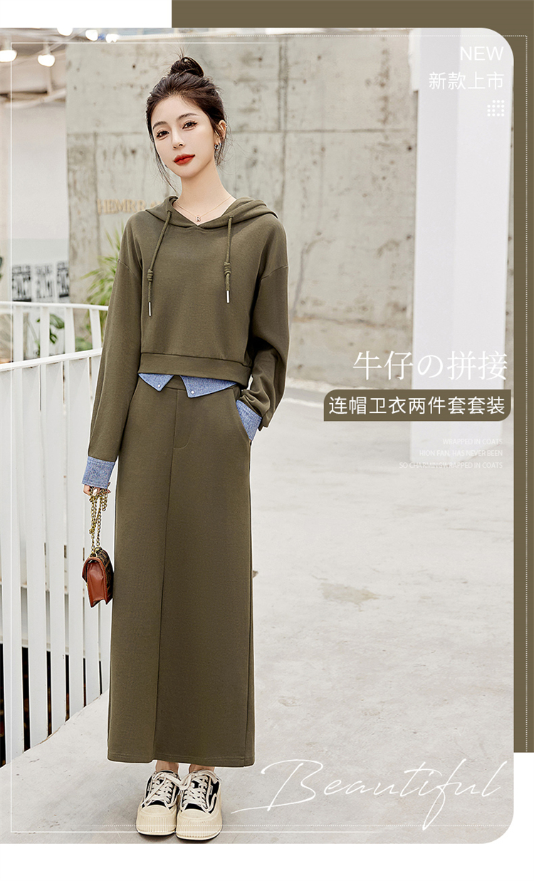 新款春装,牛仔拼接连帽卫衣两件套套装HR-CPYY2307-1