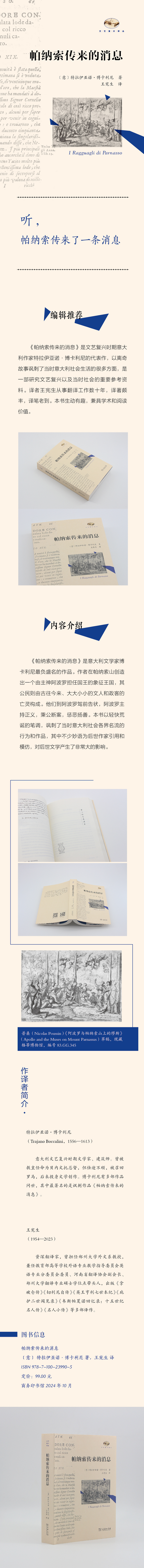 《帕纳索传来的消息》是文艺复兴时期意大利作家特拉伊亚诺·博卡利尼的代表作,以离奇故事讽刺了当时意大利社会生活的很多方面,是一部研究文艺复兴以及当时社会的重要参考资料。译者王宪生从事翻译工作数十年,译著颇丰,译笔老到。本书生动有趣,兼具学术和阅读价值。