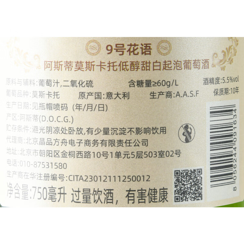 9号花语阿斯蒂莫斯卡托低醇甜白起泡葡萄酒750ml/瓶