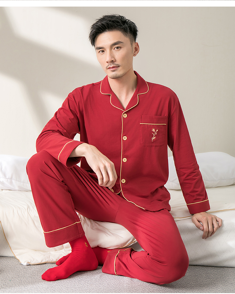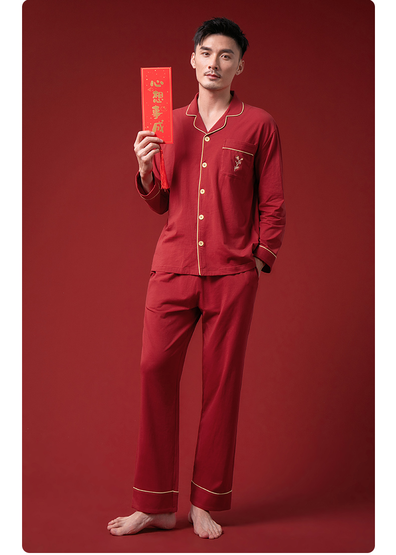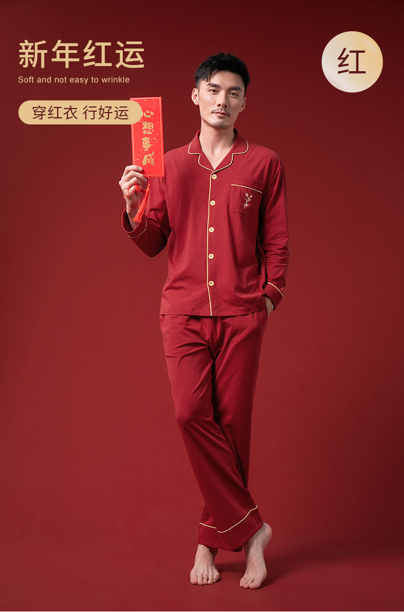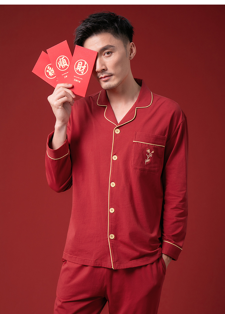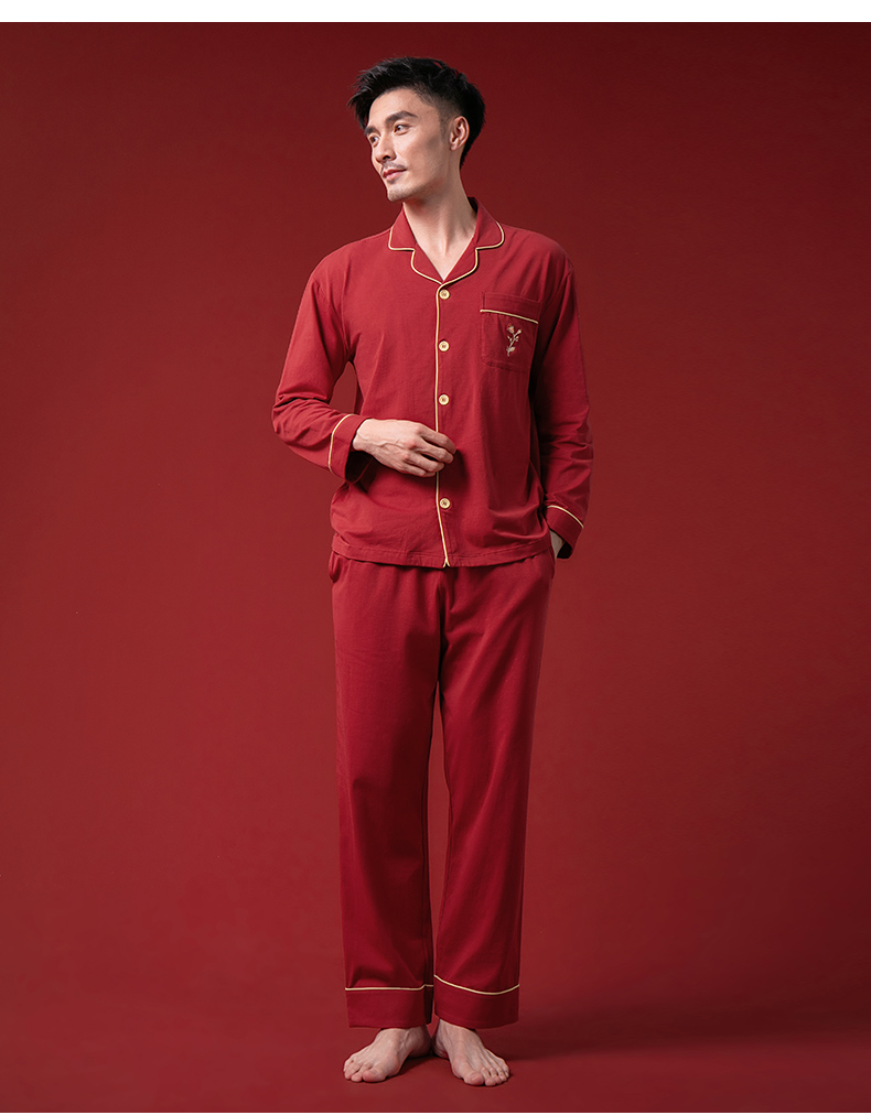 康妮雅睡衣家居服 男式长袖长裤开襟套装*枣红