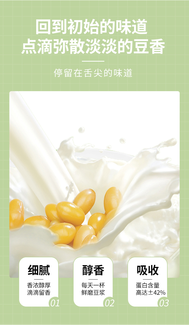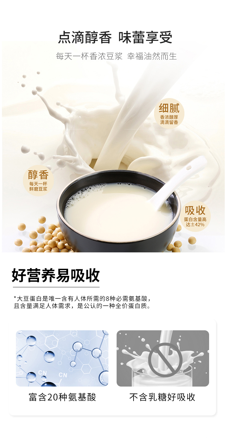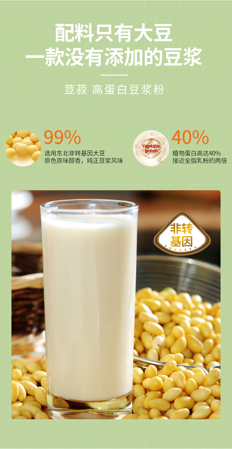 使用超高速破壁工艺,纯天然,无添加,配料为纯大豆。口感鲜香浓郁,营养丰富。小包装,携带方便,保存方便。
