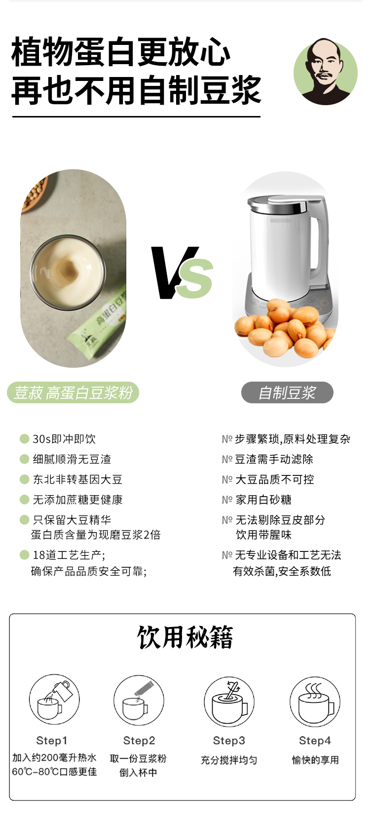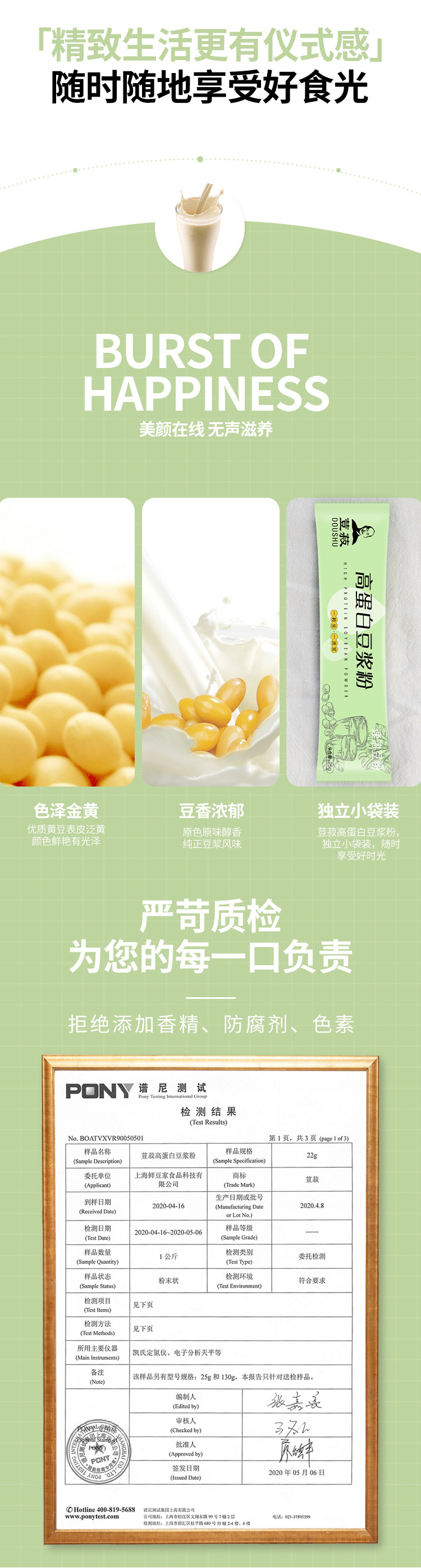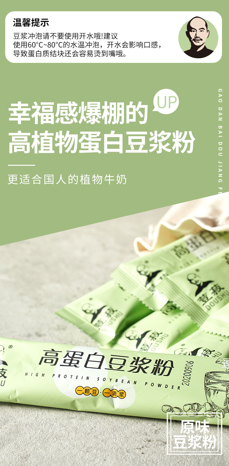 使用超高速破壁工艺,纯天然,无添加,配料为纯大豆。口感鲜香浓郁,营养丰富。小包装,携带方便,保存方便。