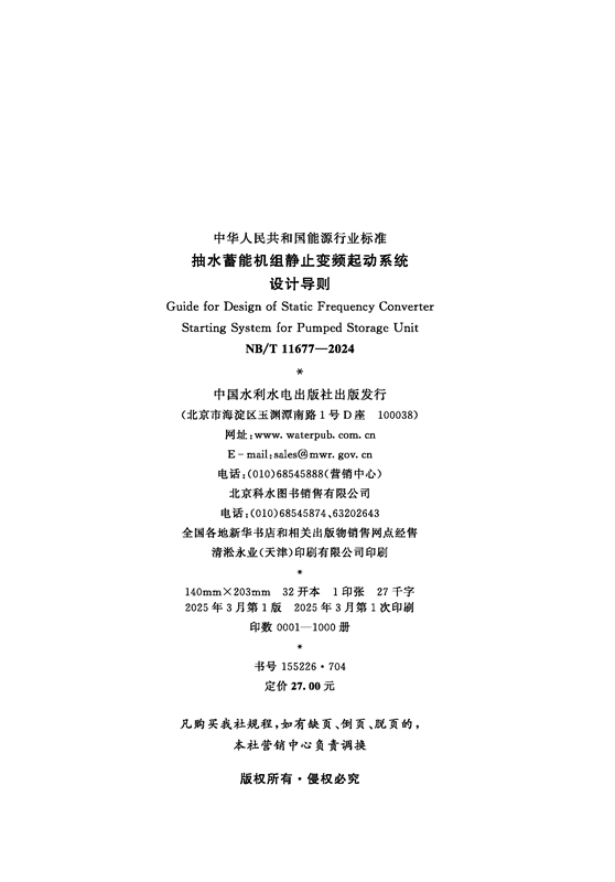 图书名称:抽水蓄能机组静止变频起动系统设计导则(NB/T 11677—2024)