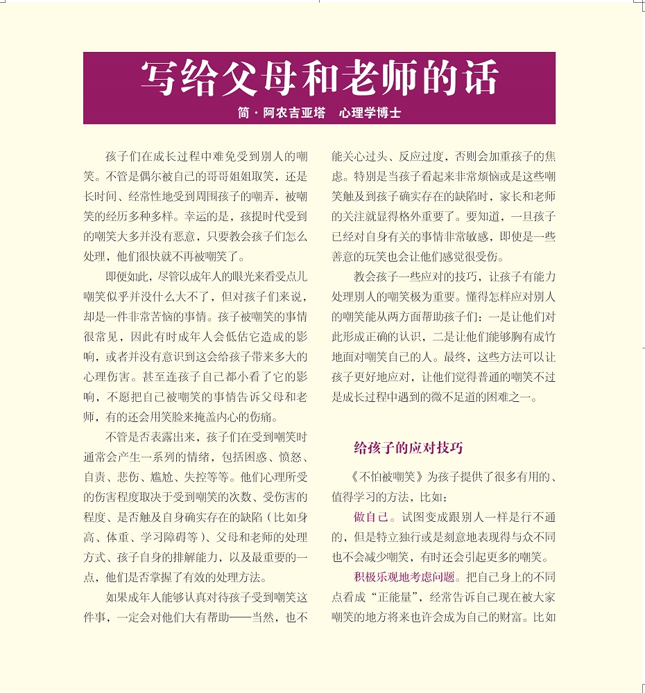 故事结束后,还有美国心理学工作者《写给父母的话》,从儿童心理学角度详细剖析了这些问题背后的原因,帮助父母理解孩子,并为父母帮助孩子提供了实用性和可操作性的策略和建议。