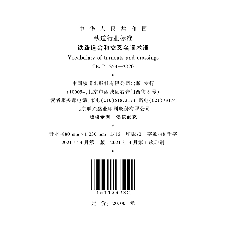 本书是国家铁路局颁布的于2021年7月1日实施的新版标准,本标准规定铁路道岔、交叉名词术语及其定义。