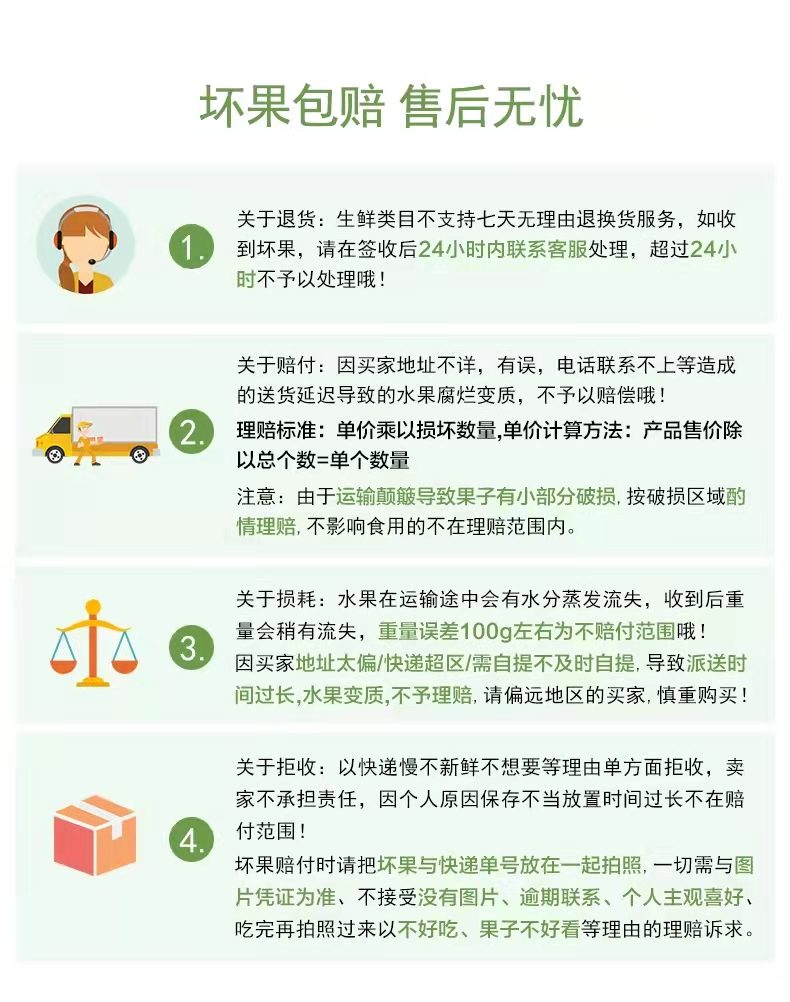 1、生鲜水果不能拒收,一经发货俱不接受更改收件人信息(包括地址、姓名、名、手机号码),售后问题请及时联系客服,烂果、坏果请提供图片为证