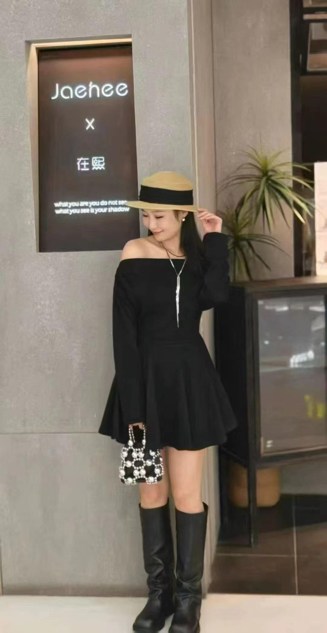 在熙Jaehee女装斜肩收腰连衣裙6618