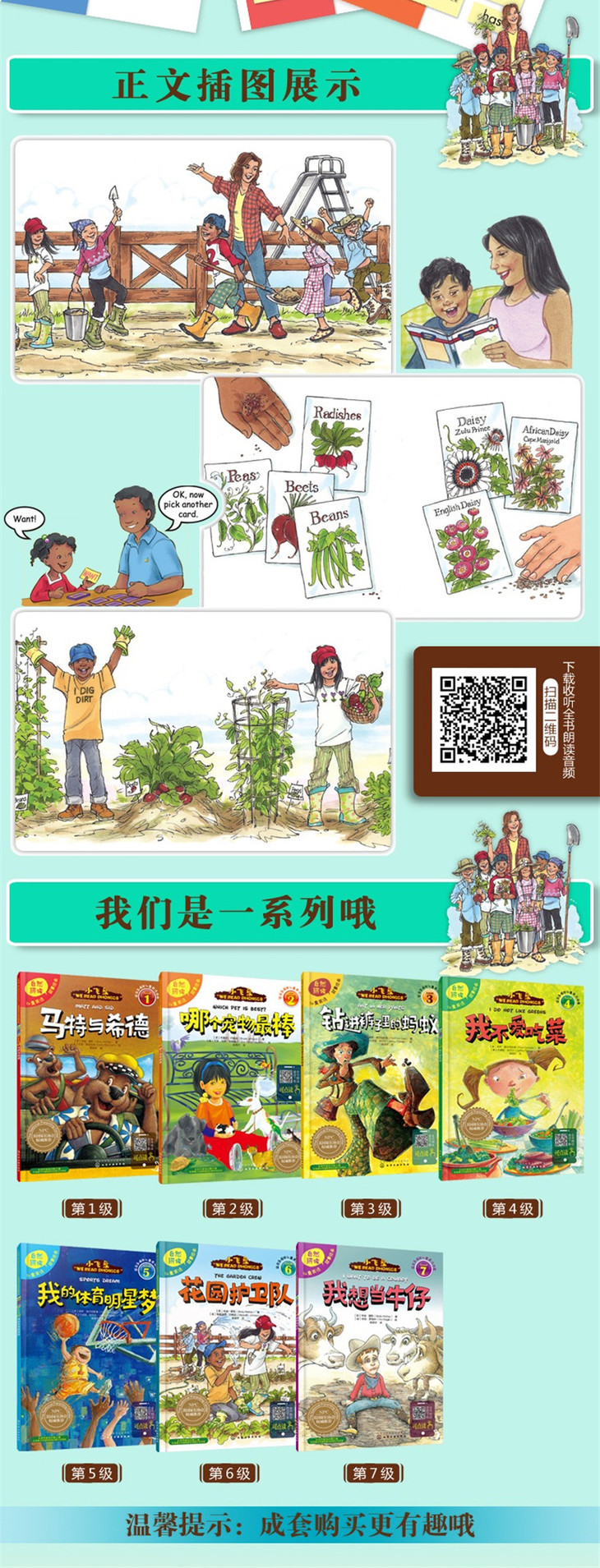1.循序渐进的自然拼读。英语母语儿童必学的自然拼读法,按照难易程度分为7级,由浅入深,将自然拼读规则融入轻松有趣的故事中,故事中使用大量蕴含发音规则的单词,通过多次重复,让孩子更容易接受和掌握自然拼读法,同时提高英文阅读水平。