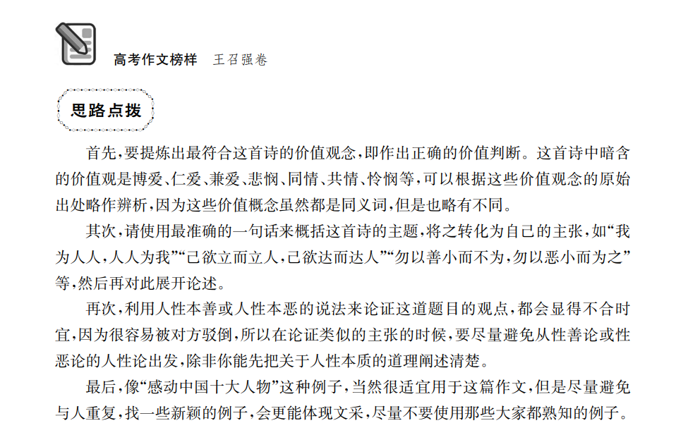 《高考作文榜样 王召强卷》从12个原创议题出发,每讲通过命题意图、思路点拨、学理分析、思维导图、优秀范文等多个版块组合,从审题角度、论点确立、论证步骤、论据资源等方面,系统地指导学生从根本上攻克写作难题。