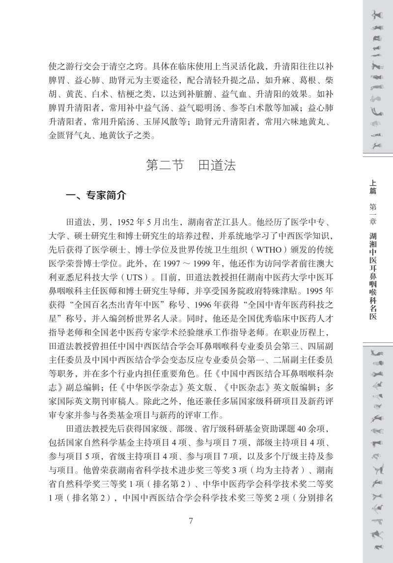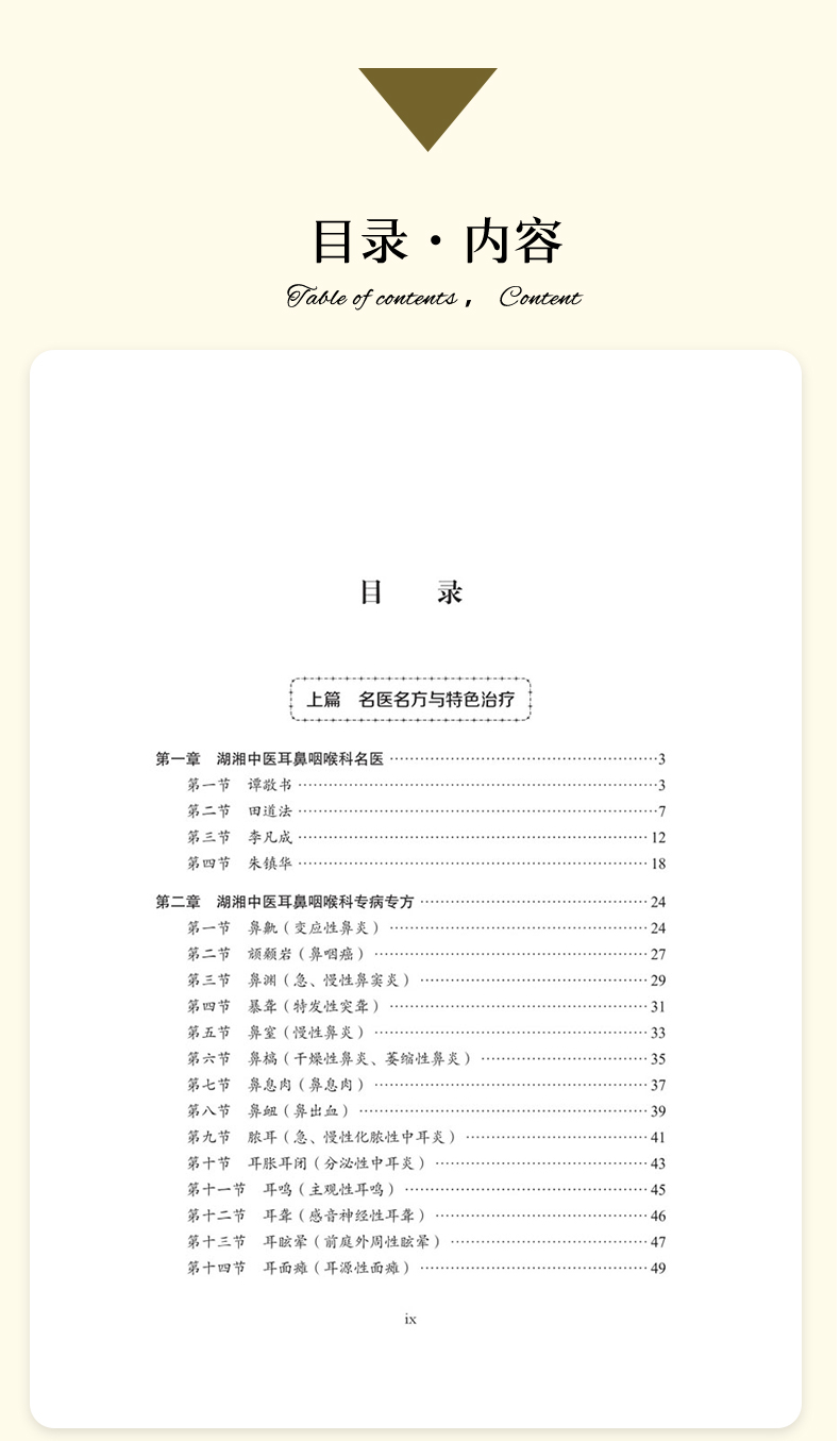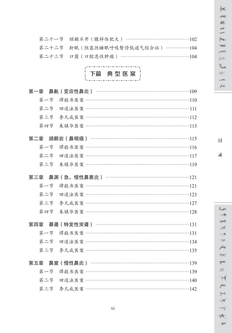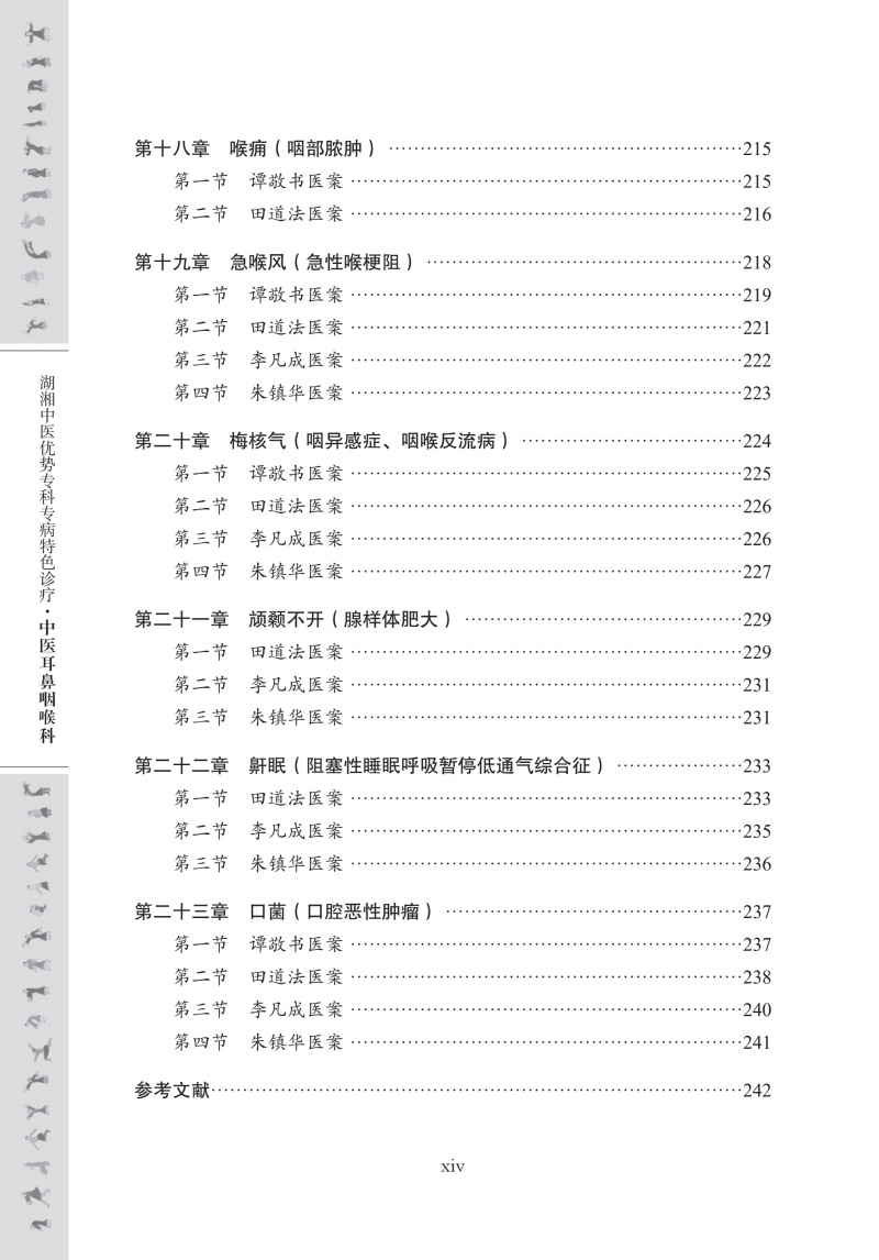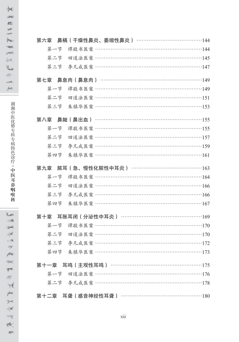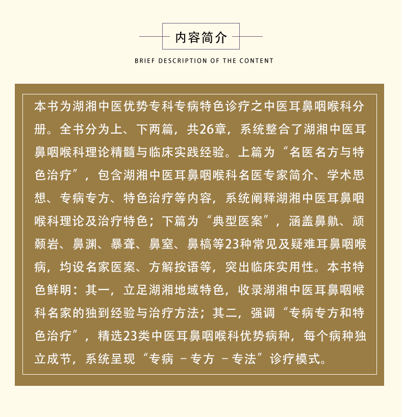 本书为湖湘中医优势专科专病特色诊疗之中医耳鼻咽喉科分册。全书分为上、下两篇,共26章,系统整合了湖湘中医耳鼻咽喉科理论精髓与临床实践经验。上篇为“名医名方与特色治疗”,包含湖湘中医耳鼻咽喉科名医专家简介、学术思想、专病专方、特色治疗等内容,系统阐释湖湘中医耳鼻咽喉科理论及治疗特色;下篇为“典型医案”,涵盖鼻鼽、颃颡岩、鼻渊、暴聋、鼻窒、鼻槁等23种常见及疑难耳鼻咽喉病,均设名家医案、方解按语等,突出临床实用性。本书特色鲜明:其一,立足湖湘地域特色,收录湖湘中医耳鼻咽喉科名家的独到经验与治疗方法;其二,强调“专病专方和特色治疗”,精选23类中医耳鼻咽喉科优势病种,每个病种独立成节,系统呈现“专病 –专方 –专法”诊疗模式。