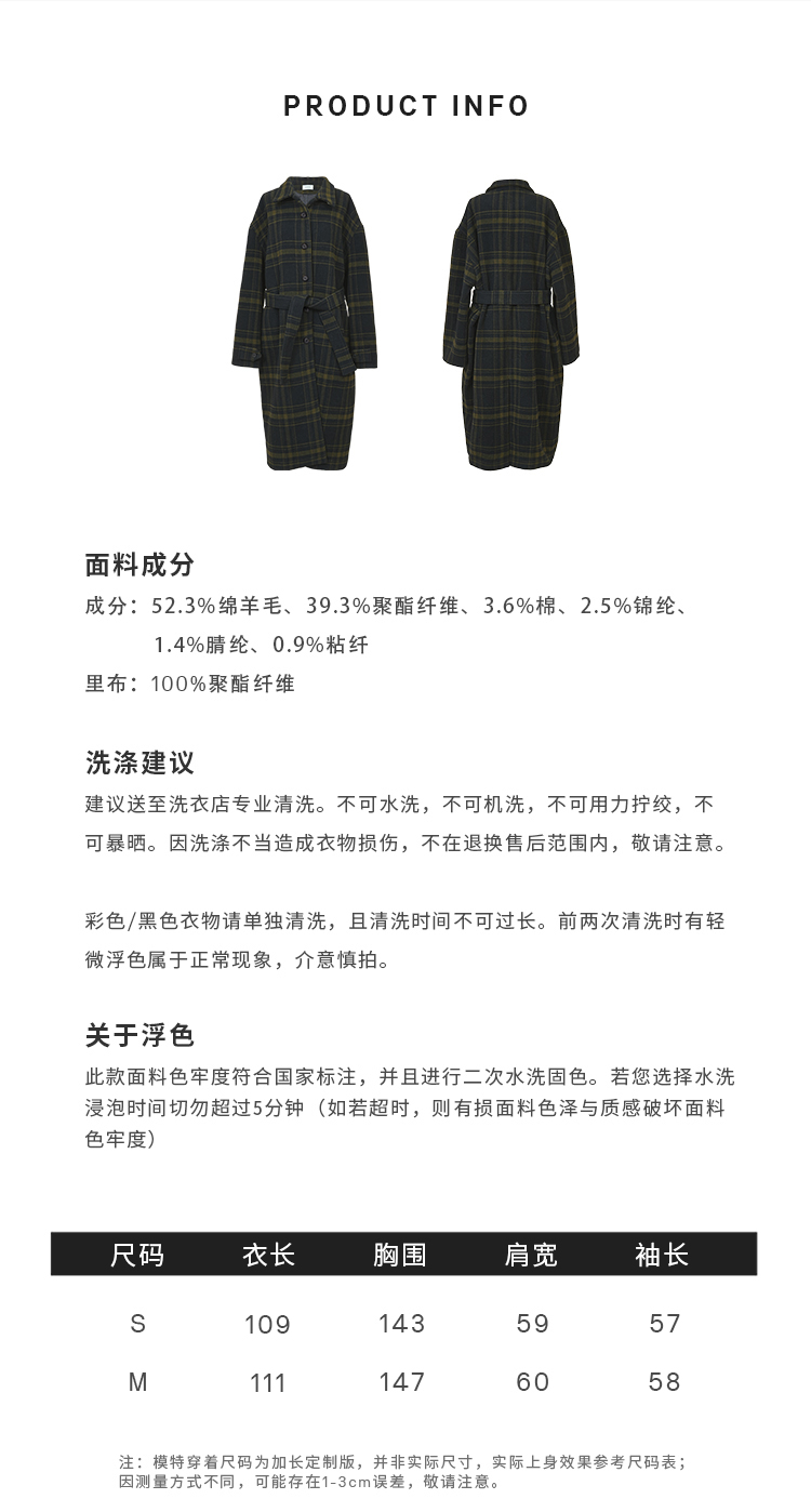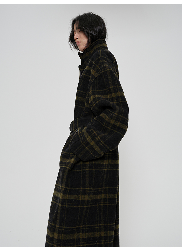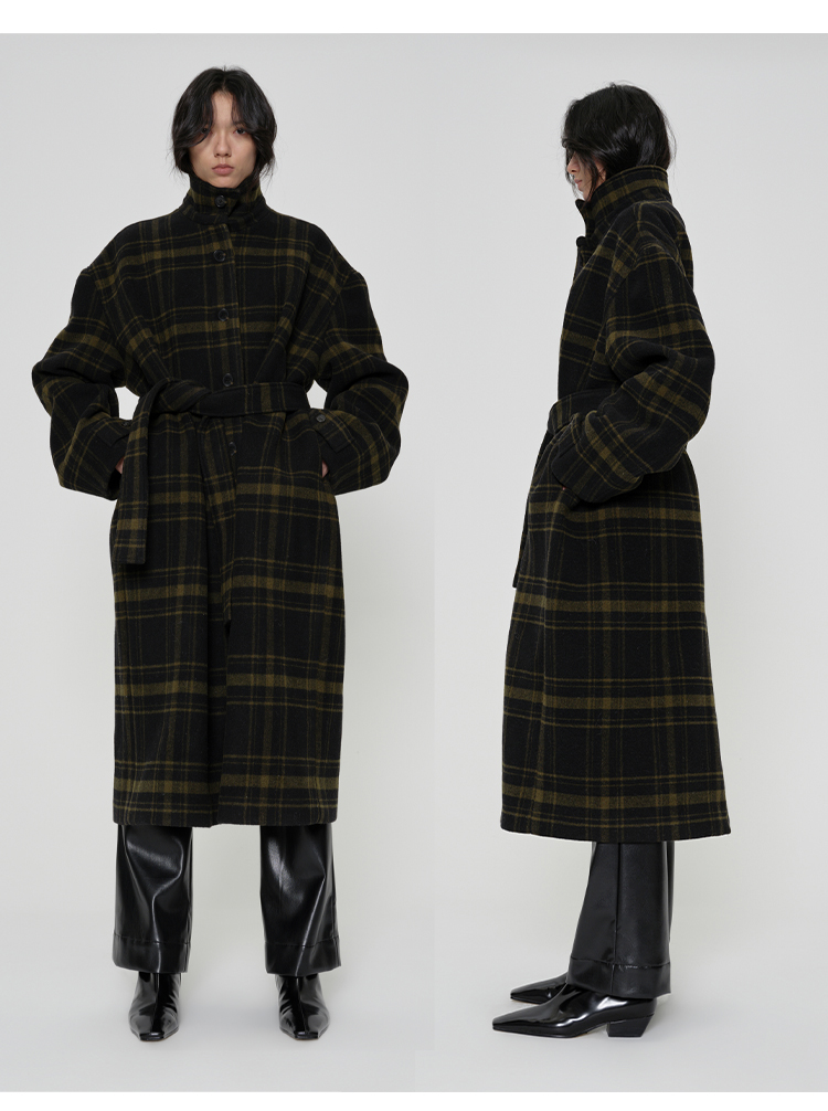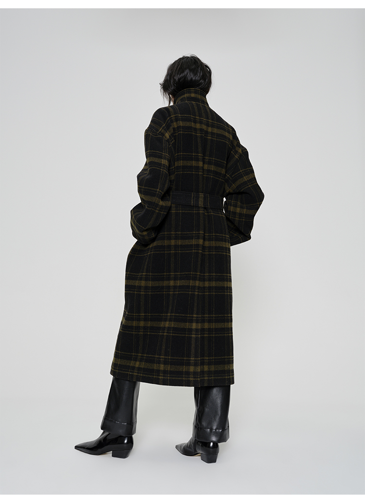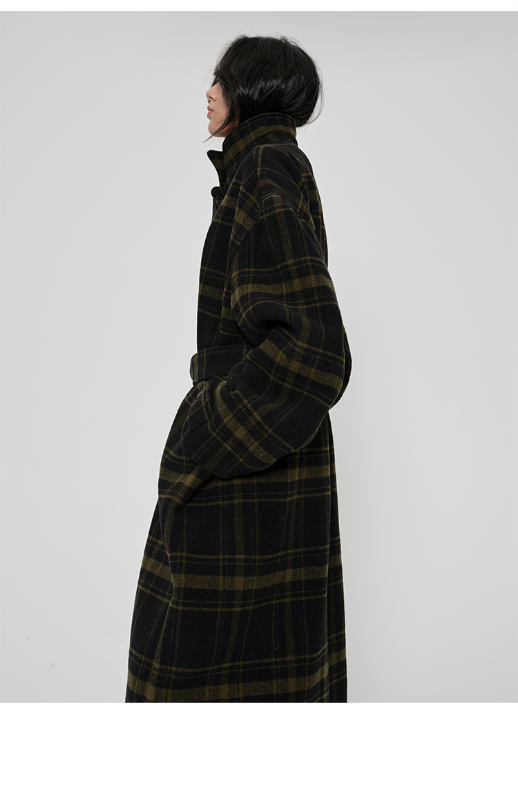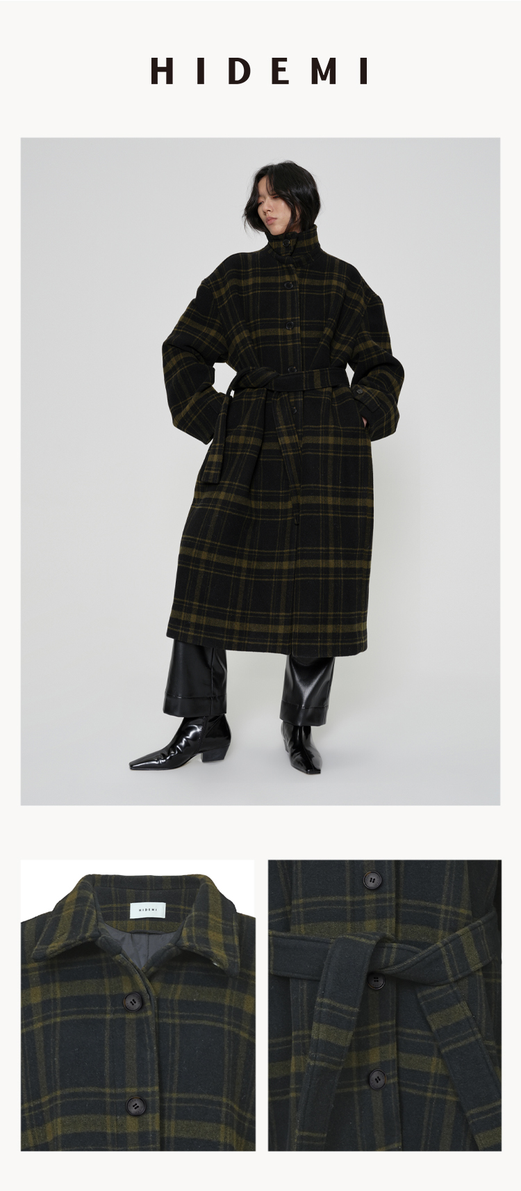 HIDEMI 【赵露思同款】极简大廓形色织格纹羊毛翻领可拆卸腰带式落肩宽松长款厚款大衣