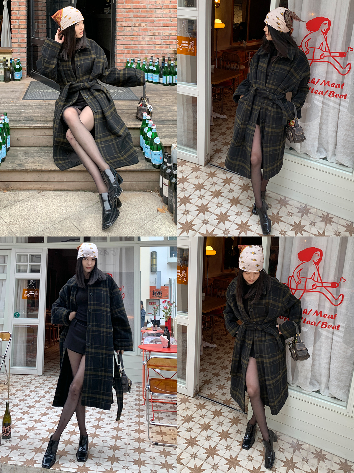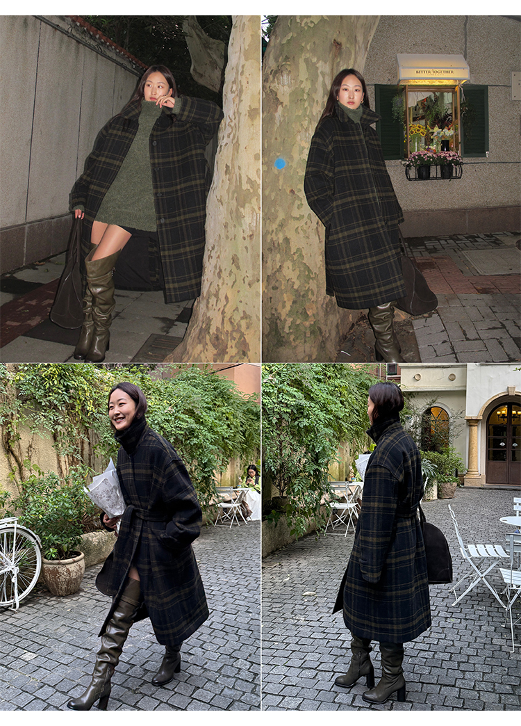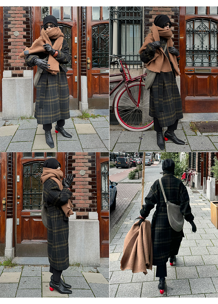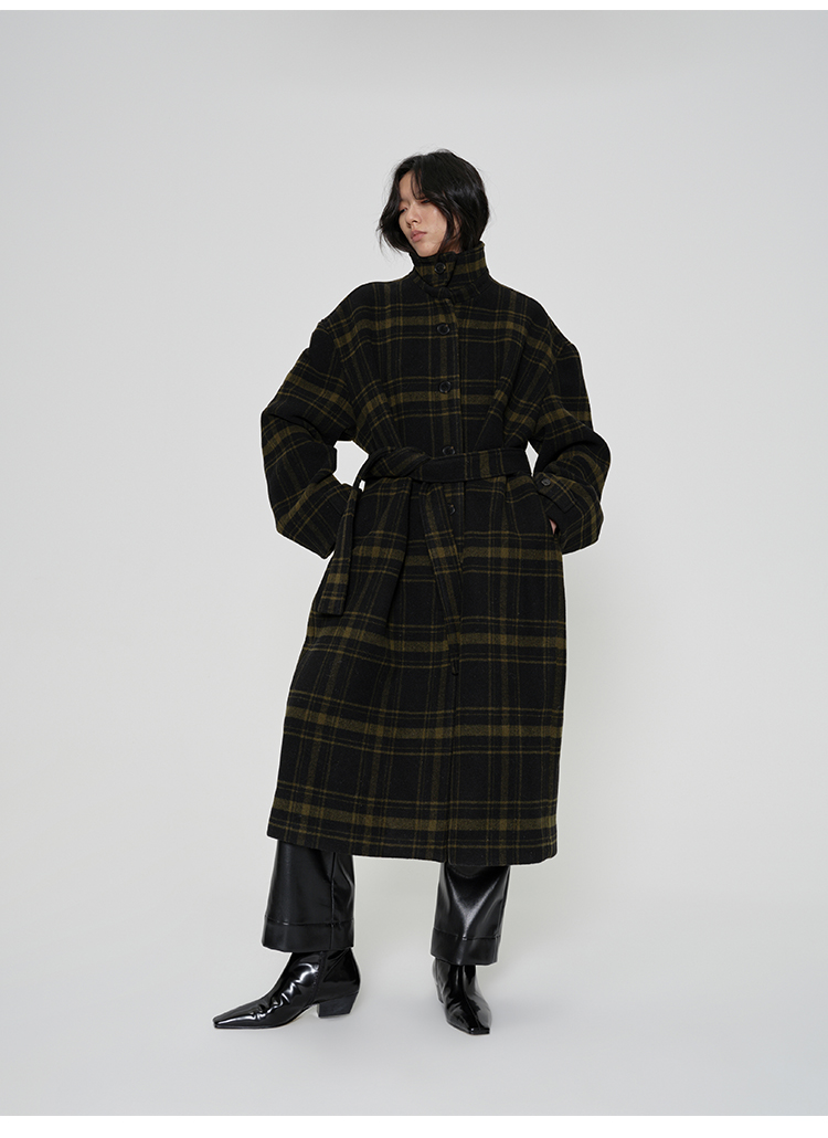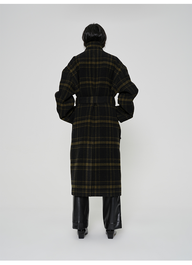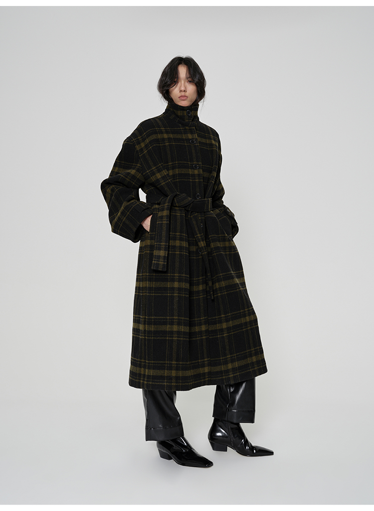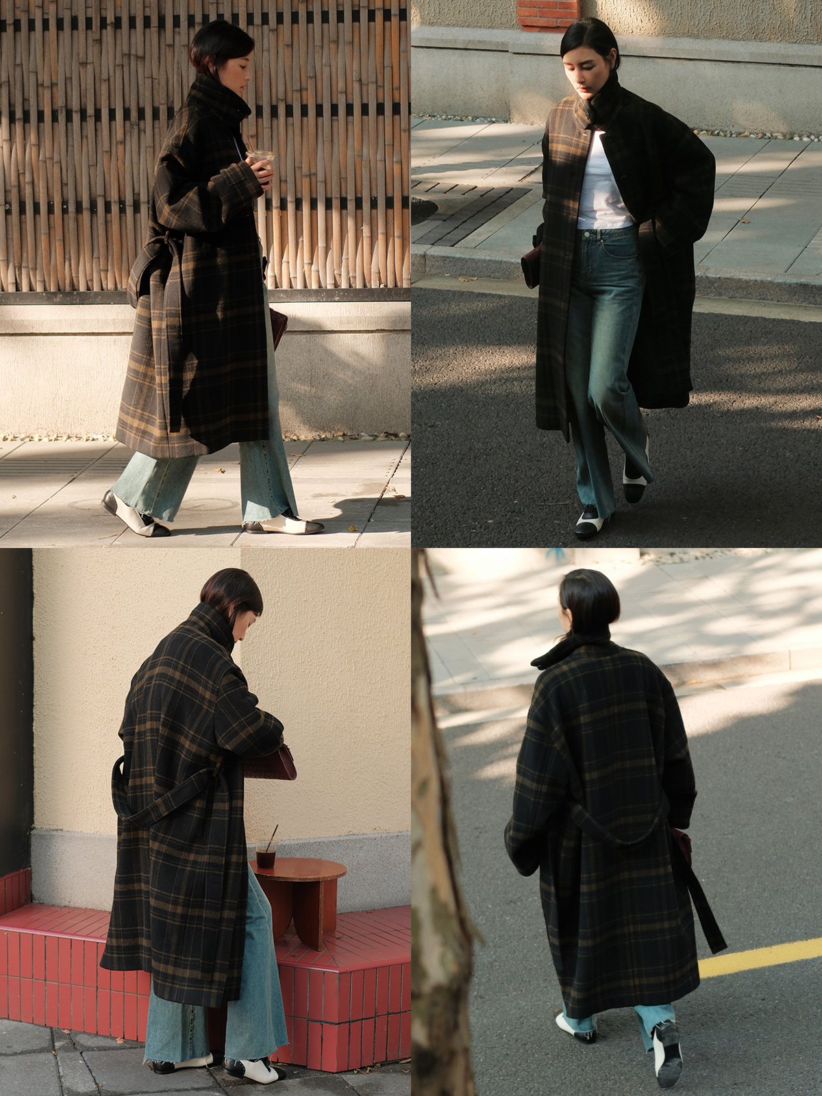 HIDEMI 【赵露思同款】极简大廓形色织格纹羊毛翻领可拆卸腰带式落肩宽松长款厚款大衣