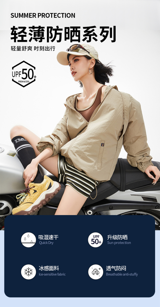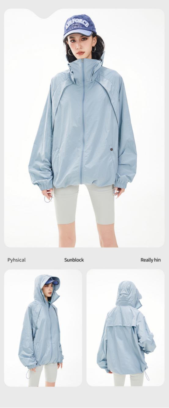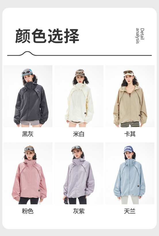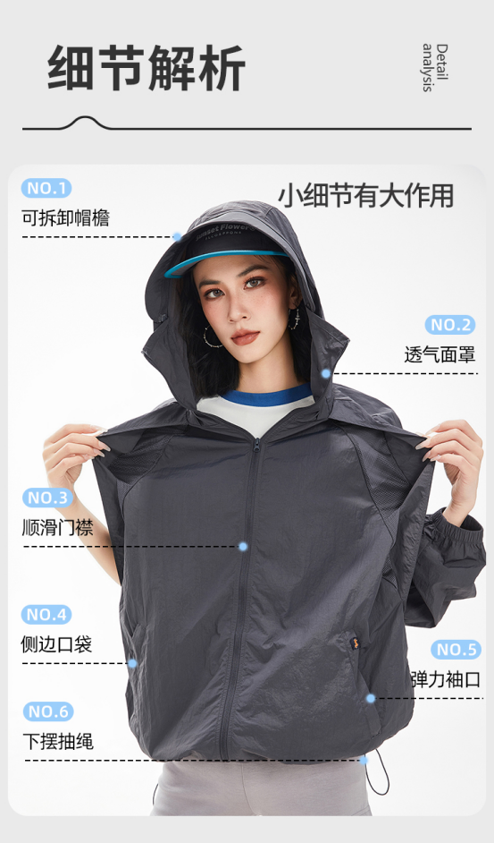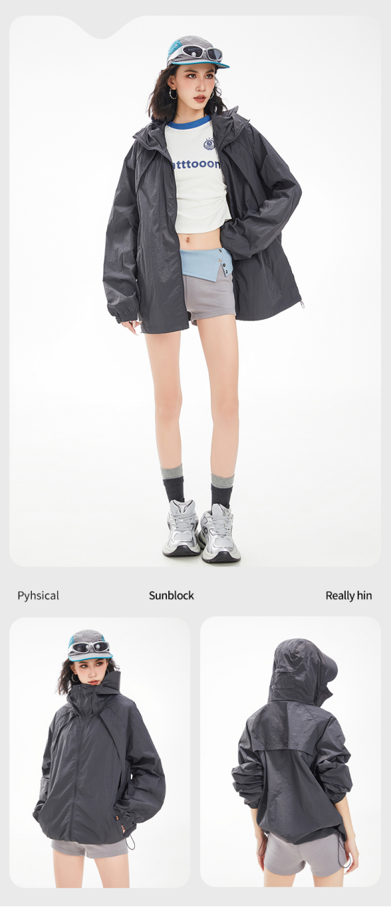 黑灰色,这种酷酷的感觉谁懂啊 不仅防晒,还防风防泼水 超值哇,真的爱了 轻盈透气,在炎热的夏天, 穿上它就像是被微风轻轻包裹,完全没有闷热感。