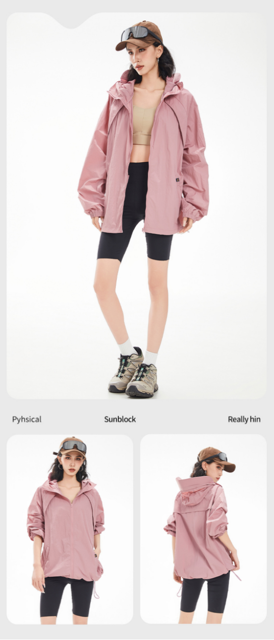 夏天穿真的舒服到想焊在身上! 可爱粉色太显白啦!!!太好看啦!!!无敌实用的一件防晒衣!! 夏天穿嘎嘎舒服,365°无死角全方位防晒! 宽松H版型很遮肉 !衣服细节也很好 包边处理得很干净