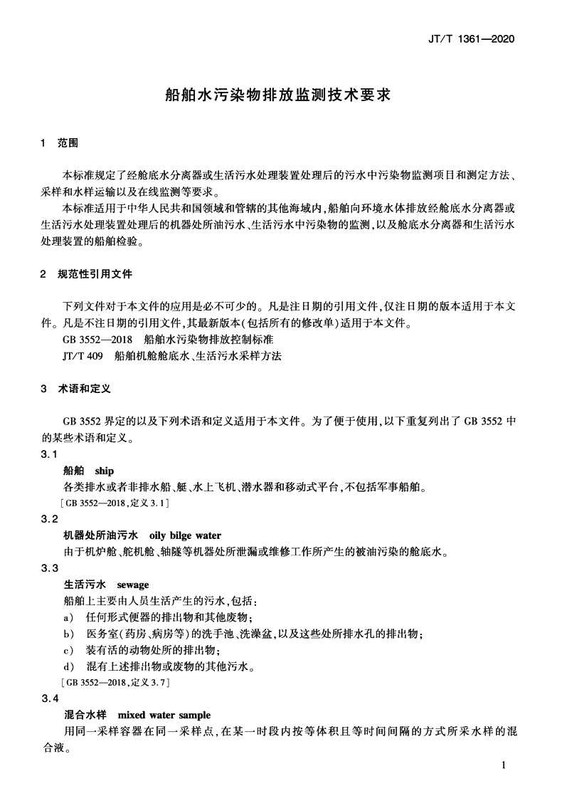 船舶水污染物排放监测技术要求 (JT/T 1361—2020)