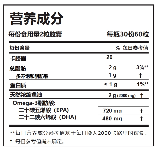 作为膳食补充剂,每天随食物服用2粒。本软胶囊中使用的鱼油浓缩液是在严格的质量控制标准下生产的。经测试,它不含多氯联苯、二恶英、汞和其他重金属等潜在有害污染物。
