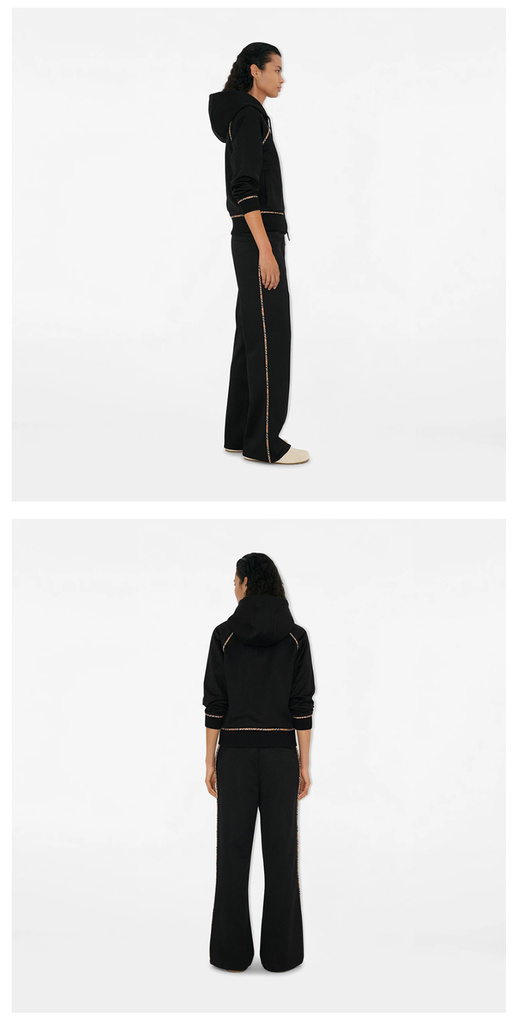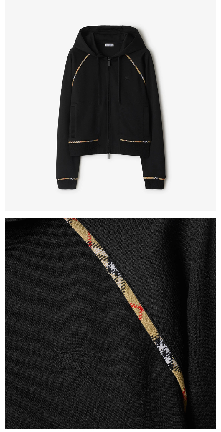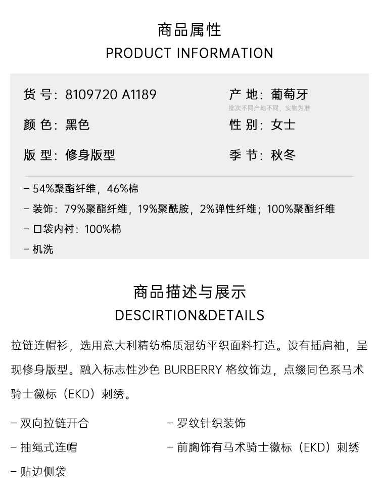 BURBERRY 巴宝莉 女士马术骑士徽标刺绣格纹装饰棉质混纺拉链连帽外套 黑色 8109720 A1189