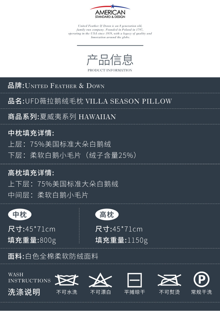 UFD美国羽绒枕白鹅绒枕五星级酒店枕头护颈枕颈椎枕鹅绒枕单人