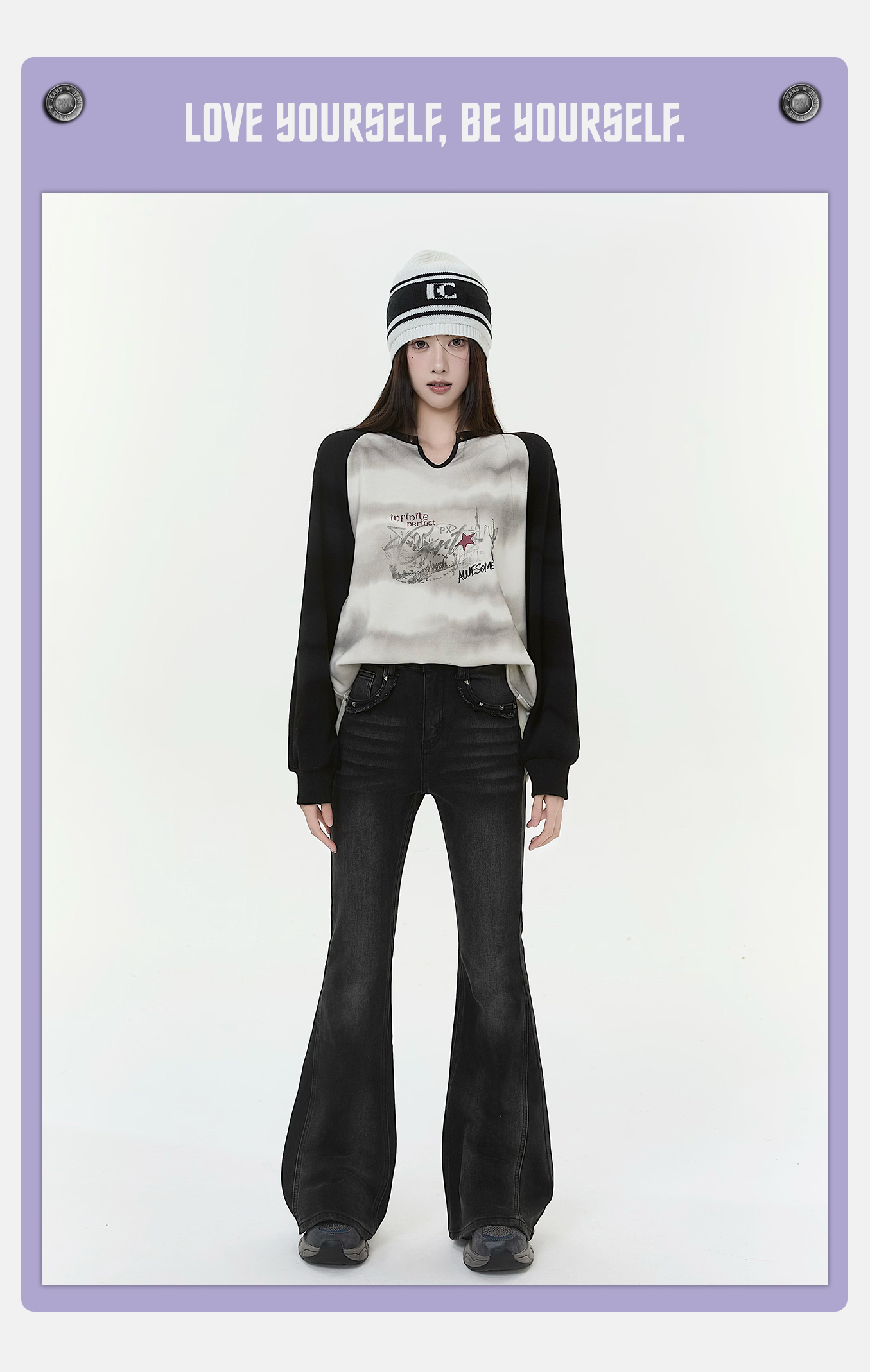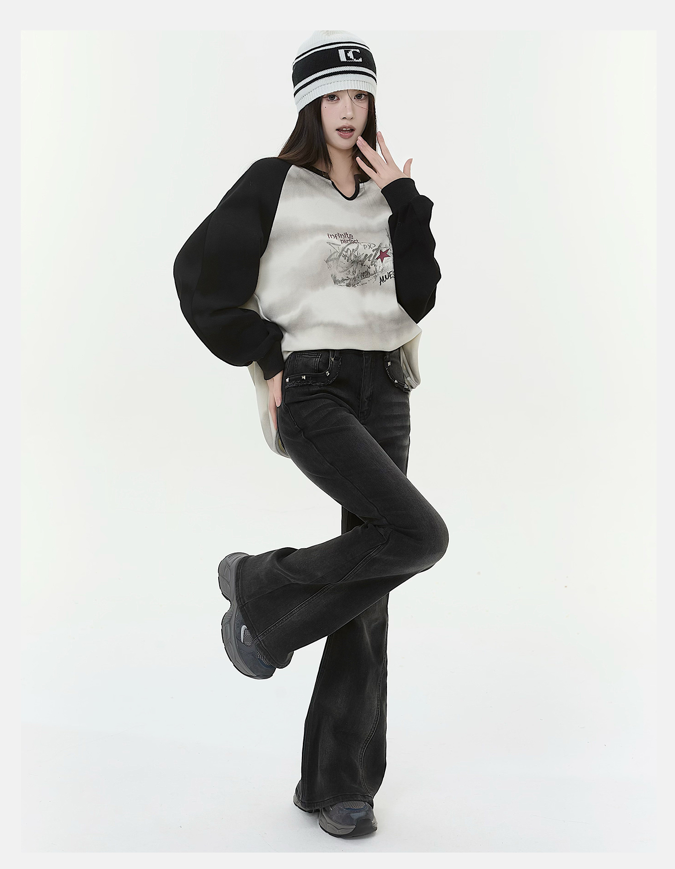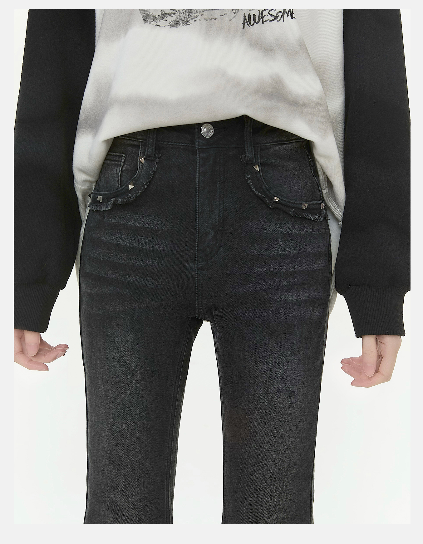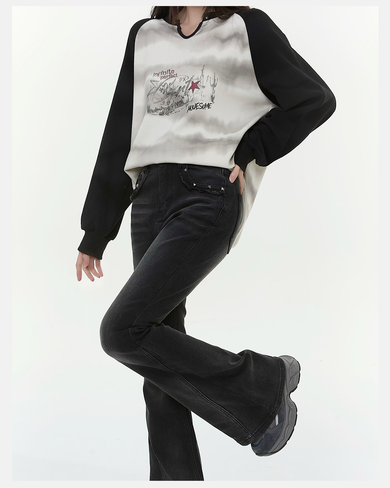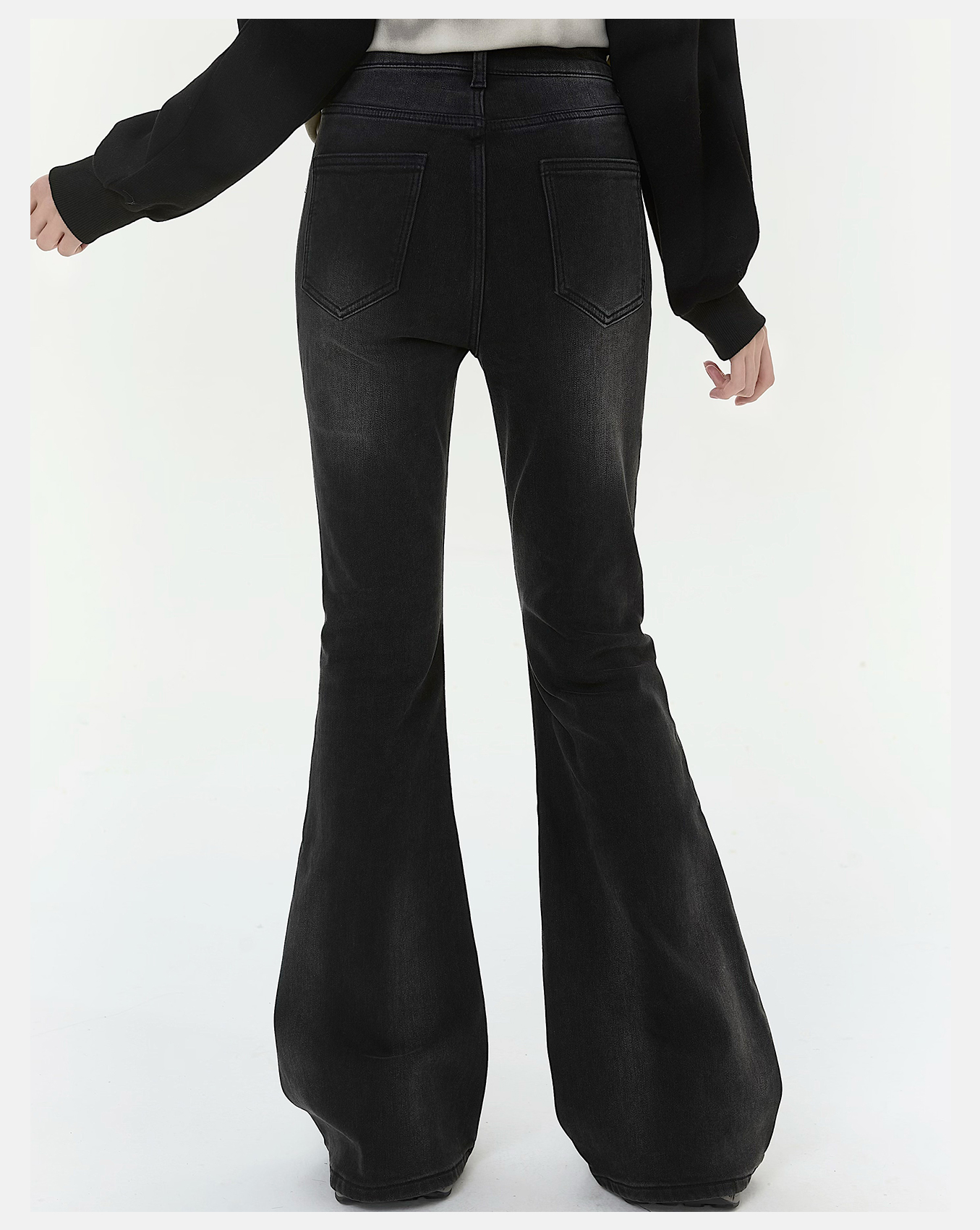 P&X设计师女装2025冬季时尚紧身微喇叭裤牛仔长裤825410167 黑色