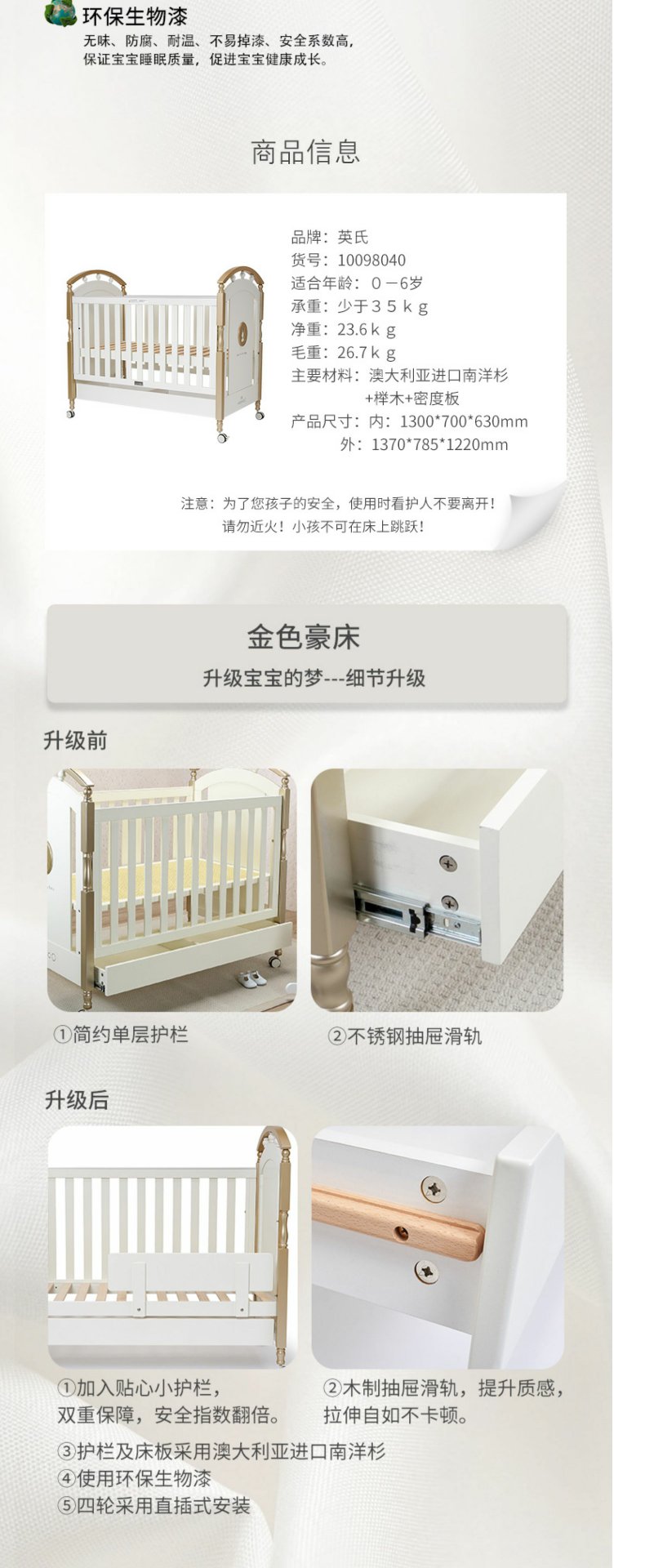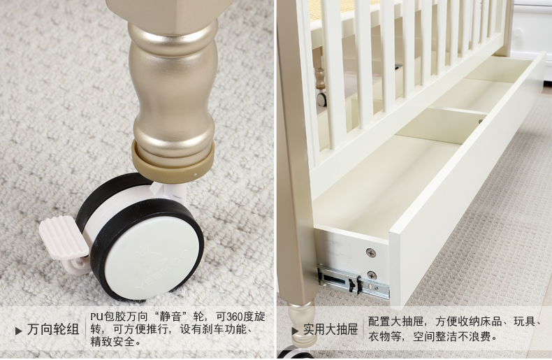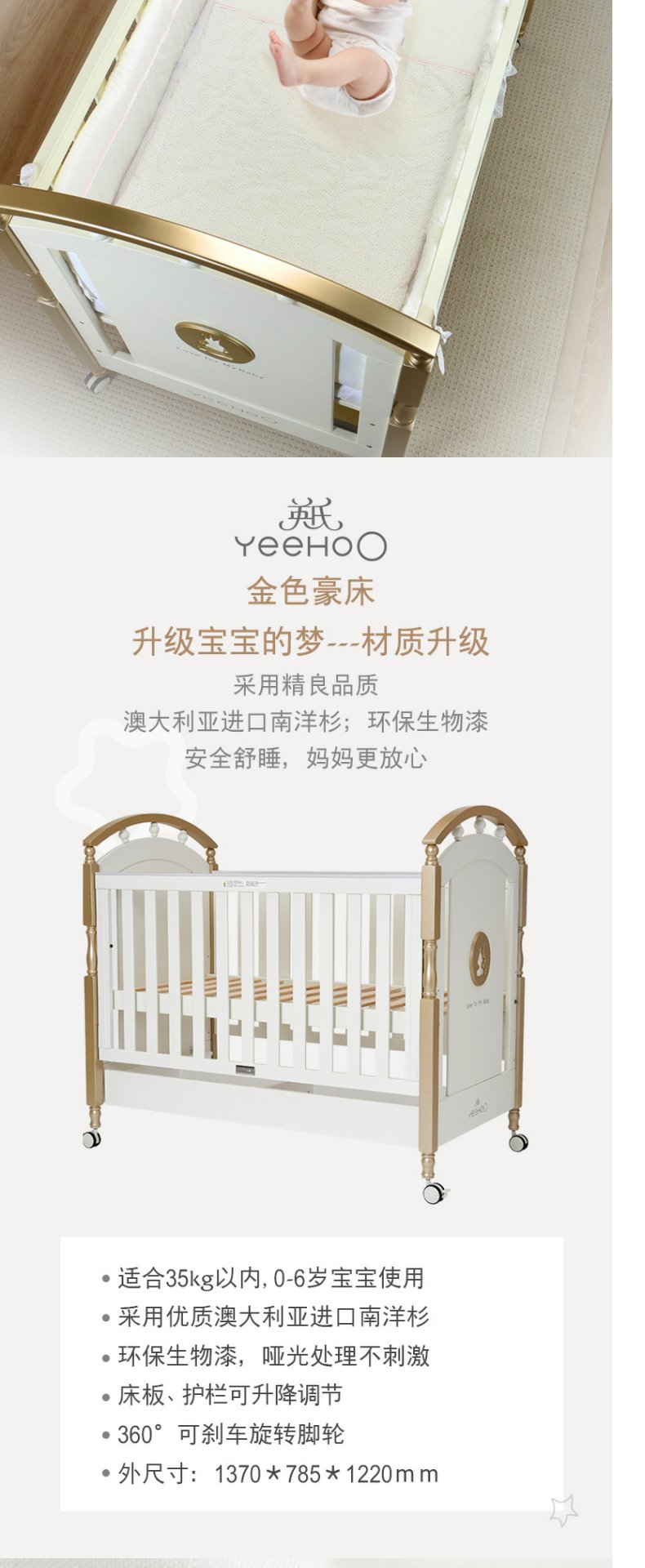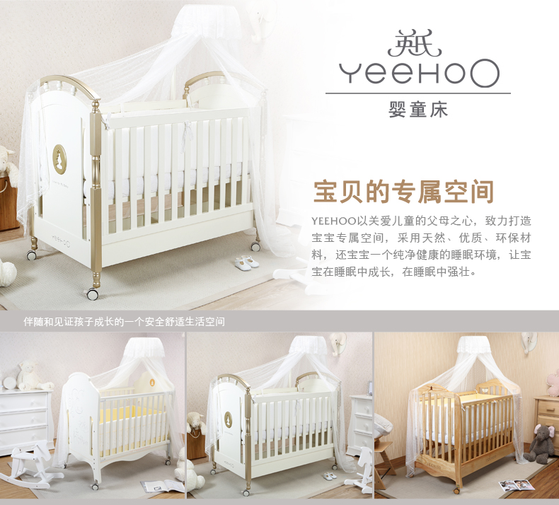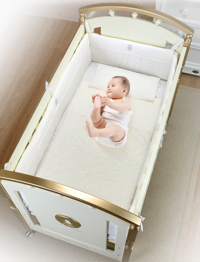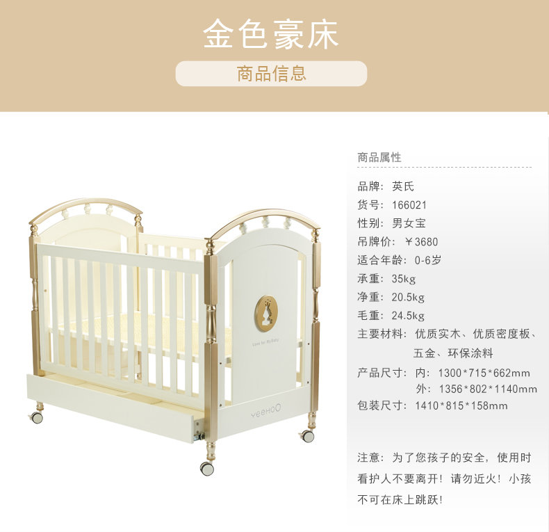 英氏金色豪床10098040欧式田园风婴儿床实木框架童床宝宝床0-6岁YBCMJ00006A