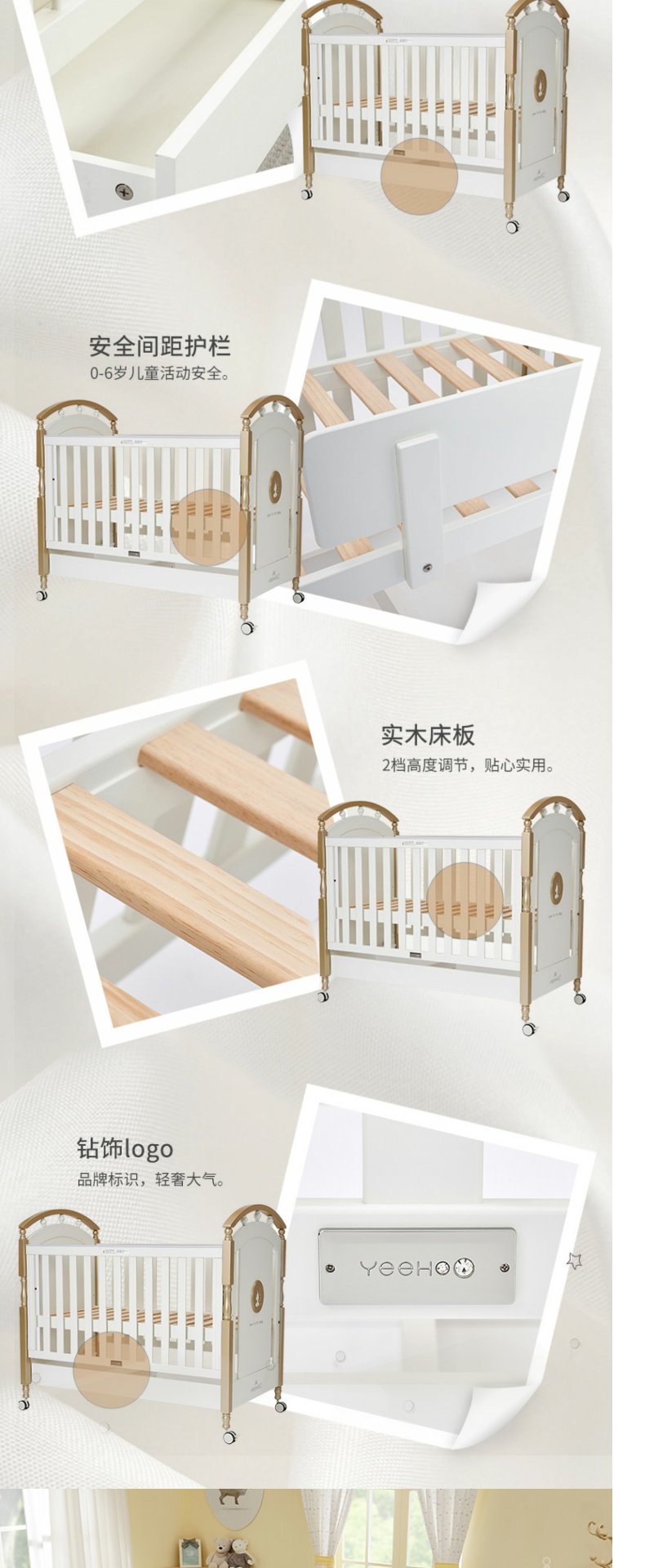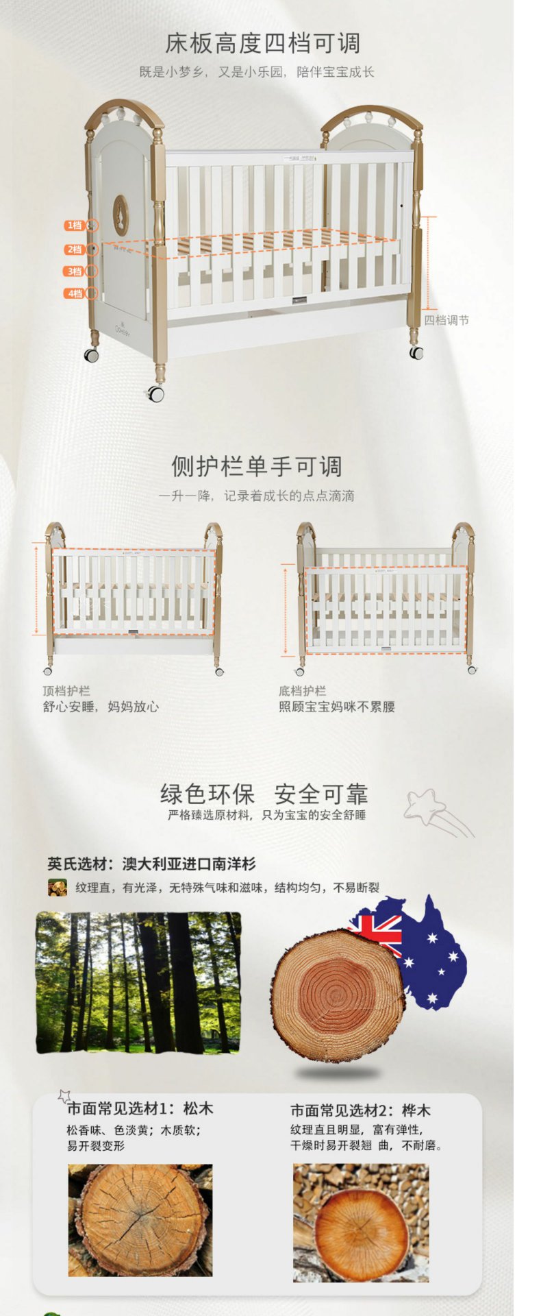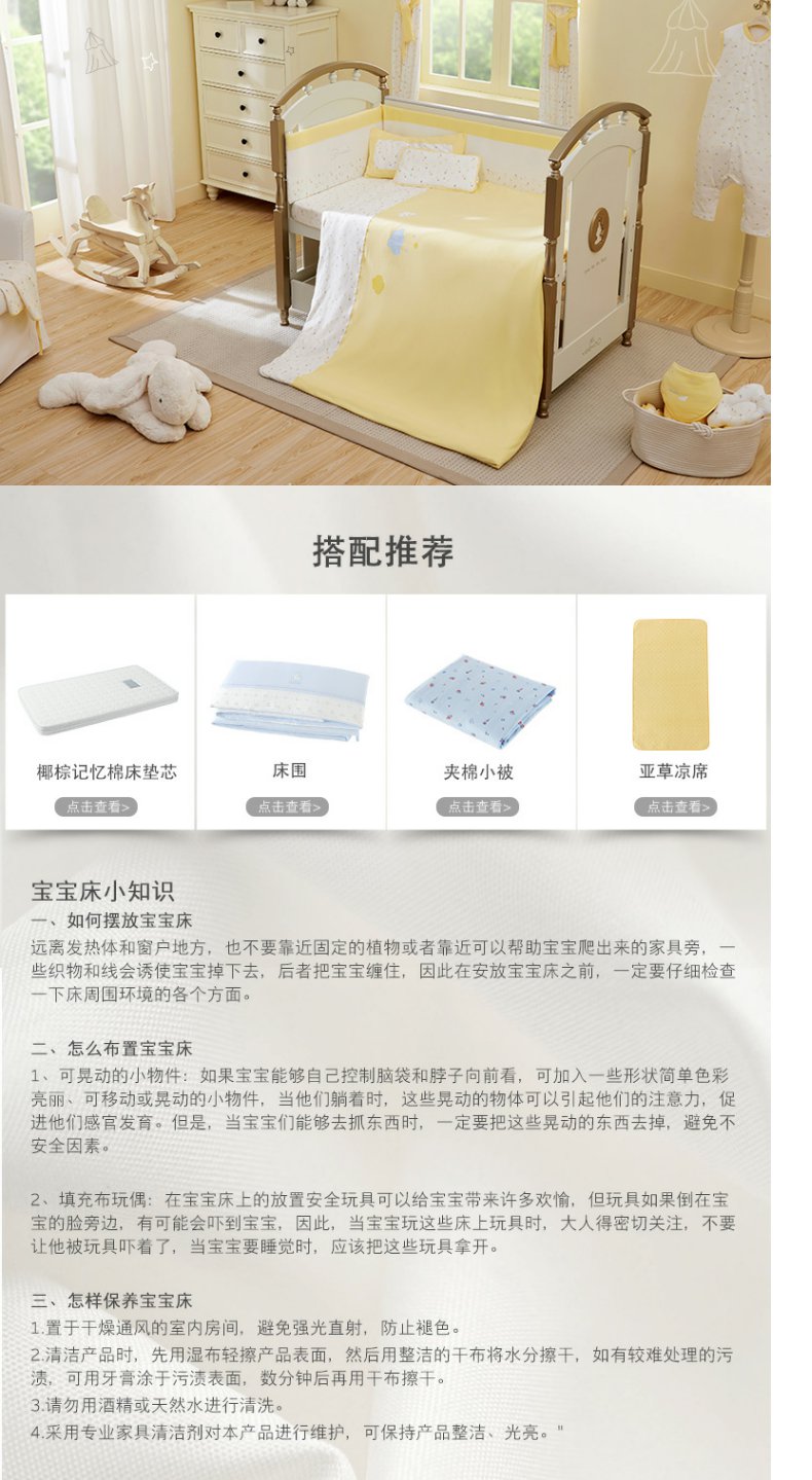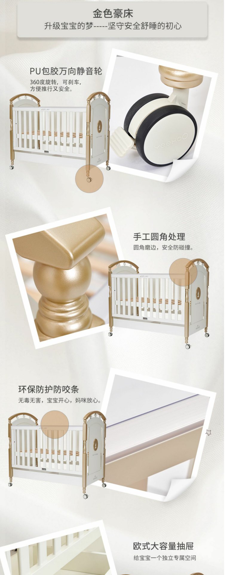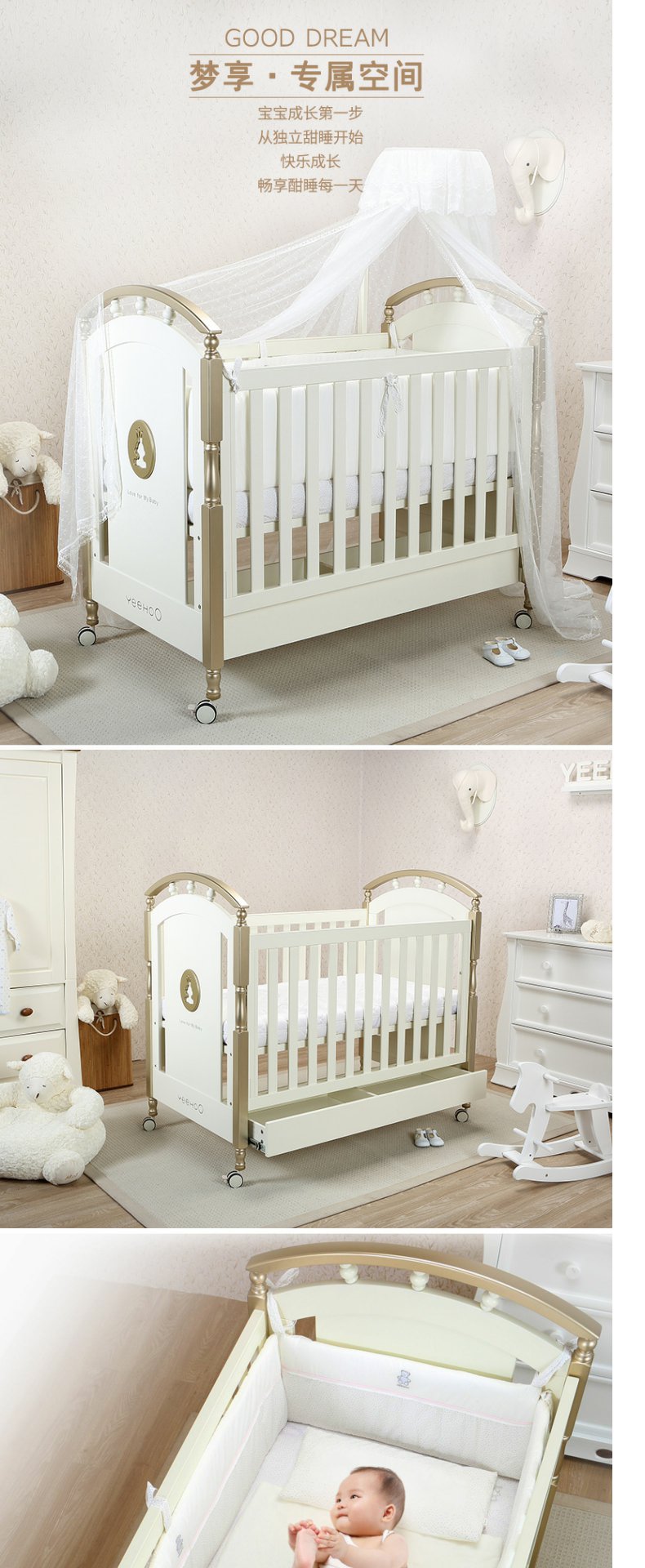 英氏金色豪床10098040欧式田园风婴儿床实木框架童床宝宝床0-6岁YBCMJ00006A