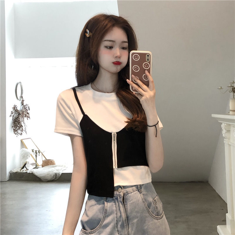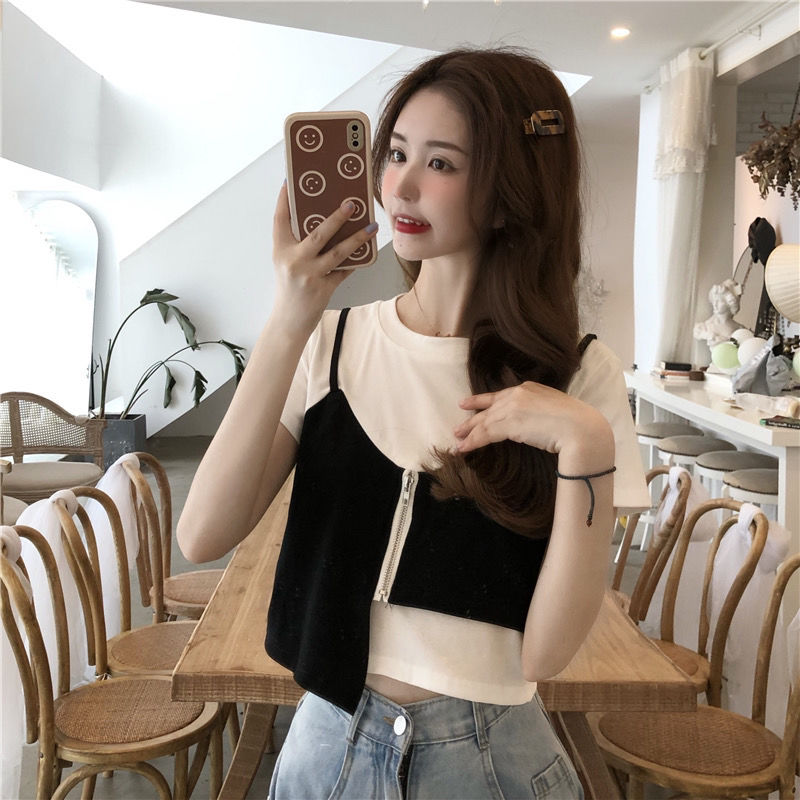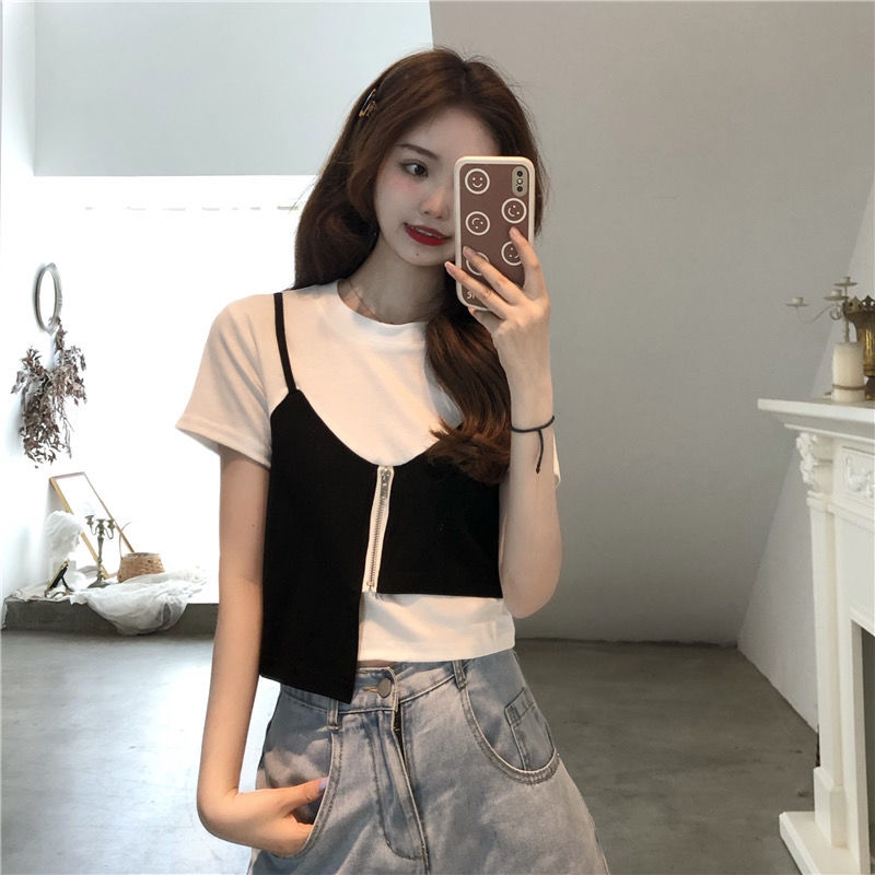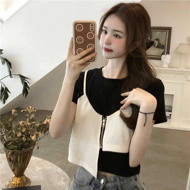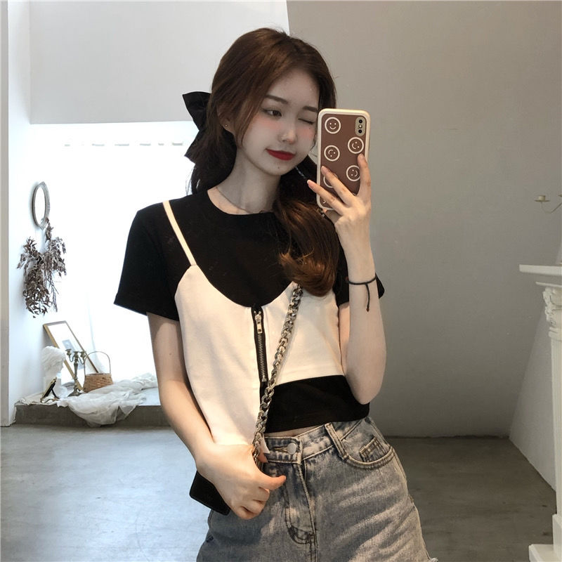 黛唯梵韩风chic上衣夏女装2022新款ins潮韩版显瘦假两件吊带拼接短款T恤国庆清明出游